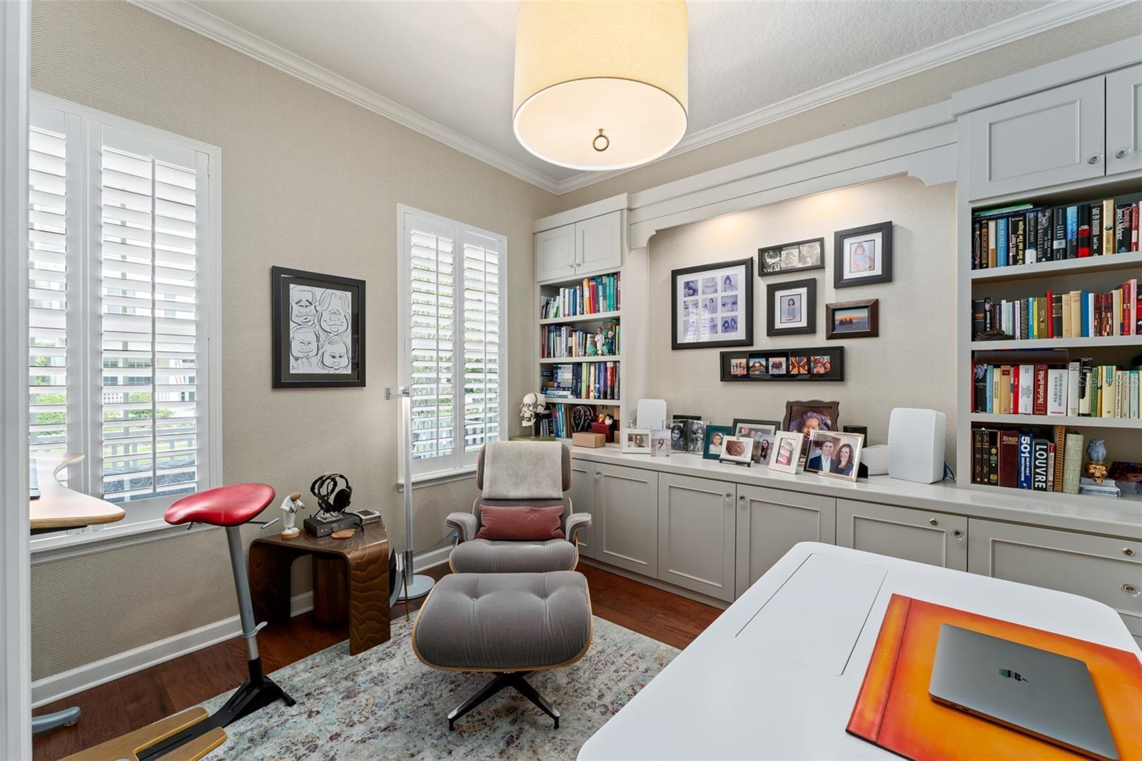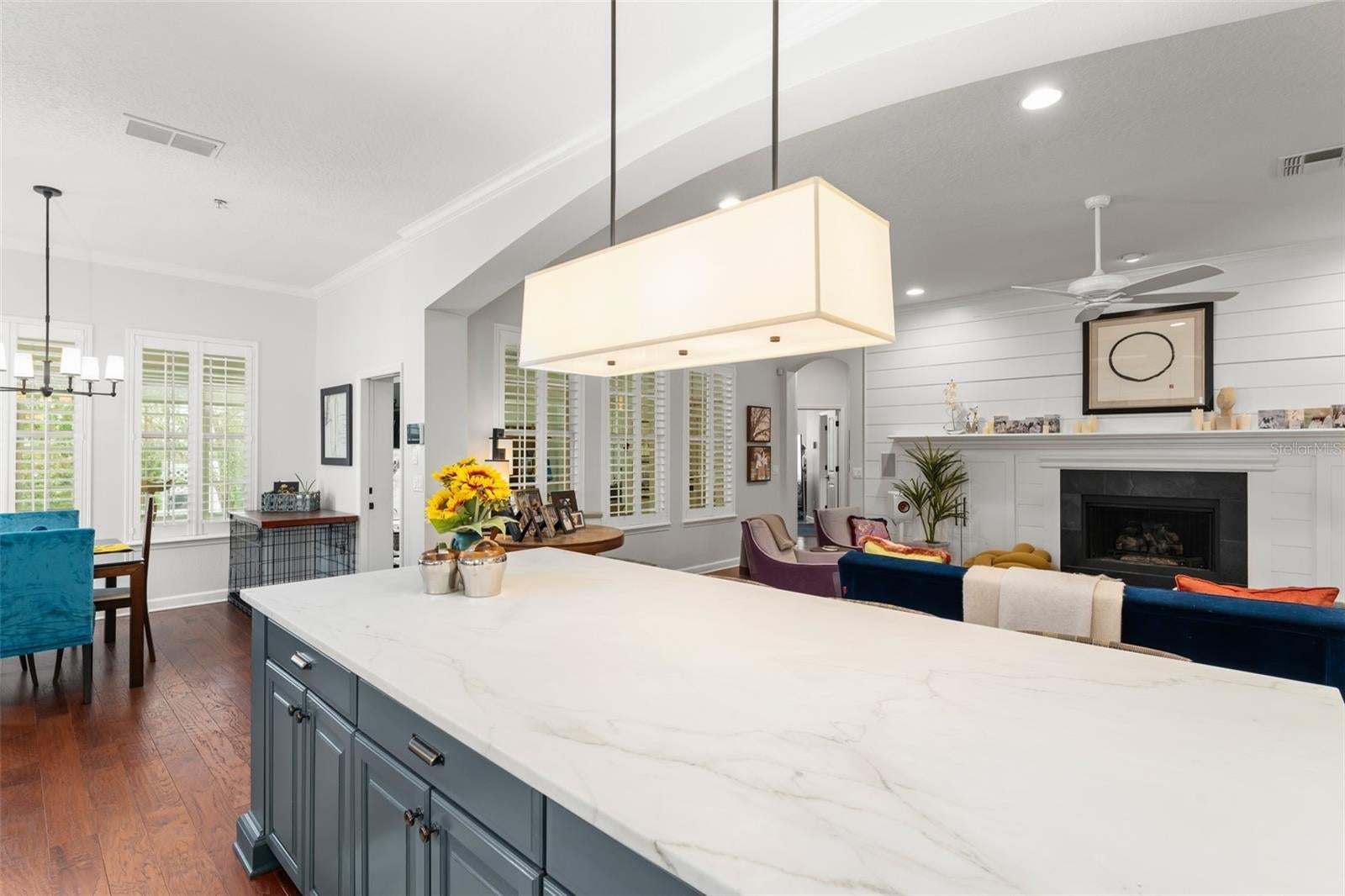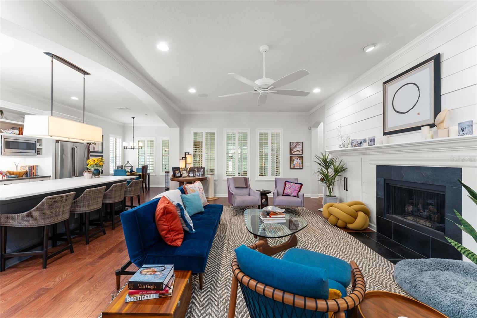 - Built-in Features, Ceiling Fans(s), Crown Molding, Kitchen/Family Room Combo, Open Floorplan, Primary Bedroom Main Floor, Stone Counters, Walk-In Closet(s), Window Treatments