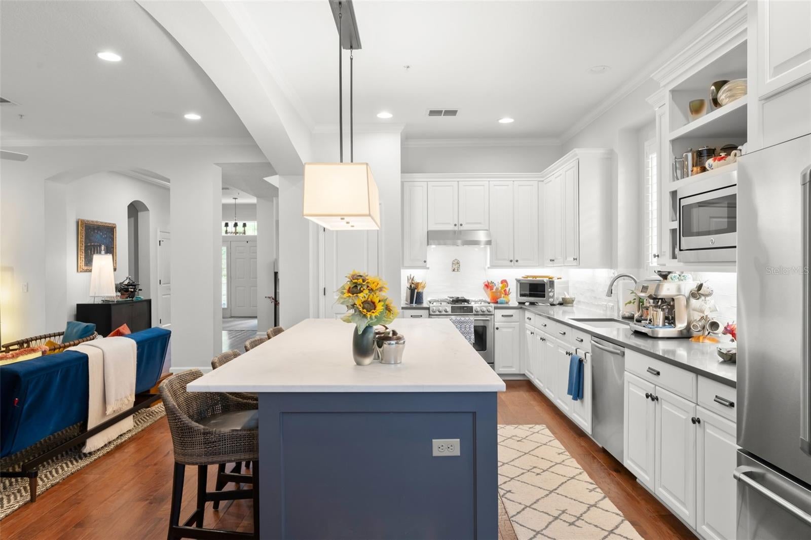 Great value and price per square foot in Baldwin Park! Motivated Seller! This charming and chic updated four bedroom, three and a half bathroom home plus office is located in the highly sought-after first section of Baldwin Park. Significant improvements by custom builder Goehring and Morgan include a gorgeous year-round sunroom flooded with natural light and peaceful views, complete with wet bar. This dramatic expansion has increased the living area to over 3800 sq ft. The kitchen and heart of the home has been upgraded to feature gas range and is adorned with quartz countertops, hand-made tile backsplash and a contrasting island topped with Carrara marble. The open concept floor plan connects the main family room seamlessly to offer inviting gathering spaces and features a gas fireplace framed by a shiplap wall and new hearth, giving it a fresh modern, yet cozy feel. Finishes include crown molding, wood floors, plantation shutters, and new solid wood interior doors and hardware as well as lighted custom cabinetry and built-in bookshelves in the study and master bedroom. The spa-like master bathroom features an enlarged shower, new tile, new lighting, and added cabinetry. The main house is all one-story, and the guest wing of the house offers a private sitting area/den connecting the 2 secondary bedrooms. All closets have been finished with custom organzing systems. The attached garage apartment is a spacious guest retreat with remodeled bathroom, new wood floors, quartz countertops, and custom window treatments. The backyard has been transformed into a tranquil Japanese style rock garden with mature landscaping, lighting, and direct propane connection. Major system upgrades consist of HVAC, tankless water heater, secondary electrical panel, air-conditioned garage with an abundance of storage and car lift, new roof (2025), renovated bathrooms, kitchen, landscaping refresh, double pane windows, and custom window treatments. The premier location in the community offers an easy walk to village center restaurants, shops, parks, and pools, and also ideally situated with easy access to Winter Park, Downtown Orlando and Audubon Park.This is a one of a kind Baldwin Park home in immaculate, move-in ready condition. See photos for floor plan. Make your appointment to view today!
