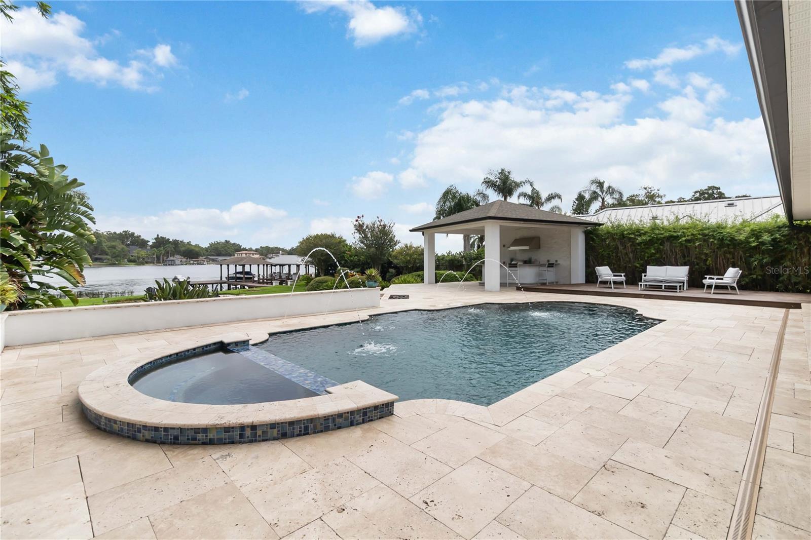 PRICE IMPROVEMENT. Enjoy spectacular lake views on the beautiful Belle Isle CONWAY CHAIN OF LAKES. This exceptional home includes a gorgeous custom pool with fountains & HOT TUB overlooking the pristine spring fed lake chain & the historic Belle Isle bridge! This home was built for OUTDOOR ENTERTAINING, There's a view of downtown Orlando rooftops, airplanes traveling from MCO airport, as well as Space Coast rocket launches. This property has 4 BEDROOMS, 3.5 bathrooms, an open living room & a DEN/THEATER, nearly 2,500 sqft of outdoor living space, & the stunning 1,800 acre lake chain! Watch otters, fish, cranes, and gorgeous sunrises & sunsets! These wonderful lakes are swimming, fishing, boating, JetSki/ water skiing, kayaking and paddle boarding friendly, and the four lakes are all connected by canals navigable by boat. This waterside neighborhood is abundant with lush landscape, custom homes, & NO HOA! Close to downtown Orlando, Winter Park, Lake Nona, the Mall at Millenia, the Florida Mall, Disney, and Universal Studios theme parks and more! This home has imported Turkish travertine flooring inside & out, quartz countertops & backsplash, special custom built wood cabinets & den feature wall, custom pinch pleat curtains, a large lanai with skylights, a SUMMER KITCHEN and bar, an app controlled pool with color changing lights, laminar jets, and a hot tub/ jacuzzi canopied by tropical bamboo! There are 3 gas fireplaces to enjoy, one inside the home & two in the patio area. The summer kitchen has remote color changing lights, a gas grille, sink, refrigerator + ice maker, and the bar countertop gas fireplace. You have your own wood built DOCK with BOATHOUSE & boat + jet ski lifts, and a private white sand beach to enjoy special moments with your family & friends in this entertainers & nature lovers dream!