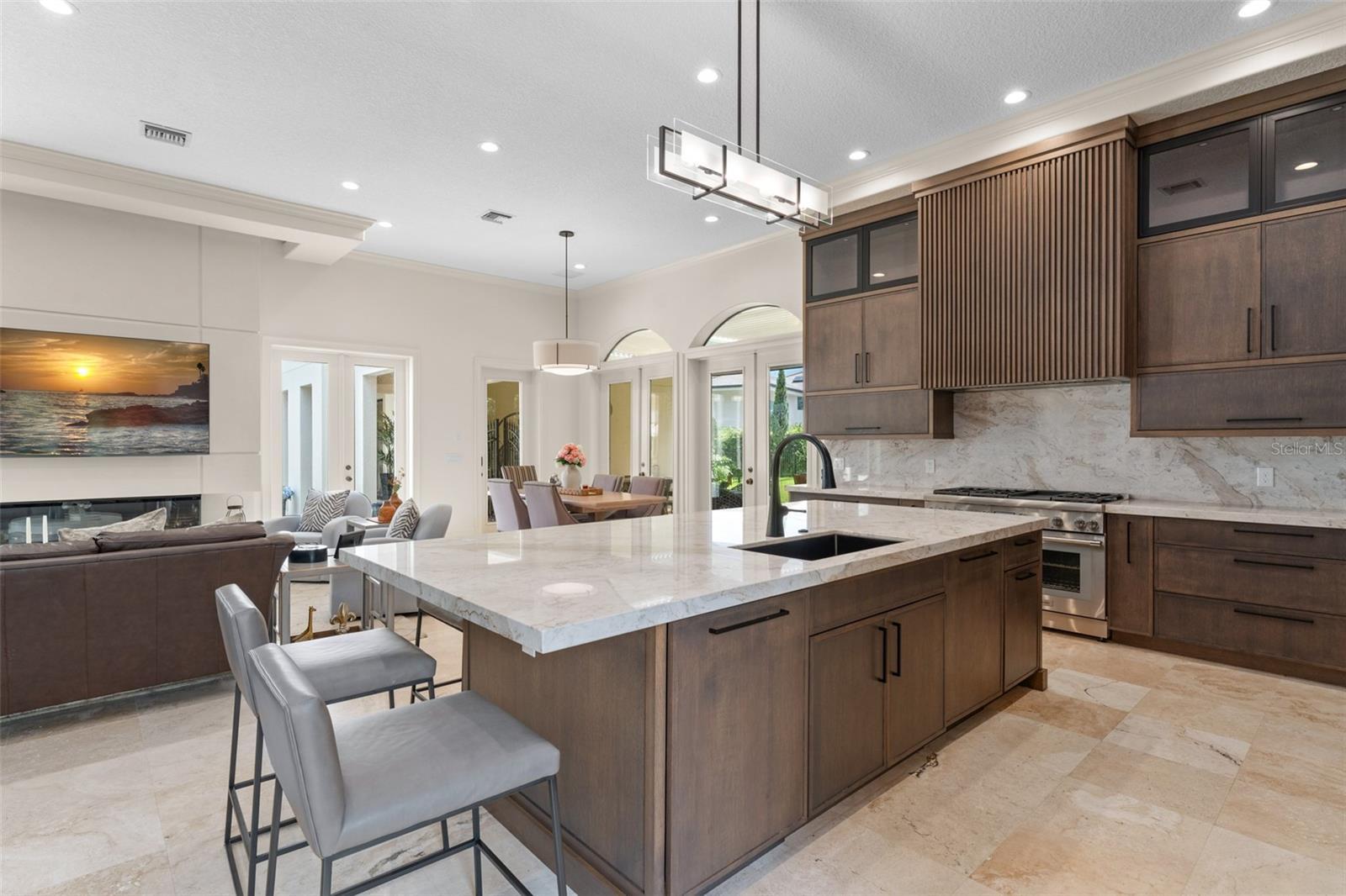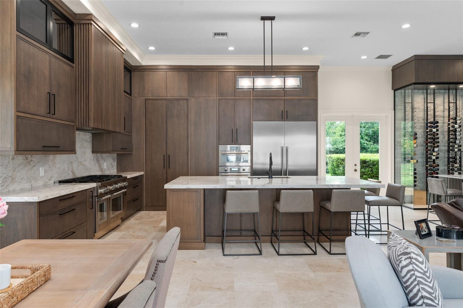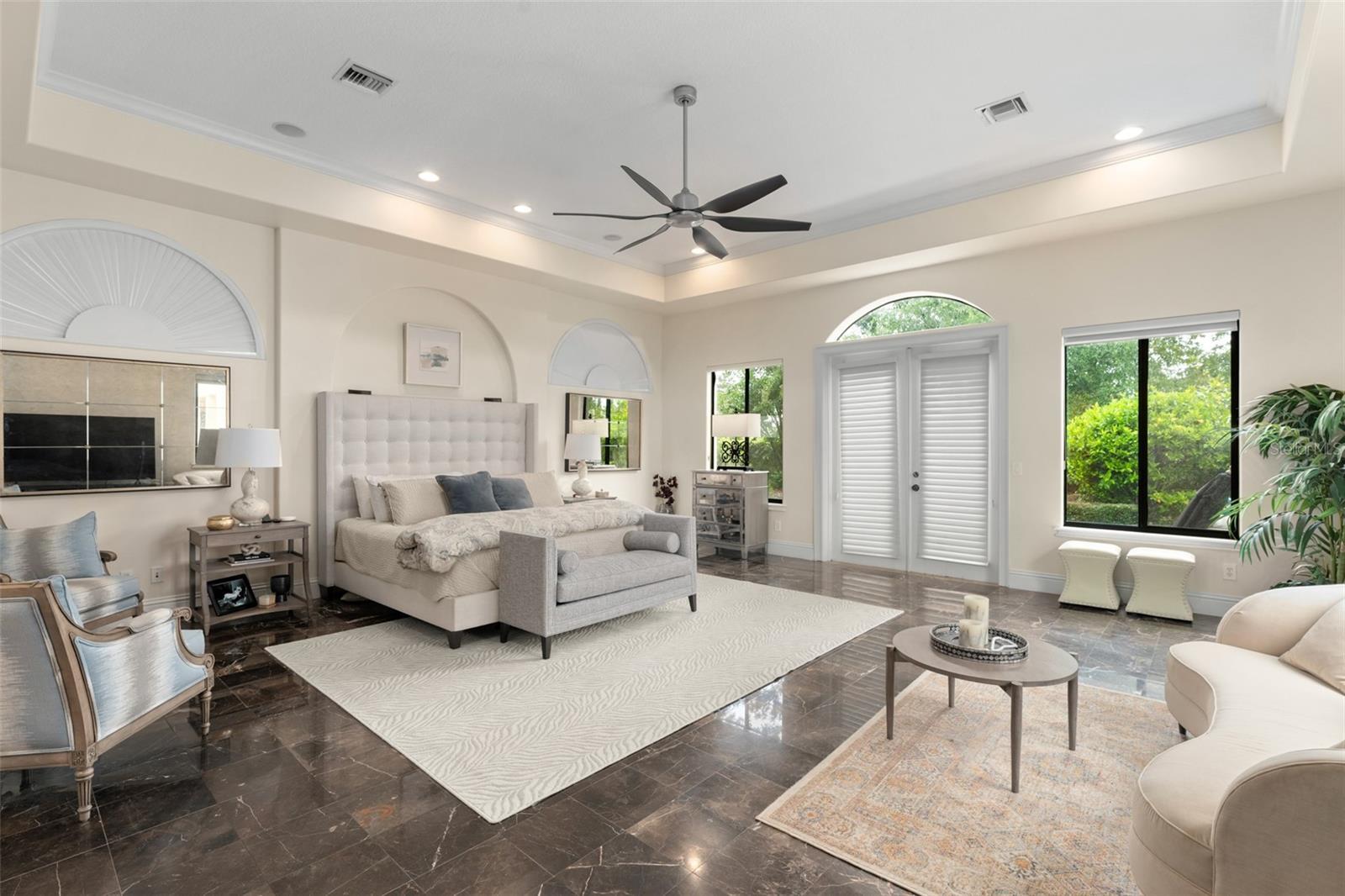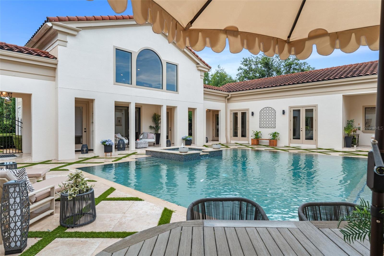 Under contract-accepting backup offers. An exceptional estate, masterfully renovated and transformed into a reimagined showplace: complete with a brand-new exquisite chef’s kitchen, family room, and bar with glass enclosed wine rack – plus mammoth private swimming pool and spa with new decking and checkerboard synthetic turf with multiple sitting venues. Featured on CNBC as “most sought-after floor plan,” this masterpiece residence impresses with 30-foot-tall ceilings, tongue and grove with wooden beams overhead, and a wall of windows to greet guests on entry. The spectacular home surrounds the pool area with three bedrooms all ensuite plus den and flex space for a gym in the main residence and a two-story attached building with renovated 4th bedroom or mother-in-law suite and bonus space, offering detached privacy but still within the confines of the residence, connected by breezeway. The family room, bar, and kitchen are all brand new with top-of-the-line Thermador appliances including a Pro Harmony® 48-inch-wide gas range with 6 burners and griddle, built in microwave and oven, refrigerator, double dishwashers, walk-in pantry, island, quartz counters and back splash. The just-completed impressive bar with beverage cooler, wine bottle display, sink and built-in shelving is a showstopper. The distinguished primary retreat and office encompass an entire wing with an oversized bedroom, grand bath with double vanities, jetted tub, tile-enclosed shower, wet bar, walk-in closet, and den with built-in display shelving. A formal dining room is elegantly appointed and perfectly suited for entertaining. For a more casual setting enjoy dining alfresco on the patio with the newly added summer kitchen with louvered pergola off the family room. Expansive grounds take full advantage of the 1-acre lot size. A 4-car garage plus a sizeable paver drive with ample parking affords space for all. Gated Chaine du Lac is known for its generously sized lots and is conveniently located within biking distance to Windermere Elementary. Downtown Windermere offers quaint shopping, an idyllic town hall, monthly food trucks, and weekly Farmer’s Market. Neighborhood also offers easy access to Windermere Prep, Winter Garden Village, the 429, and Florida’s Turnpike.