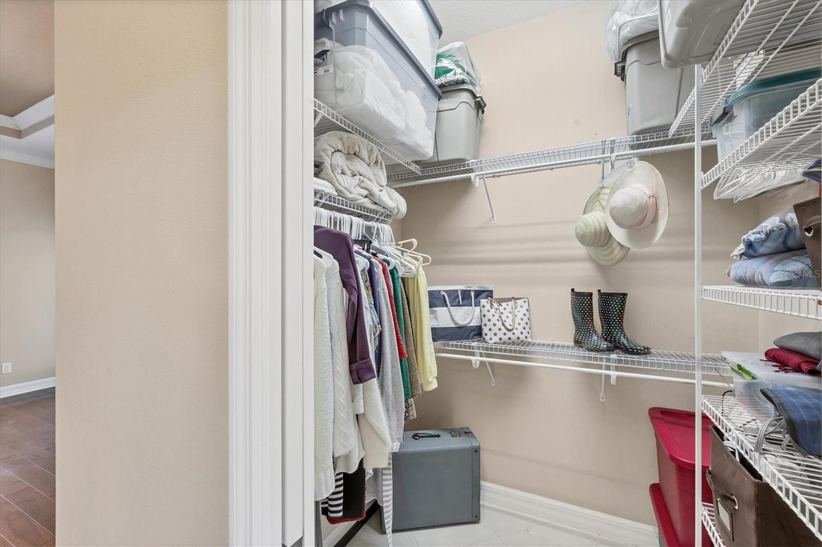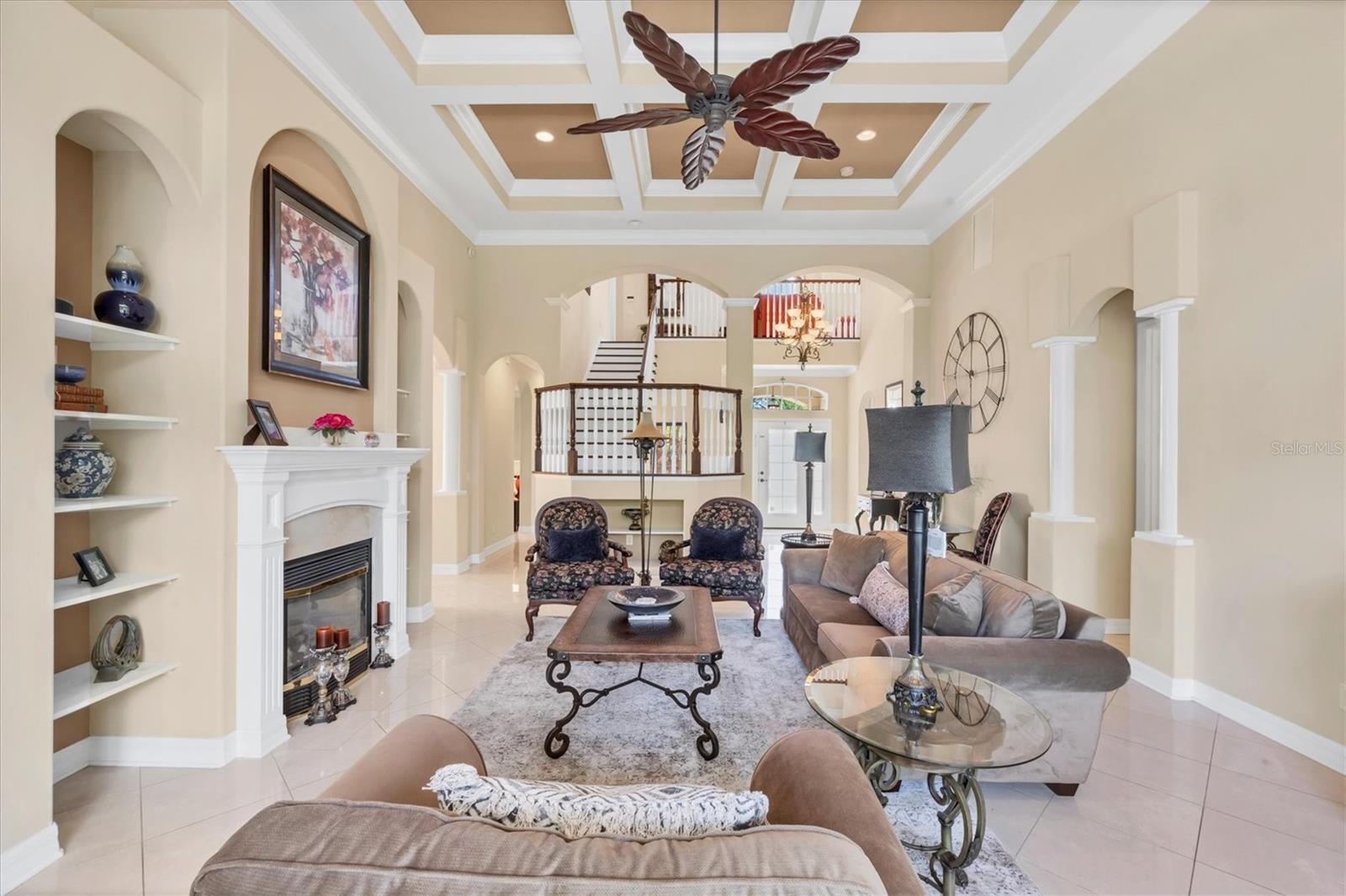 - Built-in Features, Ceiling Fans(s), Central Vaccum, Coffered Ceiling(s), Crown Molding, Eat-in Kitchen, High Ceilings, Open Floorplan, Pest Guard System, Primary Bedroom Main Floor, Solid Wood Cabinets, Stone Counters, Thermostat, Tray Ceiling(s), Walk-In Closet(s), Window Treatments