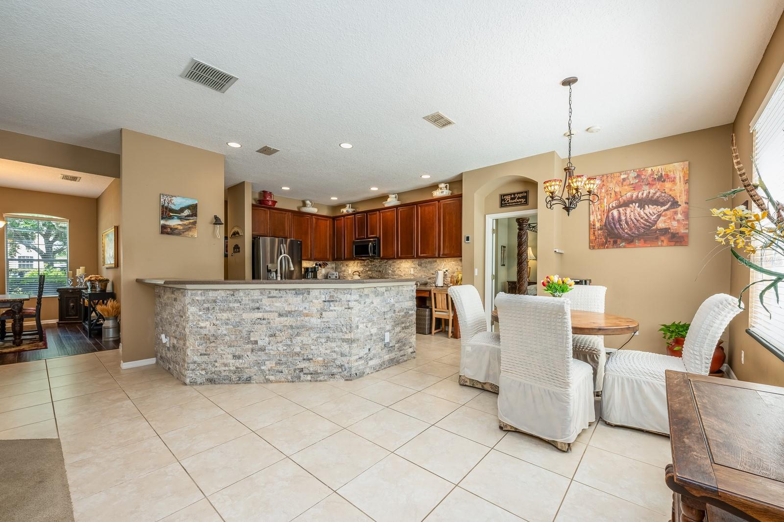 - Ceiling Fans(s), Eat-in Kitchen, Kitchen/Family Room Combo, Open Floorplan, Primary Bedroom Main Floor, Split Bedroom, Stone Counters, Thermostat, Tray Ceiling(s), Walk-In Closet(s), Window Treatments