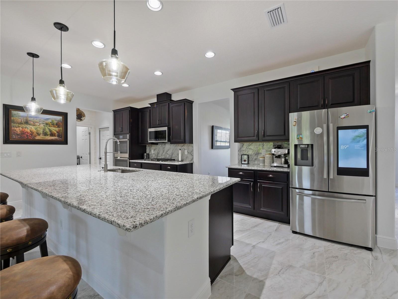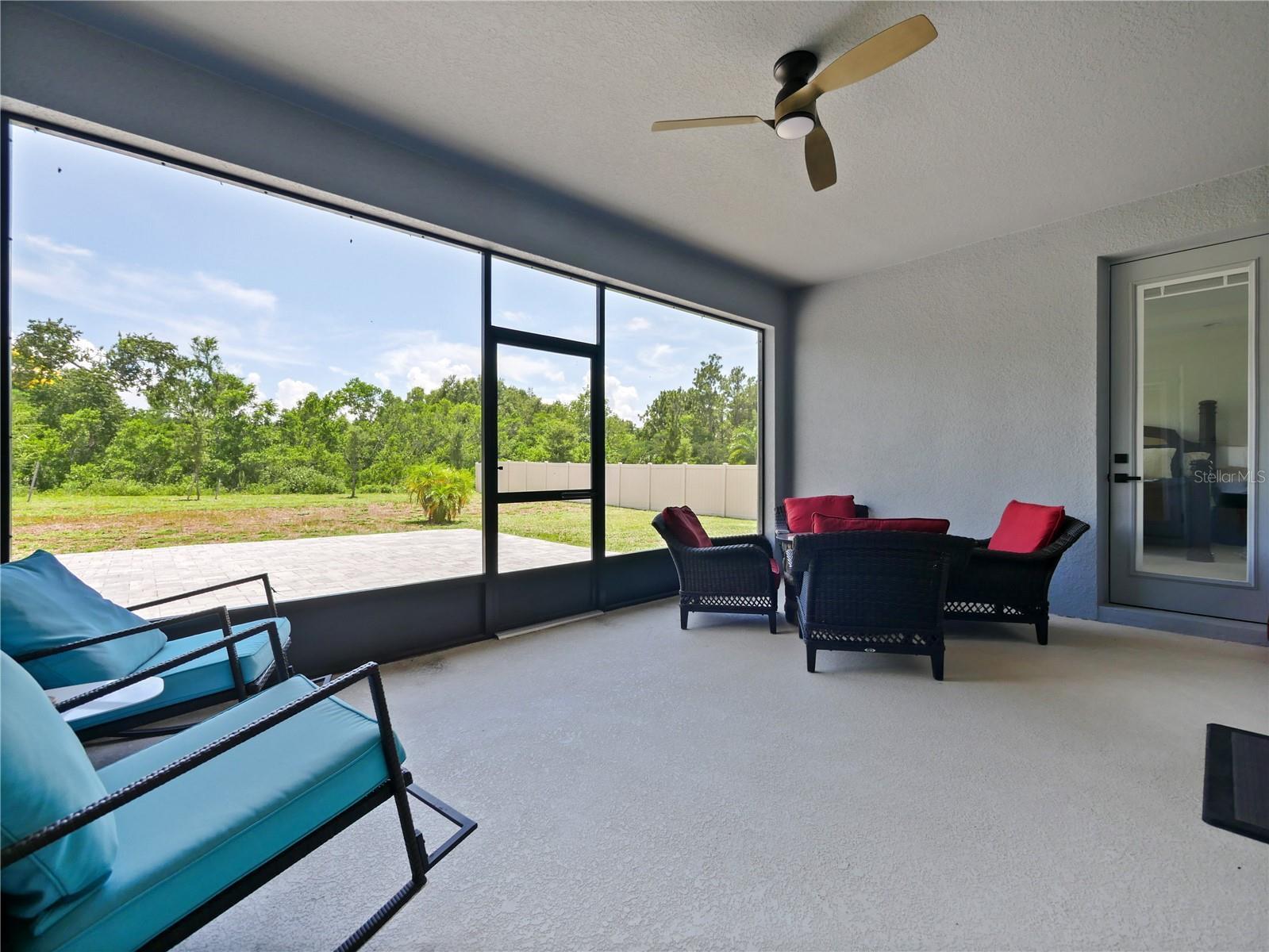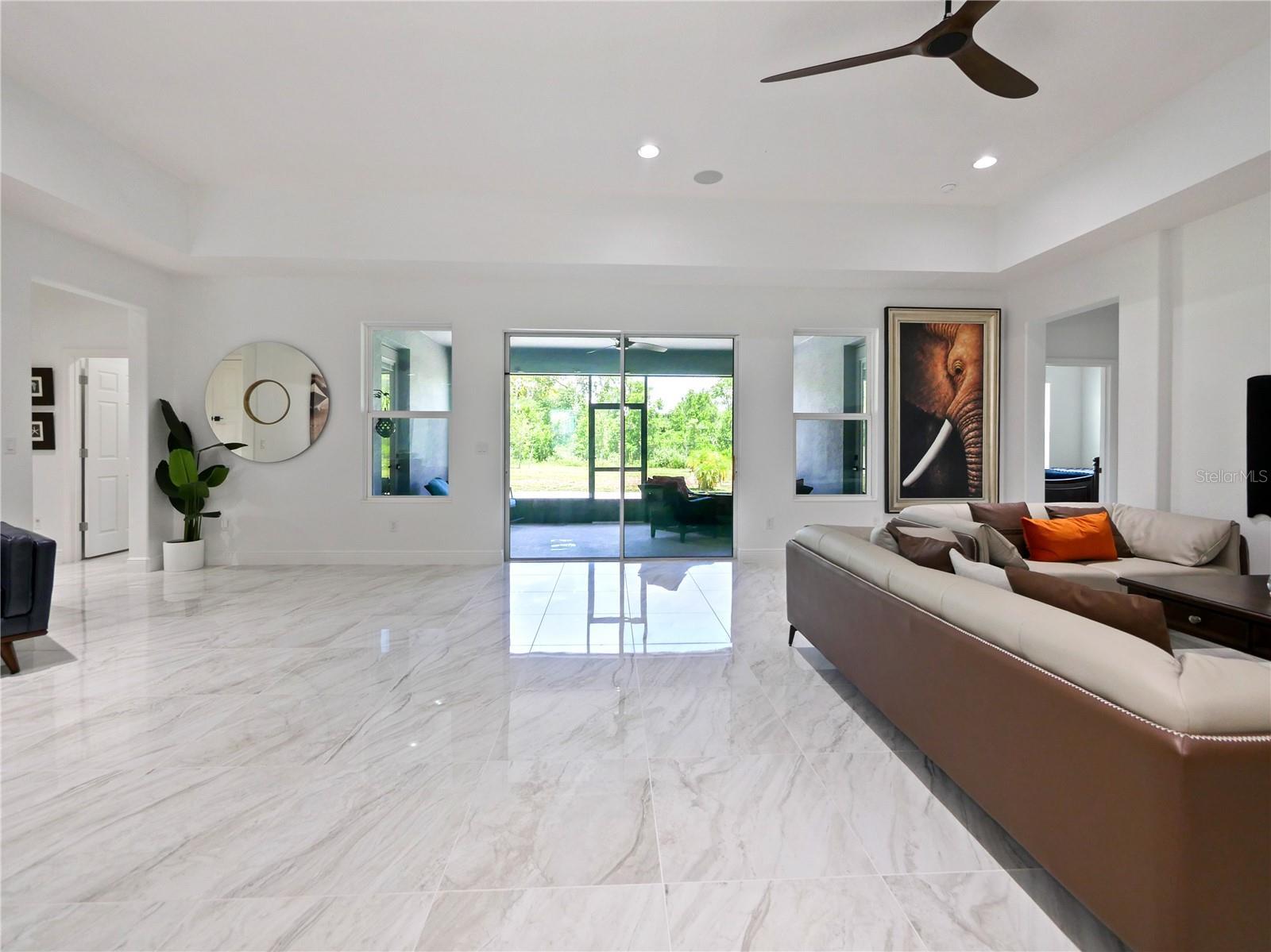 Now this is what you have been waiting for! This beautiful spacious home is calling your name. Owner added special touches throughout such as engineered wood floors and porcelain tile in main areas. Beautiful unique white tiled wall at the entrance to the large laundry room with granite countertops/ Laundry is pre-plumbed for wet sink. Gourmet kitchen is a chefs dream with an awesome view as it opens into the stunning great room which also has a view to the lanai and very large private back yard. Brick pavers in front and extra large brick paved pad in the rear, perfect for BBQ's etc. Neighbors on both sides have fenced in their property so you would only need to fence the rear and add a pool should you choose to do so. Owner had higher trey ceilings installed which makes for a very grand feel in the great room. Master is very nice with an ensuite bath and double vanities and a huge walk in closet. Washer, dryer, fridge, 3 pendant lights in kitchen and dining room and foyer fixtures do not convey but could be negotiated. Seller will replace all except the fridge. Come and get it!!