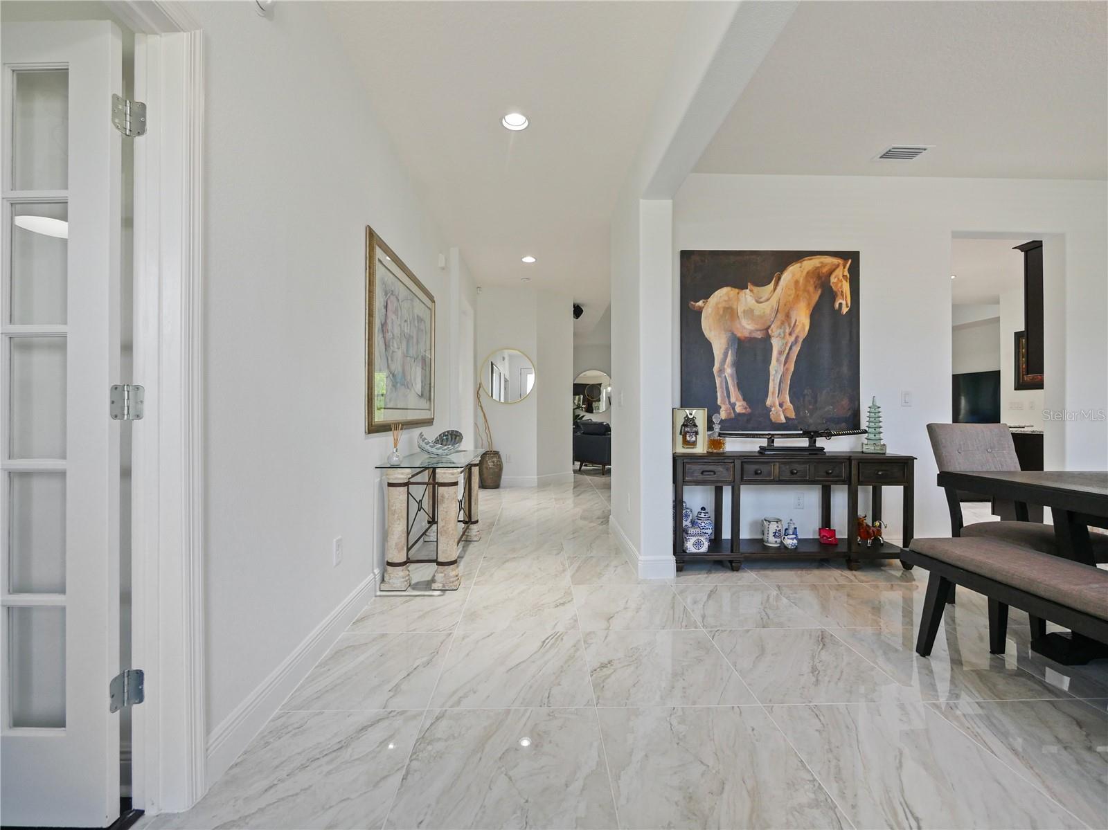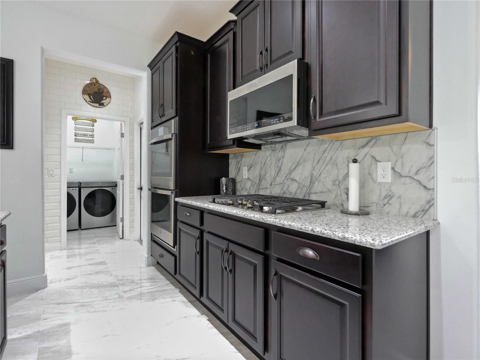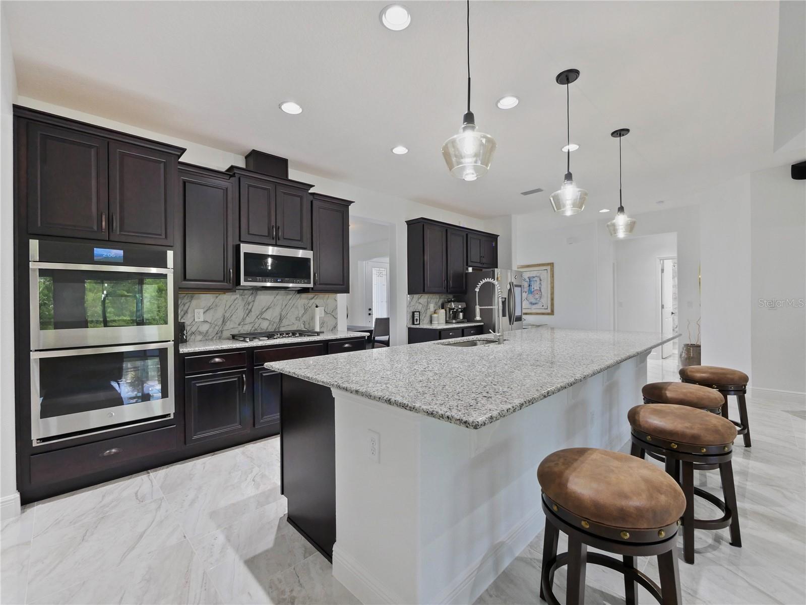 Now this is what you have been waiting for! This beautiful spacious home is calling your name. Owner added special touches throughout such as engineered wood floors and porcelain tile in main areas. Beautiful unique white tiled wall at the entrance to the large laundry room with granite countertops/ Laundry is pre-plumbed for wet sink. Gourmet kitchen is a chefs dream with an awesome view as it opens into the stunning great room which also has a view to the lanai and very large private back yard. Brick pavers in front and extra large brick paved pad in the rear, perfect for BBQ's etc. Neighbors on both sides have fenced in their property so you would only need to fence the rear and add a pool should you choose to do so. Owner had higher trey ceilings installed which makes for a very grand feel in the great room. Master is very nice with an ensuite bath and double vanities and a huge walk in closet. Washer, dryer, fridge, 3 pendant lights in kitchen and dining room and foyer fixtures do not convey but could be negotiated. Seller will replace all except the fridge. Come and get it!!