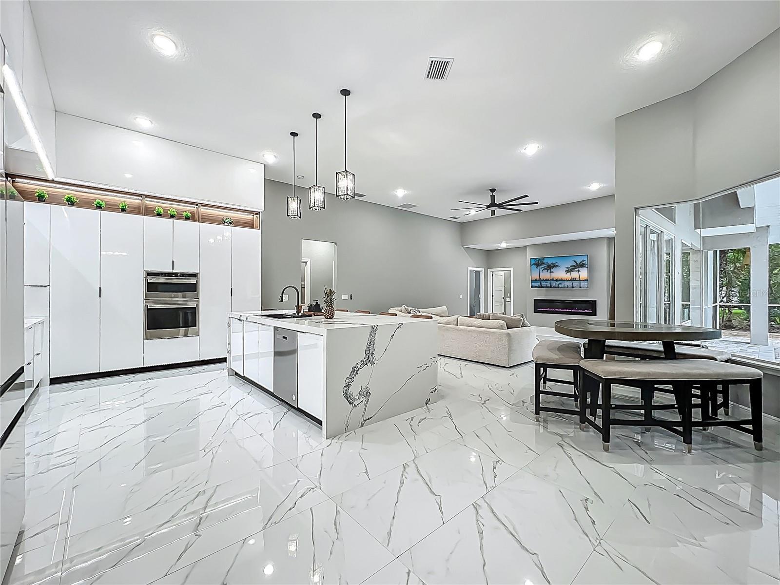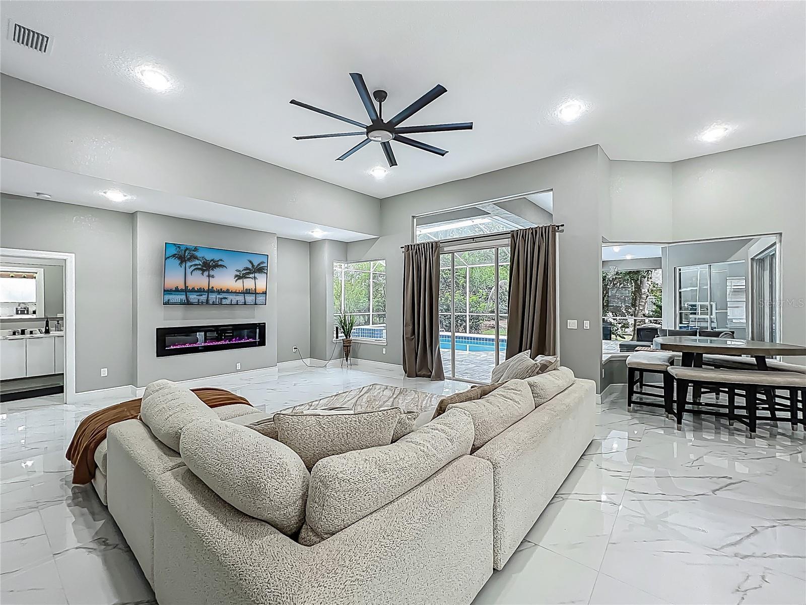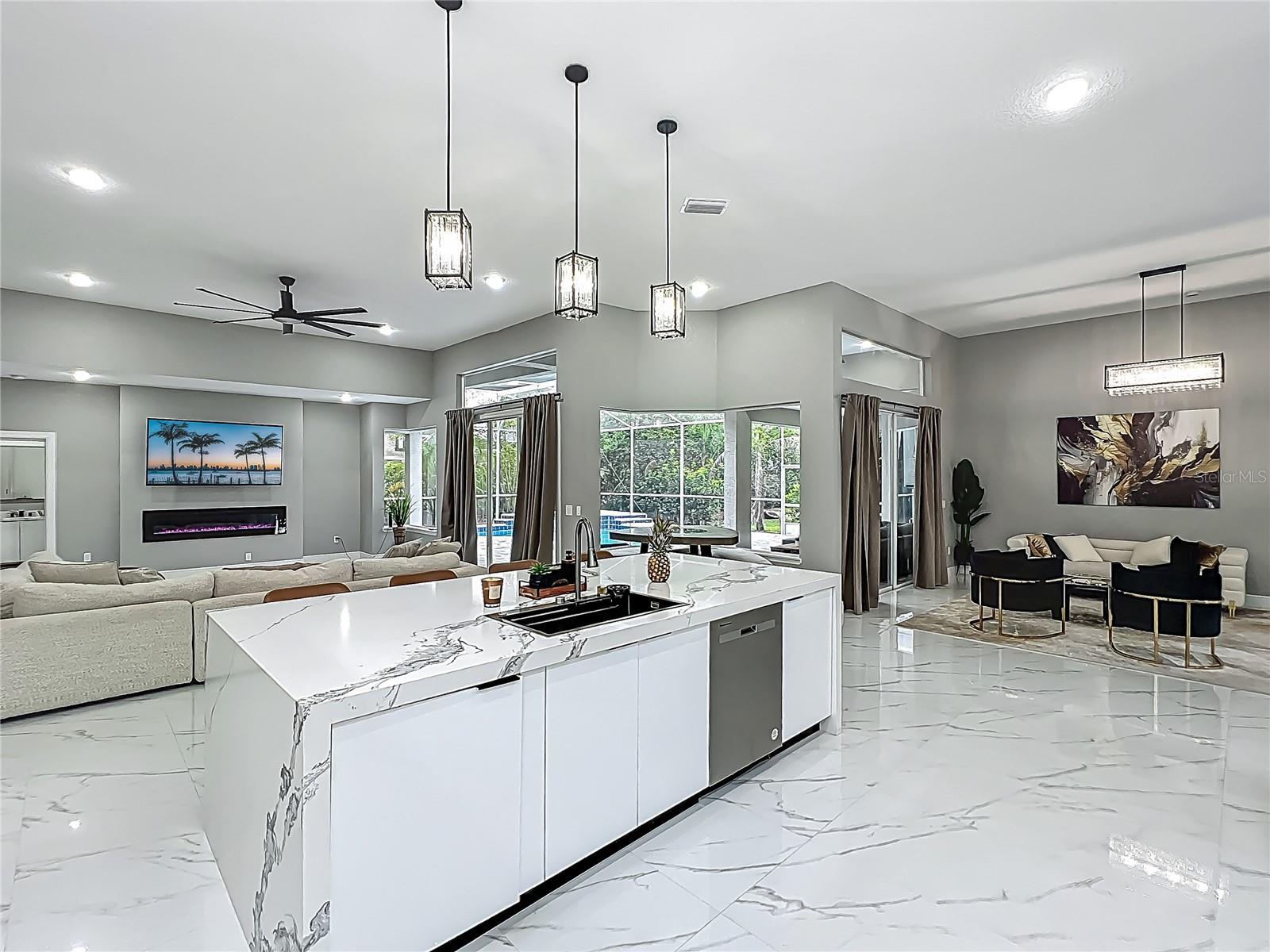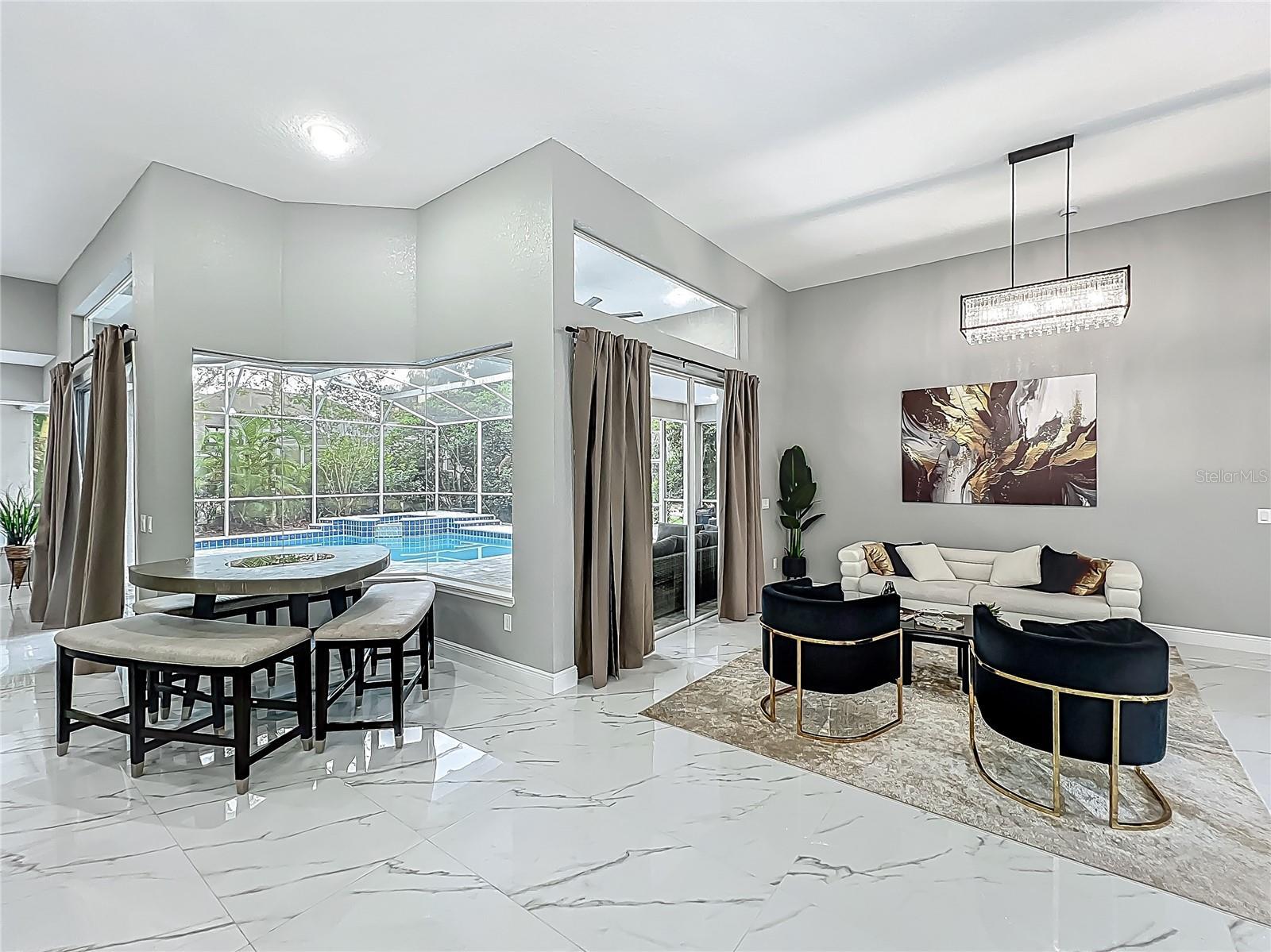 MAJOR PRICE REDUCTION - EXCEPTIONAL OPPORTUNITY! Welcome to a masterpiece of modern design and refined living in the prestigious Glen Eagle community of Tuscawilla. Built in 2023, this architectural re-imagining tucked away in a quiet cul-de-sac features 5-bedrooms and 3.5-baths and epitomizes luxury, sophistication, and thoughtful homage at every turn while encapsulating the modern family space. Bathed in natural light, the home showcases a brilliant interplay between design and illumination. Stunning porcelain tile with a marble-like finish flows seamlessly throughout the home, complementing the extravagant yet refined lighting fixtures that accentuate the home’s elevated aesthetic. The heart of the home is a show-stopping central kitchen, complete with sleek floor-to-ceiling white cabinetry accented with warm woodgrain niches and integrated LED lighting. A grand, white granite island offers an inviting centerpiece ideal for entertaining, culinary artistry, and family interconnectivity. The open-concept layout is enhanced by soaring ceilings and expansive windows, creating palatial living spaces that exude elegance and warmth. A substantial formal dining room is perfect for lavish dinner parties, while the stylish formal living room provides a serene space for conversation. The inviting family room, anchored by a sleek electric fireplace, flows effortlessly into the kitchen and living area—all overlooking the resort-style pool deck. The primary suite is a private sanctuary—expansive and serene, featuring a sun-kissed sitting area and direct pool access via a sliding glass door. The spa-inspired en suite bath is a statement in luxury, boasting a floating dual vanity with LED smart mirrors, an oversized walk-in shower, a single-piece designer toilet, and a custom walk-in closet designed for the discerning homeowner. Every secondary bedroom offers generous proportions and comfort, while the home’s layout has been meticulously planned for both privacy and flow. Step outside to a covered pool oasis with a pavered deck designed for year-round enjoyment. Whether hosting guests or relaxing in solitude, this outdoor haven is the perfect complement to the modern interior. Glen Eagle lies in the heart of the Tuscawilla community which features miles of walking trails, golf cart friendly roads, multiple parks and greenspaces including tennis and pickleball courts, as well as the Tuscawilla Country Club. A rare opportunity to own a truly bespoke residence in one of Central Florida’s most sought-after communities.