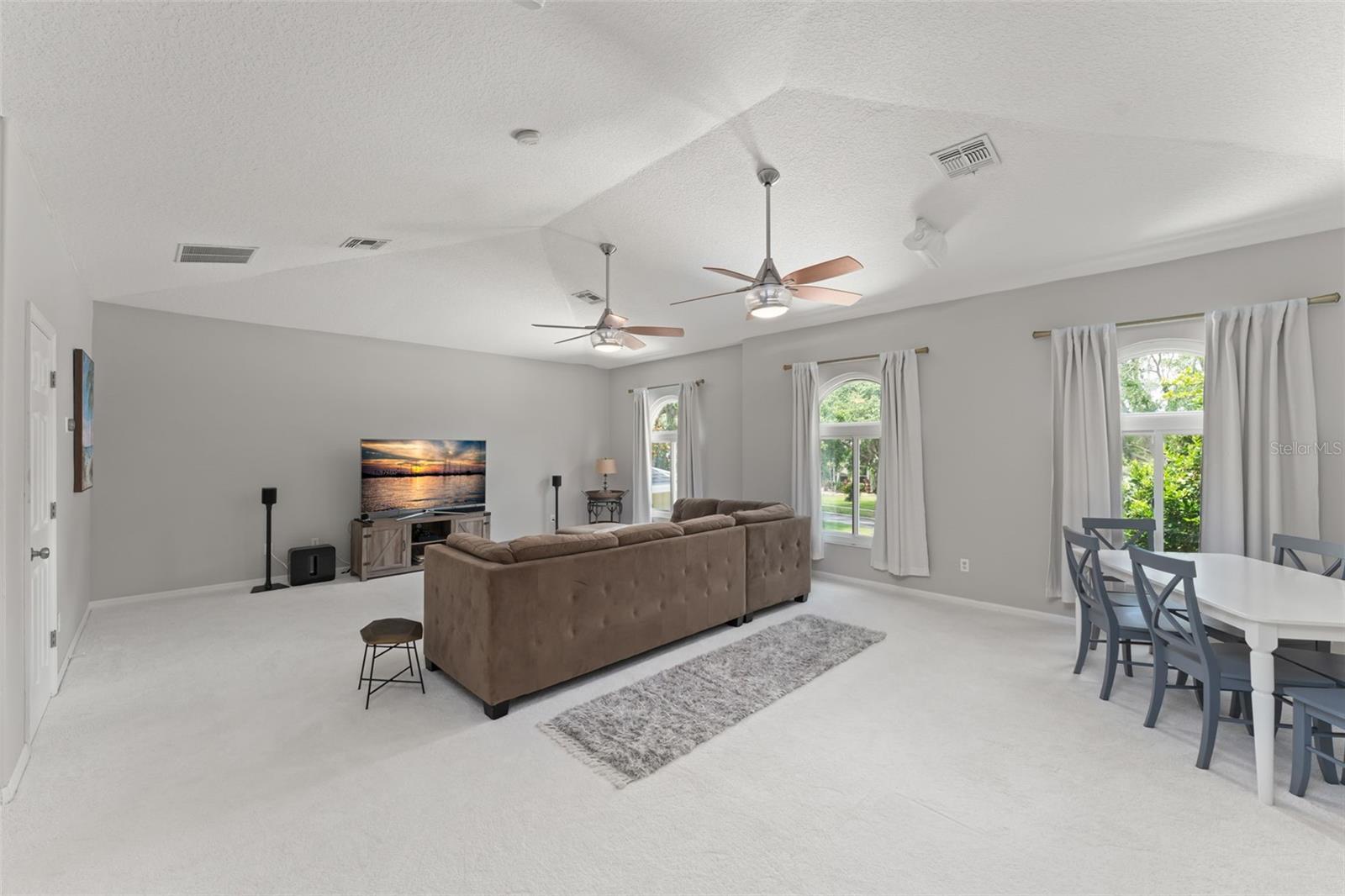 - Ceiling Fans(s), Eat-in Kitchen, High Ceilings, Kitchen/Family Room Combo, Living Room/Dining Room Combo, Open Floorplan, Primary Bedroom Main Floor, Solid Wood Cabinets, Stone Counters, Thermostat, Vaulted Ceiling(s), Walk-In Closet(s), Window Treatments