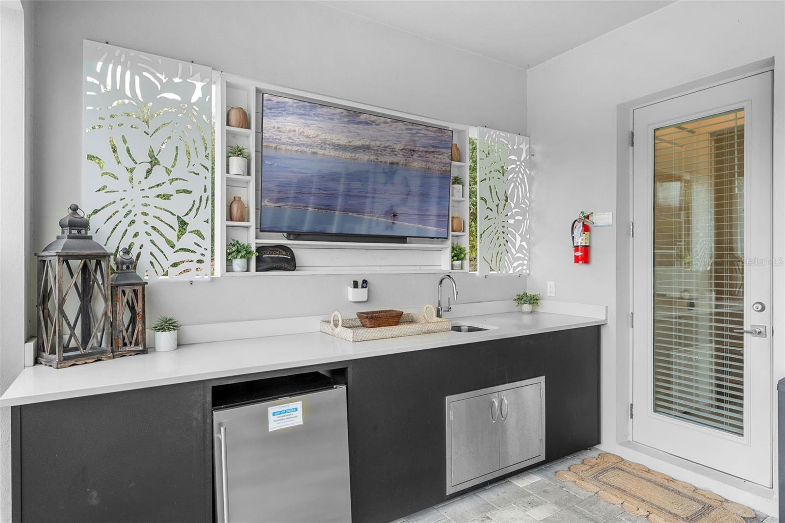 - Lighting, Outdoor Grill, Outdoor Kitchen, Sidewalk, Sliding Doors