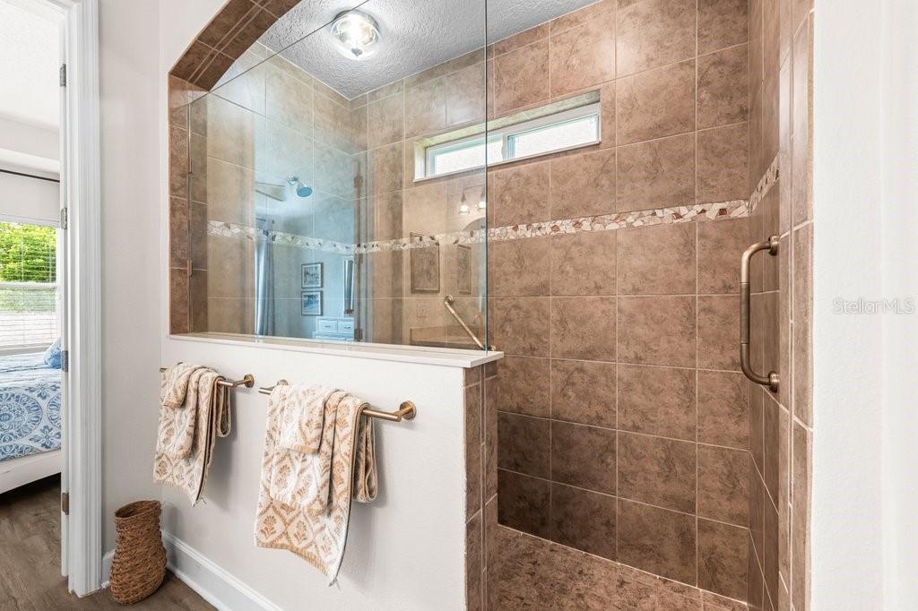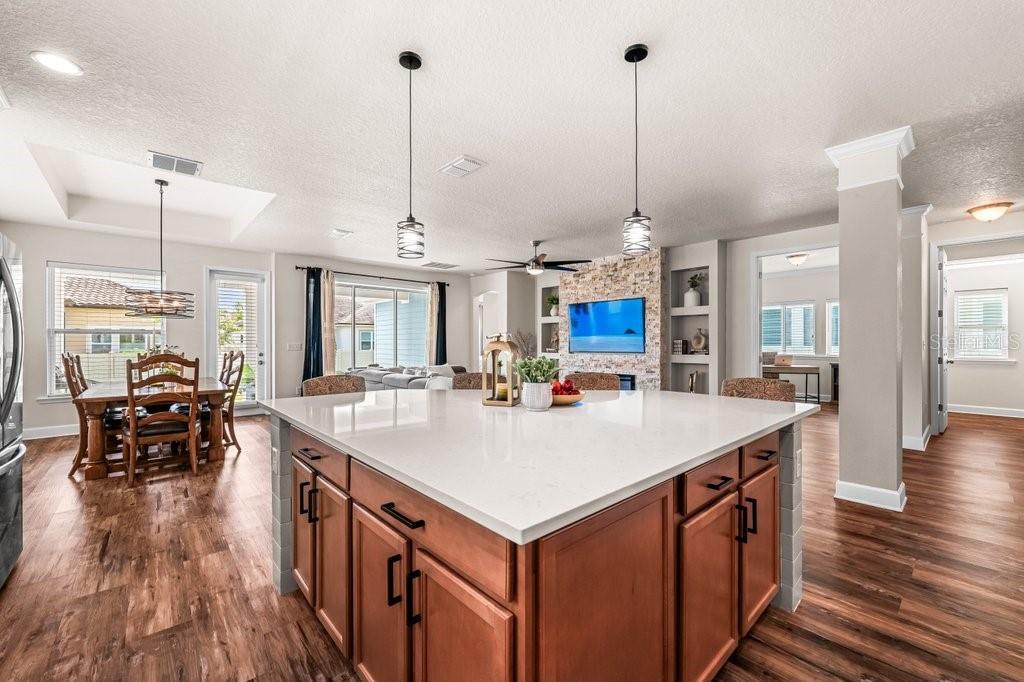 - Accessibility Features, Built-in Features, Ceiling Fans(s), Crown Molding, Eat-in Kitchen, High Ceilings, In Wall Pest System, Living Room/Dining Room Combo, Open Floorplan, Primary Bedroom Main Floor, Solid Surface Counters, Solid Wood Cabinets, Split Bedroom, Stone Counters, Thermostat, Tray Ceiling(s), Vaulted Ceiling(s), Walk-In Closet(s), Window Treatments