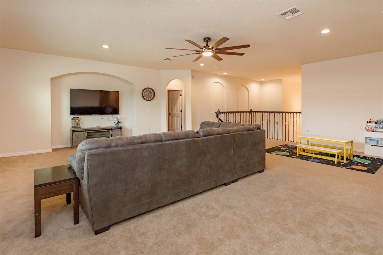 - Ceiling Fans(s), Eat-in Kitchen, Kitchen/Family Room Combo, Open Floorplan, Primary Bedroom Main Floor, PrimaryBedroom Upstairs, Solid Wood Cabinets, Split Bedroom, Stone Counters, Thermostat, Walk-In Closet(s)