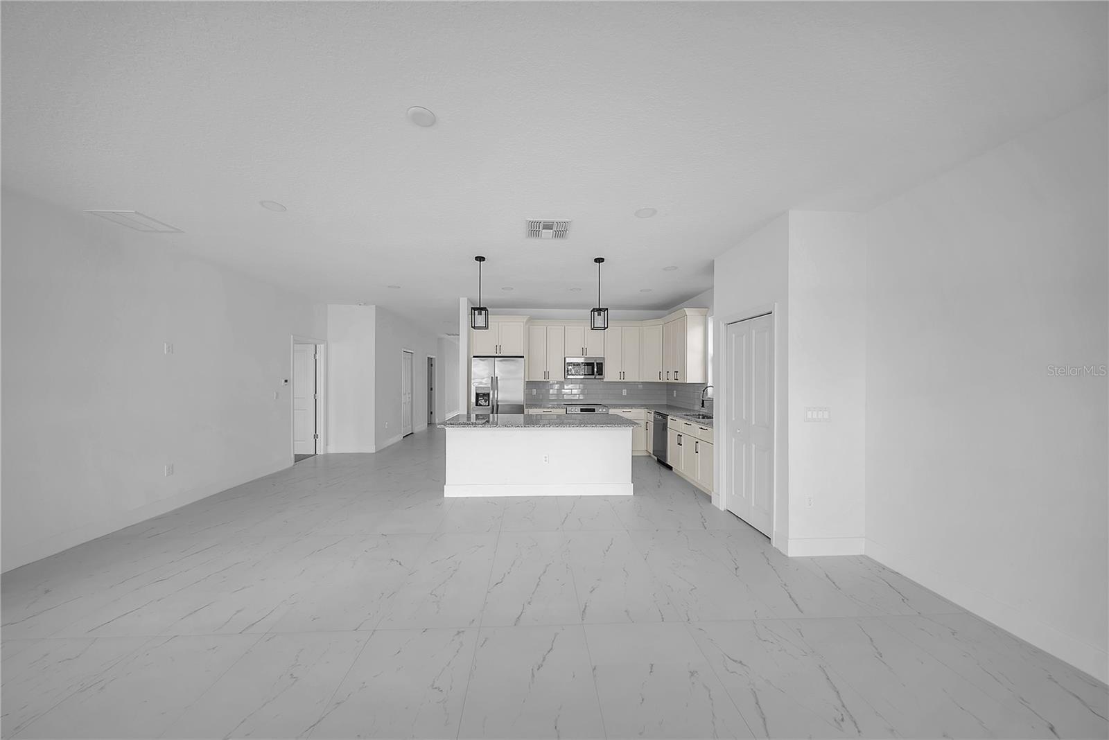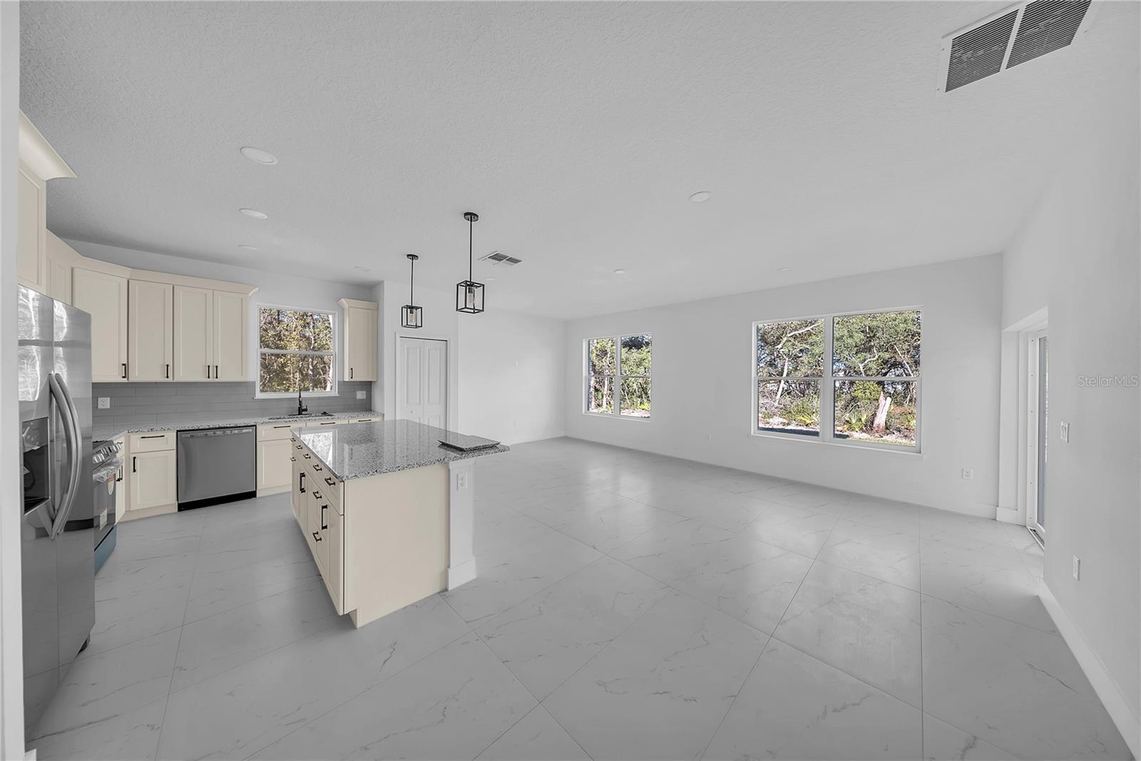 - Ceiling Fans(s), High Ceilings, Kitchen/Family Room Combo, Living Room/Dining Room Combo, Open Floorplan, Primary Bedroom Main Floor, Solid Surface Counters, Solid Wood Cabinets, Stone Counters, Thermostat, Walk-In Closet(s)