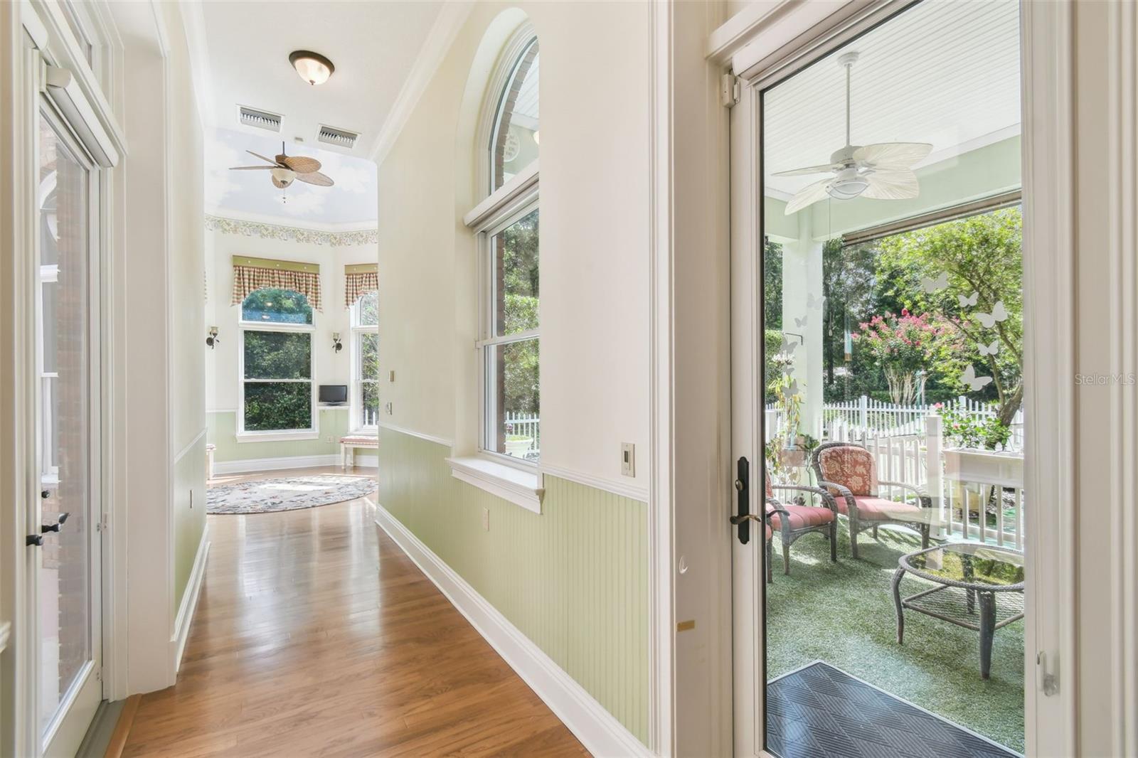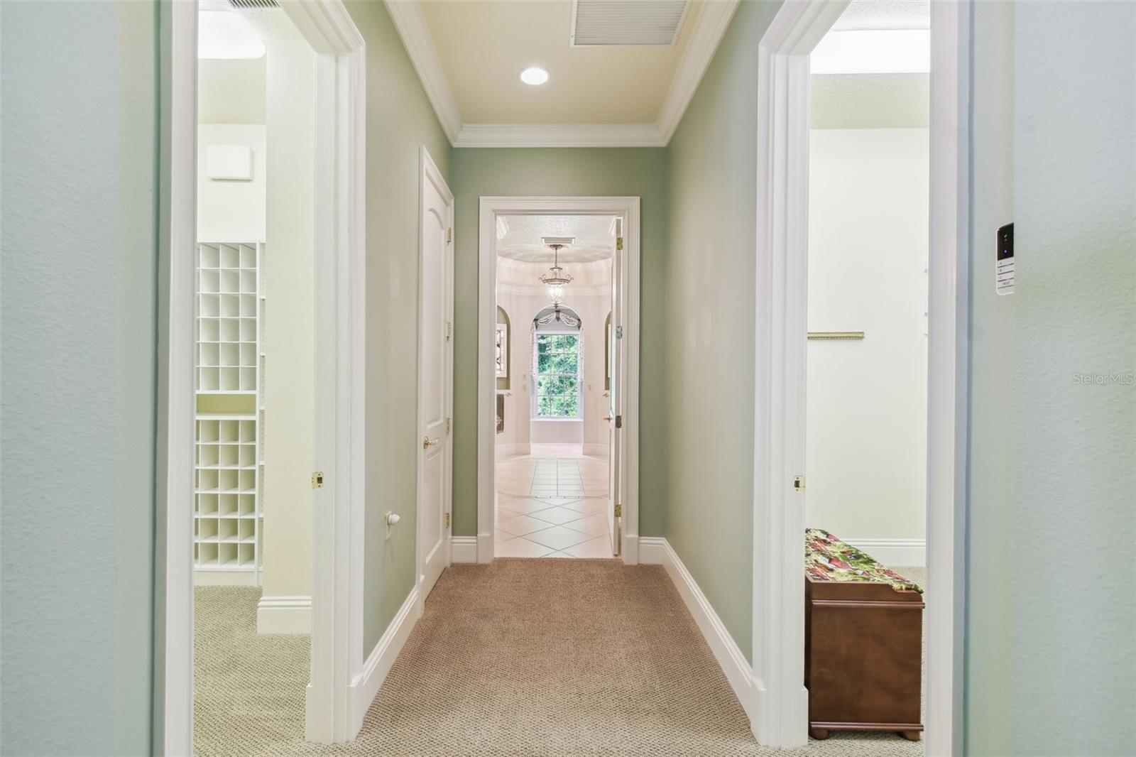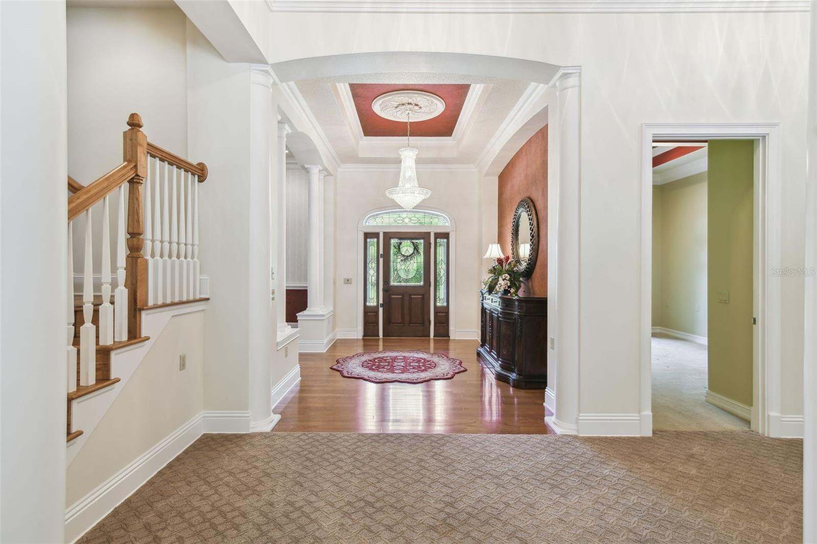 Welcome to a private luxury estate at the end of a peaceful cul-de-sac in the exclusive gated enclave of Taylor Woods. On 2.5 manicured acres, this custom-built masterpiece delivers a rare blend of timeless elegance, high-end craftsmanship, and everyday comfort. From the moment you arrive, the estate makes a grand impression with its stately paver driveway, white-pillared entry, and raised elevation, built on a solid concrete stem wall foundation with brick veneer for enduring quality. Inside, soaring ceilings, hardwood and tile floors, and more than a mile of crown molding set the tone for luxury living. Swarovski crystal chandeliers grace the foyer and formal dining room, which comfortably seats twelve and features a gas fireplace surrounded by black marble. The chef’s kitchen is designed to impress dual islands, solid wood cabinetry, a gas cooktop with downdraft, double ovens, a dedicated ice maker, and a butler’s pantry complete with prep sink, warming drawer, walk-in storage, and private entry to the dining room. The grand living room features custom built-ins, a gas fireplace and a one-of-a-kind original carousel horse centerpiece. Just beyond the grand living room and kitchen, a long and elegant hallway leads to the garden room—an inviting space for informal dining with floor-to-ceiling windows and a vaulted ceiling custom-painted with a serene sky and cloud motif. Continuing through the home, a wide gallery hallway—accented by graceful archways, sconce lighting and hidden hardwood flooring—leads to multiple bedrooms, including a flexible study with a tin inlay tray ceiling and an oversized office with ample storage, and even a convenient half bath with lanai access. The primary suite is a sanctuary featuring French door access to the lanai, two walk-in closets, a gas fireplace with marble surround, and an expansive en-suite bath with dual vanities, dual water closets and dual walk-in showers The laundry room is thoughtfully appointed with a sink, folding station and a hidden laundry chute connecting directly to the primary suite. Upstairs, the guest suite offers two bedrooms, a flex room, a full bath, and a comfortable sitting area with its kitchenette. The walk-in attic is directly accessible from this level with built-in shelving, lighting, and a 400-pound capacity electric lift that connects to the three-car garage below, making it effortless to move stored items between levels. The large lanai is partially under roof and is designed with entertaining in mind. Three sets of French doors and a separate entry door provide seamless flow to key areas of the home. Across from the lanai, the custom-designed dog park is an exceptional feature for pet lovers—partially covered and fully enclosed with fencing and premium artificial turf. The detached carriage house adds another 1,157 square feet, including a climate-controlled museum space and a fully equipped workshop with a car lift. Additional highlights include a steel-door safe room with air conditioning, a 20-kilowatt propane generator, impact-resistant Anderson windows and doors, full irrigation system with private well, and spray-foam attic insulation for year-round energy efficiency. This one-of-a-kind estate offers complete privacy while being just minutes from historic downtown DeLand, named “Best Main Street in America,” and within easy reach of beaches, major highways, shopping, restaurants, cultural events and top-rated schools.
