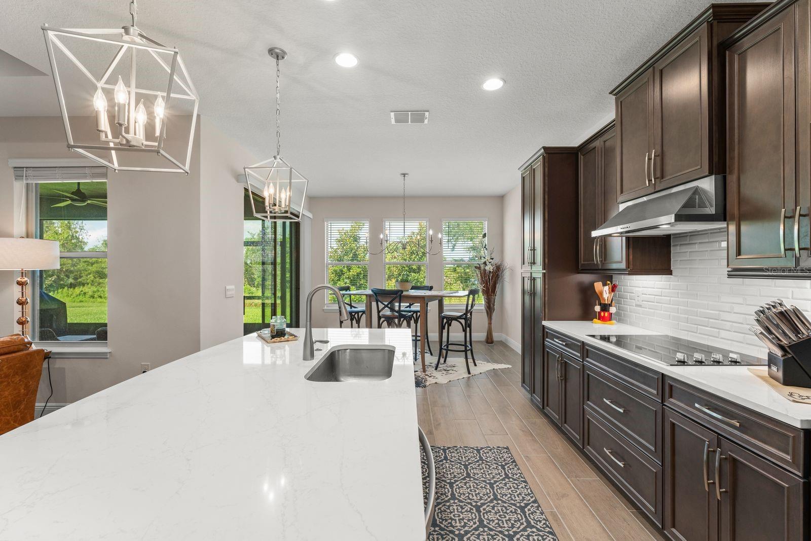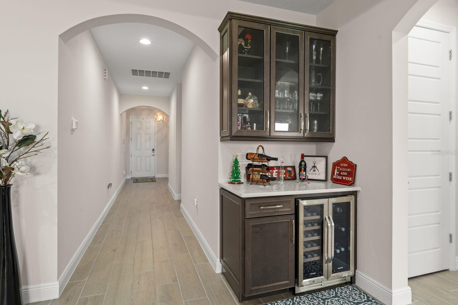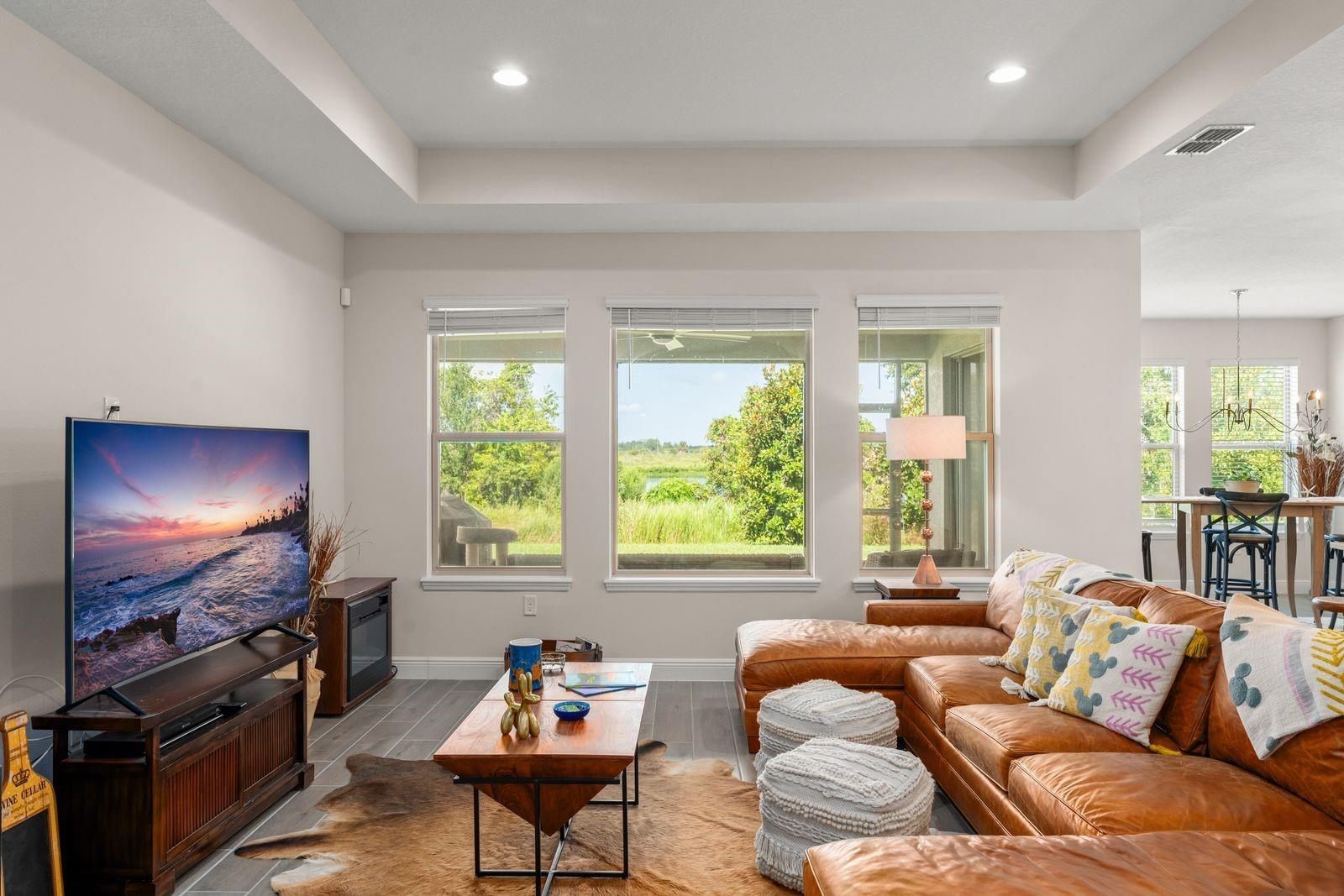 Welcome to your dream home! This beautifully decorated 3 Bedroom + Office, 2 1/2 Bath home where comfort meets style offers stunning lake views and a sleek tile roof. Upon entering you'll be greeted by architectural arches and a wide foyer entry. To your left, you will be greeted by architectural arches and a wide foyer entry. On your left you will find a Den/Study/Office with glass entry doors & the same upgraded porcelain tile wood plank floor that are seen throughout the living areas. Step inside to find an open floor plan filled with natural light with large windows showcasing the gorgeous lake, conservation and breathtaking sunsets views! Serve gourmet meals with flair and ease in the gourmet island kitchen featuring modern appliances, plenty of storage space and pendant lights. The owner's suite offers a tranquil retreat, complete with a spacious walk-in closet and an ensuite bath. Two additional bedrooms provide plenty of space for family/guests. Enjoy beautiful lake views from the spacious screened in lanai. The peaceful outdoor space is perfect for entertaining guests. The large 3 car tandem garage has a beautiful epoxy floor with plenty of storage space. this home is a must see for the discerning buyer! Conveniently located to all Winter Garden has to offer including shopping, dining, main roads and entertainment options.