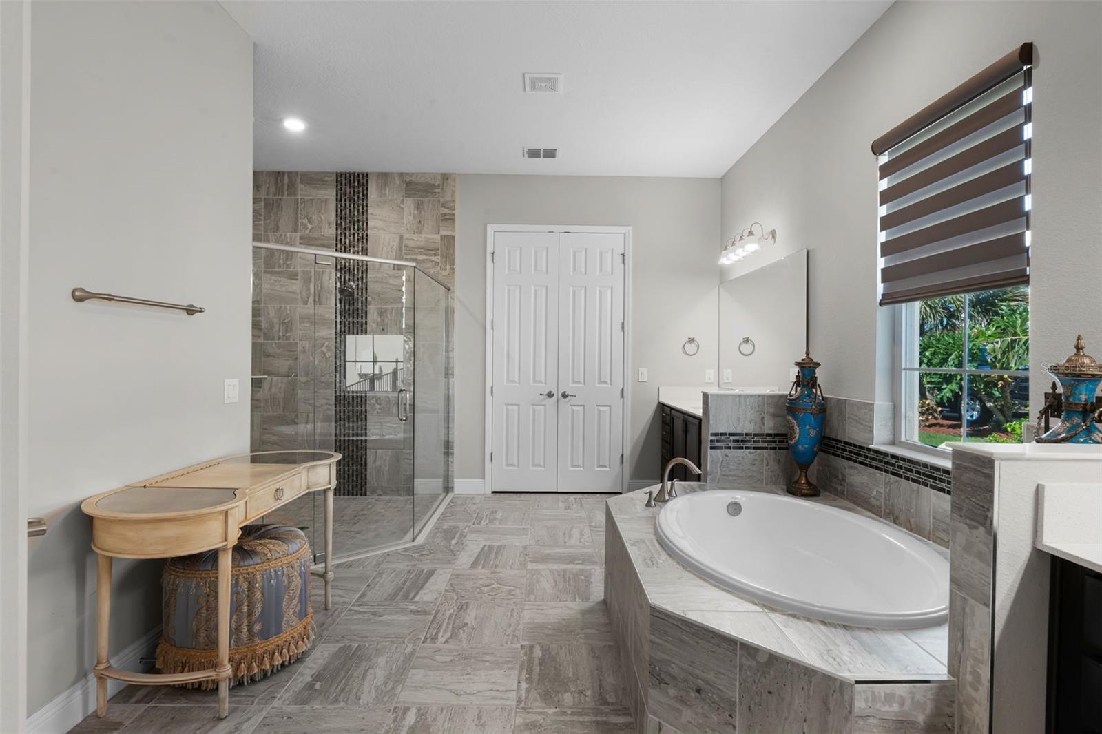 - Ceiling Fans(s), Eat-in Kitchen, High Ceilings, Open Floorplan, Primary Bedroom Main Floor, Solid Surface Counters, Solid Wood Cabinets, Split Bedroom, Stone Counters, Thermostat, Tray Ceiling(s), Vaulted Ceiling(s), Walk-In Closet(s), Window Treatments