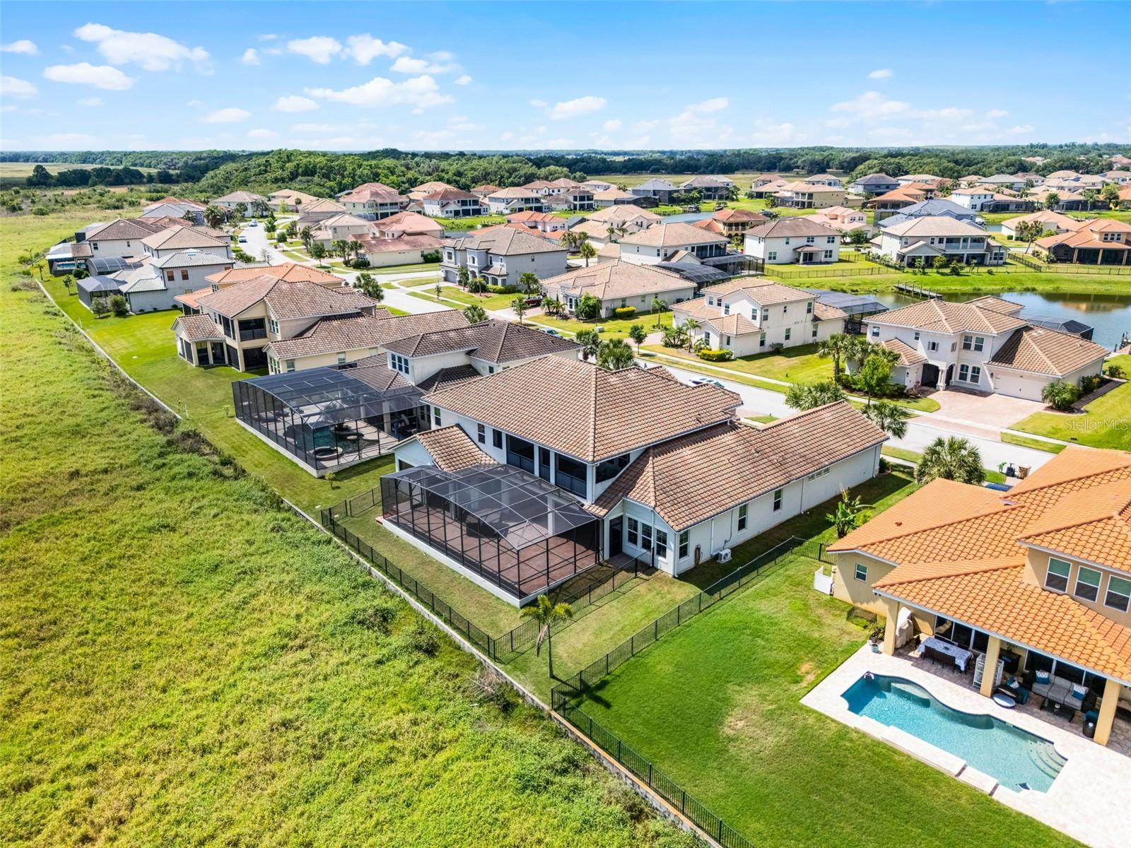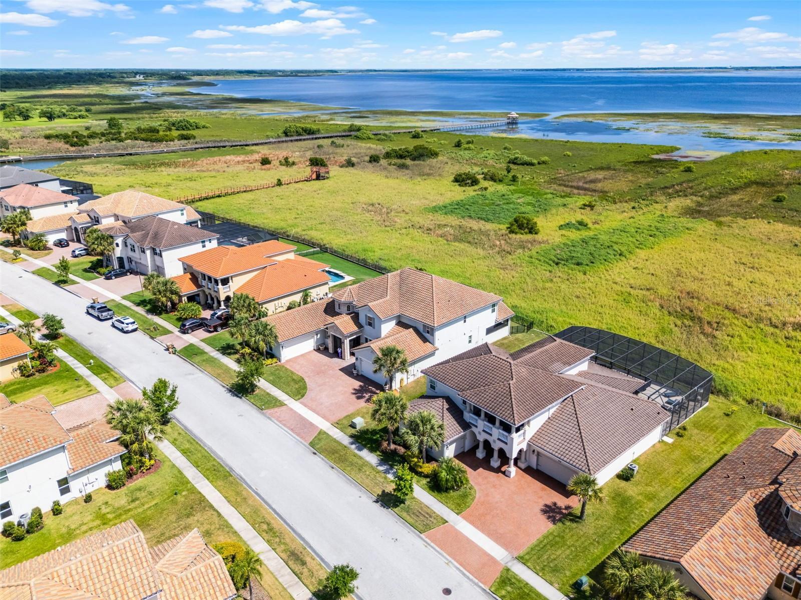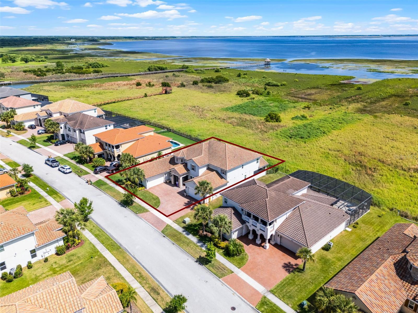 LAKEFRONT LUXURY LIVING in Bellalago! No rear neighbors, Just lake views! Welcome to this expansive Mediterranean-inspired estate set directly on Lake Tohopekaliga. Built in 2019, this stunning 5,412 sq ft home combines timeless architecture with modern function—offering two 2-car garages, including one oversized with a built-in workshop—perfect for car enthusiasts or hobbyists.Step inside through the gated and screened entry to find soaring 20-foot ceilings and wide-plank flooring that carries throughout the main level. The open-concept design blends formal and casual living beautifully, from the elegant dining area with a dedicated coffee or wine bar to the oversized great room—ideal for hosting large gatherings.The gourmet kitchen is a chef’s dream, featuring 42” cabinets, a glass tile backsplash, granite counters, stainless steel appliances, a walk-in pantry, a butler’s pantry, and a massive island with seating for the whole family. A cozy breakfast nook completes the space, opening seamlessly to a sprawling, screened-in lanai with breathtaking lake views. Enjoy relaxing evenings in the spa under the stars, or add your dream summer kitchen—gas and water lines are already pre-plumbed.With direct access to Lake Toho, boating enthusiasts will love the permitted egress—just add your own dock and hit the water anytime, day or night.The main-floor primary suite offers privacy, its own climate control, a separate entrance to the patio, a spacious custom closet with built-in seating, and a luxurious en-suite bathroom with dual vanities, a soaking tub, water closet, and oversized walk-in shower. A versatile flex room on the first floor is perfect for a home office, studio, or guest space.Also on the main level: a convenient cabana bath, powder room, and full laundry room. Upstairs, you'll find a second full laundry room, a large loft that works perfectly as a media room or lounge, and access to a covered, screened balcony with more panoramic lake views. The junior primary suite features its own full bath, while the remaining bedrooms are generously sized—each with large walk-in closets and shared or en-suite bathrooms. Bedroom 5 also has direct balcony access.Storage won’t be an issue, with multiple storage closets throughout the home—two downstairs and four upstairs.Enjoy the best of resort-style living in Bellalago, a gated waterfront community with a private boat ramp and lift, multiple pools, fitness centers, basketball and tennis courts, a lakeside boardwalk, on-site dining, playgrounds, a dog park, and so much more. Call today to schedule your private tour and experience lakefront elegance firsthand!