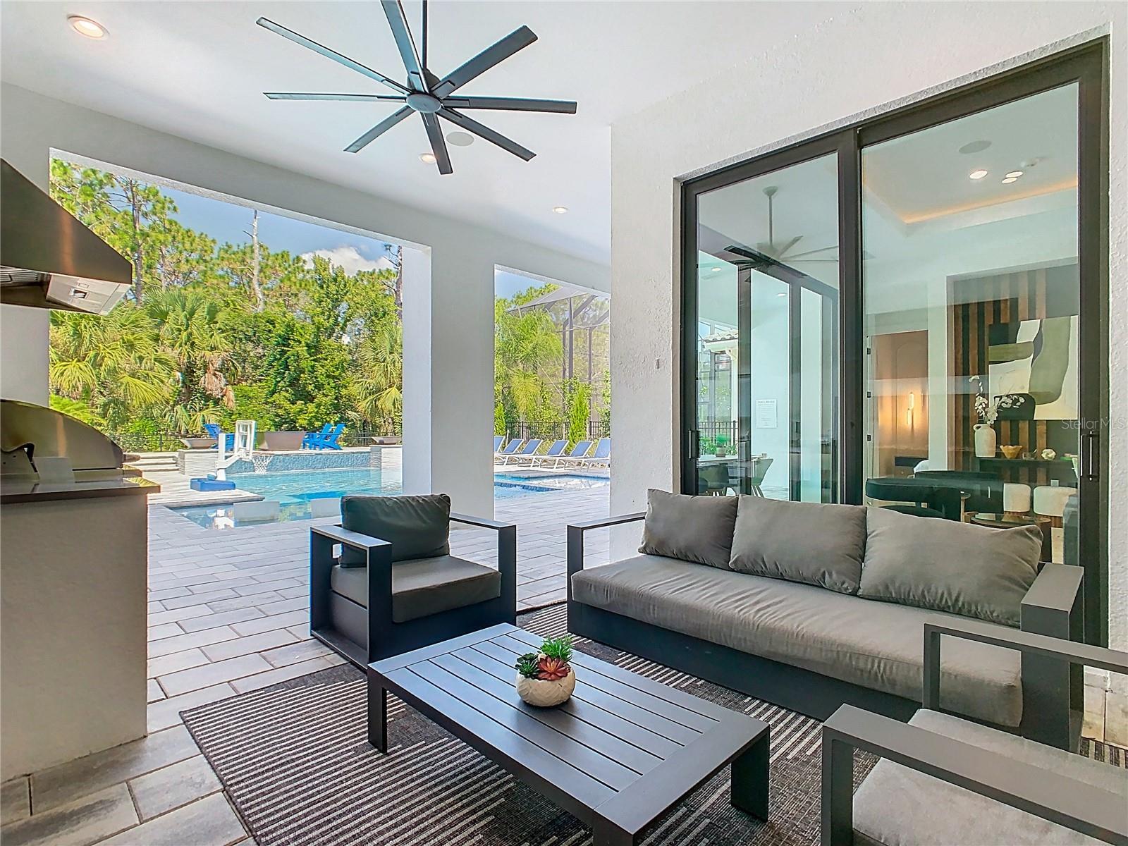 - Lighting, Outdoor Grill, Outdoor Kitchen, Sidewalk, Sliding Doors