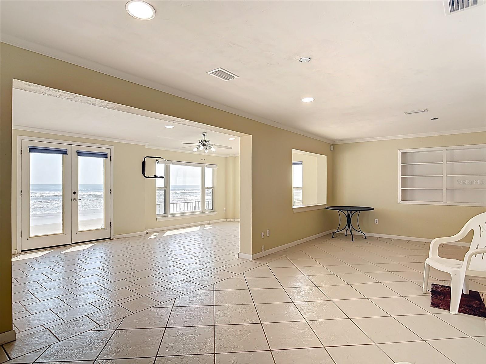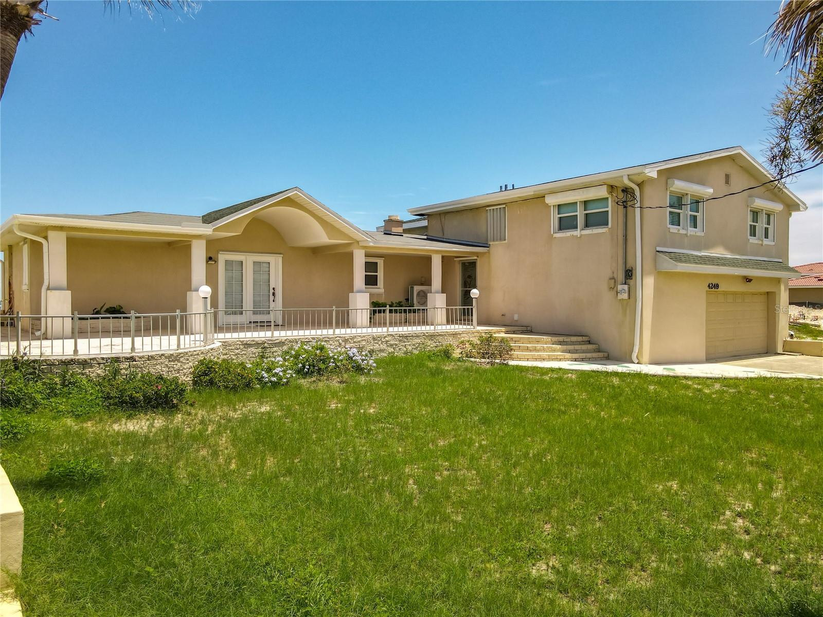 Awe-Inspiring Oceanfront Opportunity! Perched on a spectacular 75-foot-wide stretch of direct oceanfront, this property offers a rare chance to own a slice of paradise on one of the most awe-inspiring coastlines in Florida. With 188 feet of depth and over 3,200 sq ft of interior space, this unique multi-level home blends mid-century charm with a warm 1986 addition—designed to embrace panoramic ocean views and seamless indoor-outdoor living. Inside, the flexible split-level floor plan includes 4 true bedrooms, 3 full baths, and 2 additional bonus rooms—each with en-suite baths—providing ideal flexibility for guest suites, a home office, or an in-law setup. On the main level, a welcoming beach suite features durable Chattahoochee stone flooring, perfect for sandy feet, and opens via French doors to one of three expansive oceanfront terraces. This suite also includes a full en-suite bath, offering a convenient retreat for beachgoers or overnight guests. A wall of windows in the adjacent family room captures unobstructed ocean views, with more French doors bringing the outside in. Half walls create natural flow between the family room, living room, dining area, and a spacious bonus recreation area. The galley-style kitchen is efficient yet inviting, featuring a breakfast bar that opens directly to the dining area - ideal for casual meals while enjoying views of the Atlantic. A split staircase leads to the upper bedroom level, where the oceanfront primary suite impresses with wood floors, a wall of windows, walk-in closets, and a private en-suite bath. Bedroom 2 has direct access to a full bath that also opens to the hallway for guest use. Bedroom 3 opens to the hall and shares that nearby bath. Bedroom 4, more modest in size, features its own private door to a third bath that also connects to the hall - perfect for flexible family or guest arrangements. The lower level houses an oversized 720 sq ft two-car garage and a 400+ sq ft recreation room with a fireplace and attached bath - an ideal space for a future guest suite, in-law quarters, or creative use. An extra-wide driveway and generous off-street parking pad out front offer rare beachside convenience, making entertaining effortless with room for a multitude of cars - this is an absolute commodity in this location. Outdoor living is unmatched, with a spacious 15x41 front porch and three concrete tiered oceanfront terraces offering multiple levels of entertainment space - all on a peaceful, drive-free beach. Recent updates include a new roof in 2023, partial seawall and terrace rehabilitation, and two new A/C systems - one installed in 2024 and the second just this week in 2025. While the home itself may invite your personal touch and updates, its position on one of the most incredible oceanfront lots available - complete with expansive porches, generous parking, and tiered terraces - makes it a true gem for embracing Florida's best coastal lifestyle