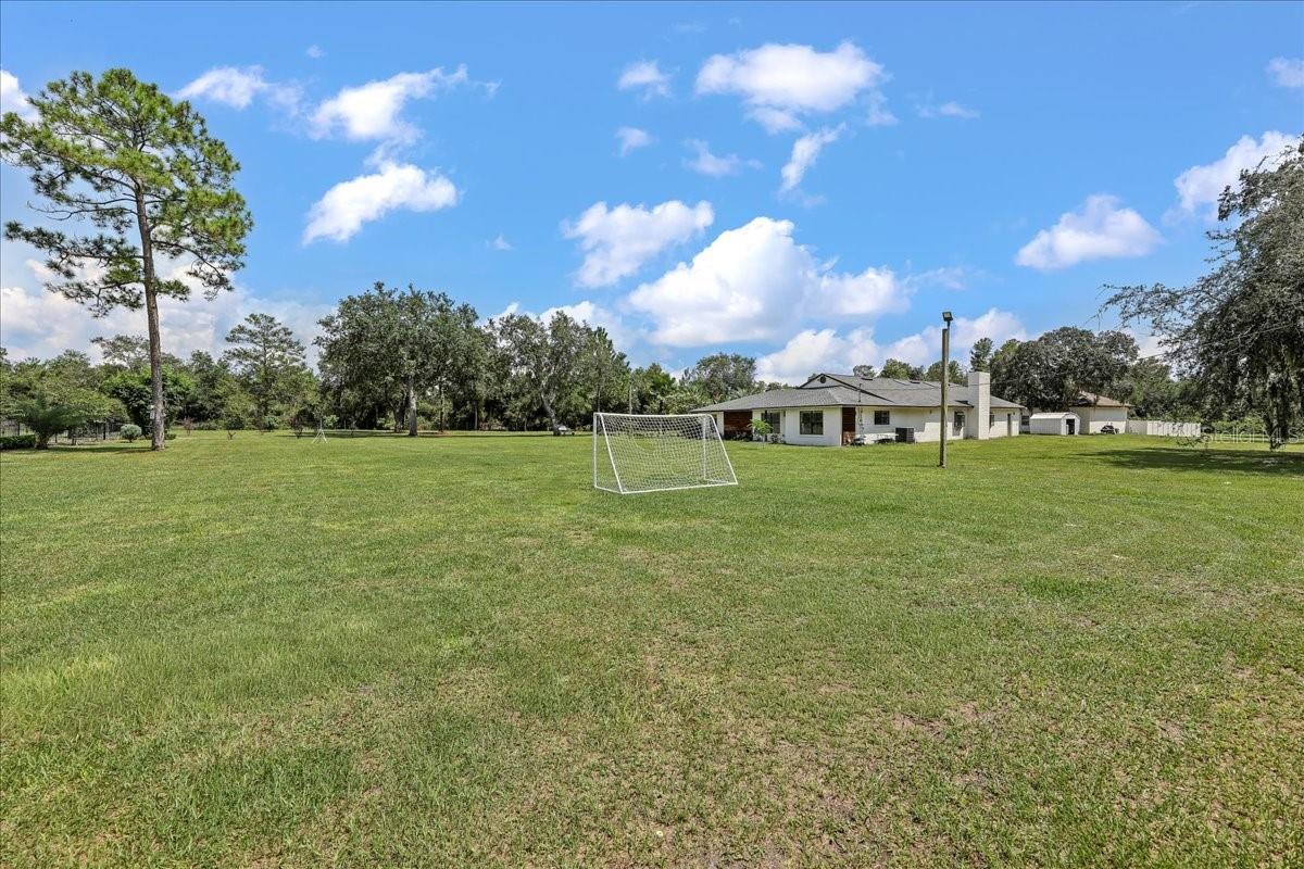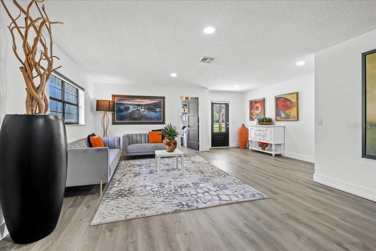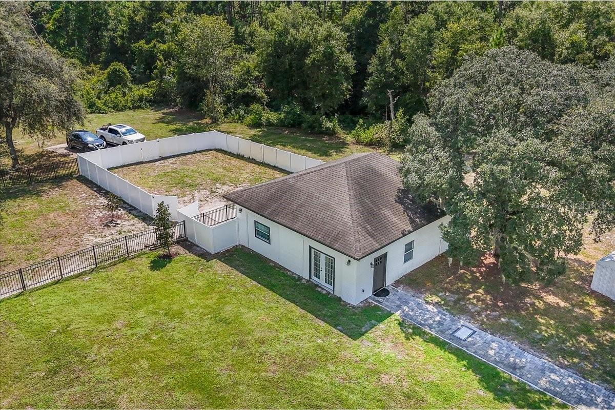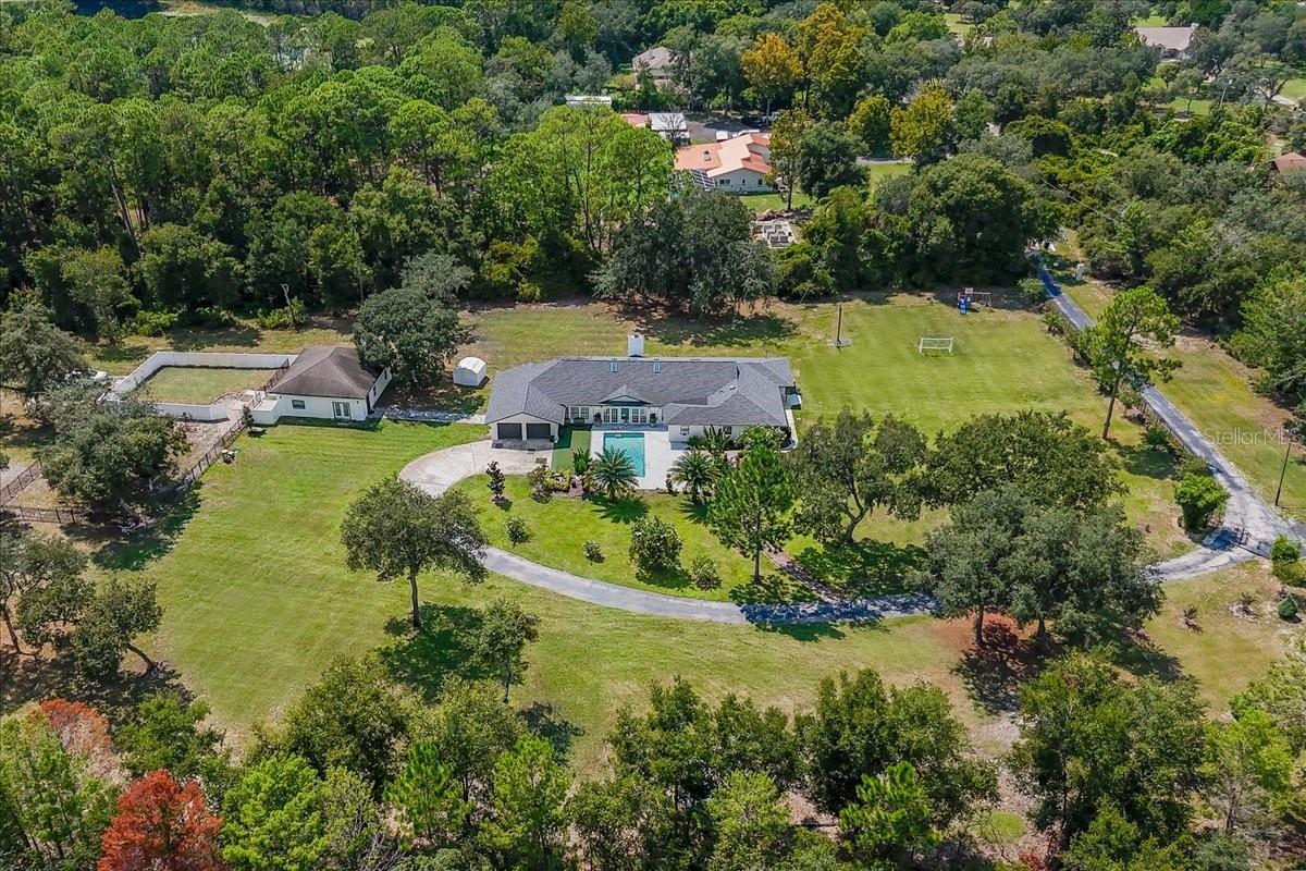 PRICED TO SELL!!! Welcome to your 5-acre private paradise, where every detail has been designed to elevate the way you live. This is more than a home—it’s a lifestyle. A rare estate that offers the privacy of a ranch, yet sits only minutes away from the best shopping, dining, and everyday conveniences. Step inside and be greeted by soaring 12-ft cathedral ceilings, where sunlight pours into an open floor plan that feels both grand and welcoming. At the center, the chef’s kitchen is a true showpiece: nearly three slabs of quartz cascade over a 10-ft island, ready for family gatherings, elegant dinners, or casual mornings with coffee. High-end appliances, double ovens, marble backsplash, apron sink, and an oversized walk-in pantry make it as functional as it is beautiful. The primary suite is your private sanctuary, spanning over 600 sq.ft. Imagine ending your day in a spa-inspired bath with a freestanding tub, oversized wet room, Bluetooth sound system, and glowing dual vanity mirrors that create an atmosphere of pure relaxation. Throughout the home, LED lighting brings a soft glow to every room, while the entire property transforms at night with powerful corner floodlights that illuminate the estate like a private resort. Even better—this is a fully integrated smart home: from your phone, you control the lights, air conditioning, pool pump, and even the garage doors of both houses. Convenience and technology at your fingertips. Beyond the main home, a 1,200 sq.ft. in-law/guest house offers crown molding, luxury new flooring, smart A/C, and its own fenced backyard—perfect for guests or multi-generational living. The property also features a 3-ton split unit in the garage and an additional 2-ton split unit in the guest house, providing extra cooling and a reliable backup system. Step outside and discover the magic of this property: Mature fruit trees where you can enjoy fresh harvests straight from your backyard. Floodlit grounds that create a stunning evening ambiance. Fully fenced corner lot at the end of a private road for peace and security. Direct access to Bill Keller Park, where trails, tennis, basketball, baseball, and soccer fields await your family. And while you live surrounded by nature, you’re only minutes from life’s conveniences: gym (4 min), Publix (4 min), Walmart (5 min), Home Depot (5 min), Target, banks, and dining—all within reach. This estate is not just a home. It’s the rare combination of design, privacy, technology, and lifestyle. A place where every day feels like a retreat. Schedule your showing and fall in love today.