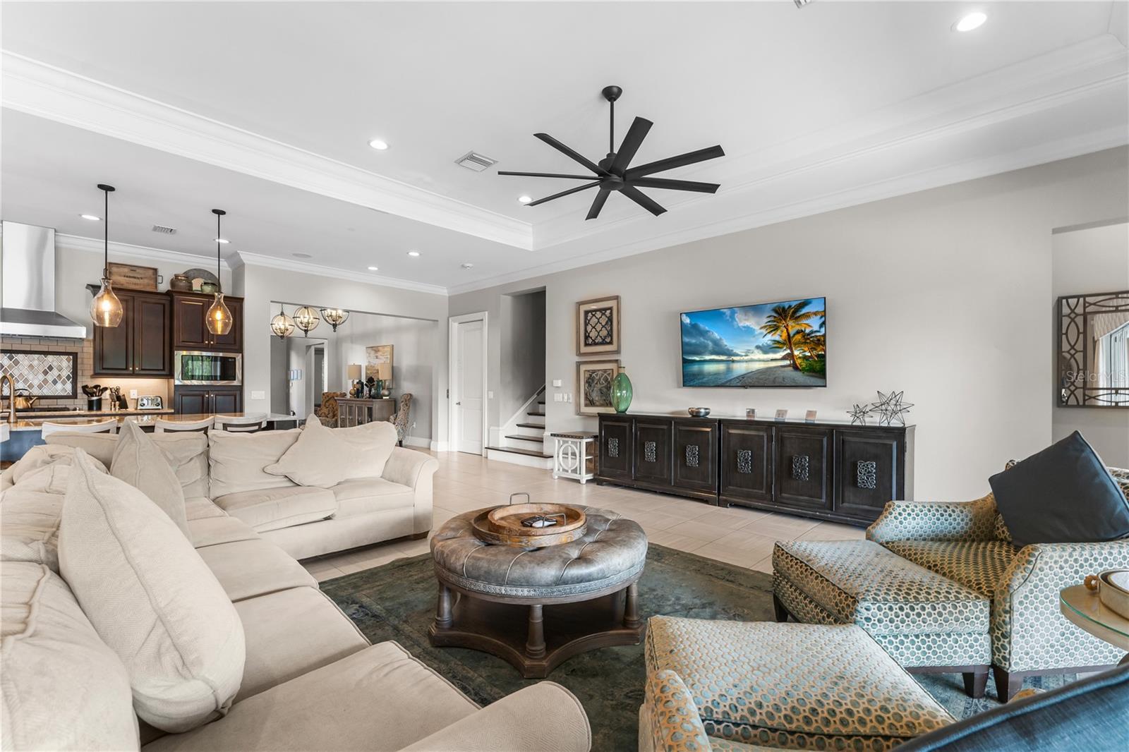 - Built-in Features, Ceiling Fans(s), Coffered Ceiling(s), Crown Molding, Eat-in Kitchen, Elevator, High Ceilings, Kitchen/Family Room Combo, Living Room/Dining Room Combo, Open Floorplan, Primary Bedroom Main Floor, PrimaryBedroom Upstairs, Stone Counters, Thermostat, Tray Ceiling(s), Walk-In Closet(s), Window Treatments