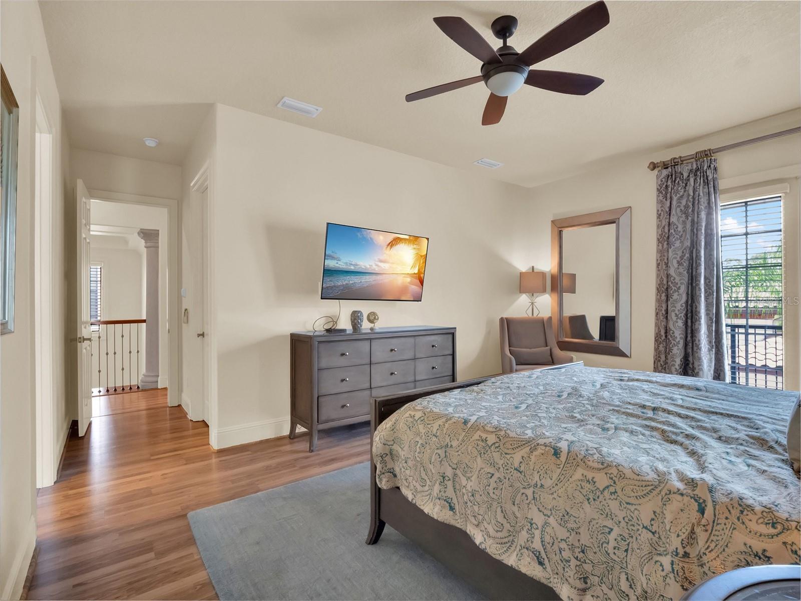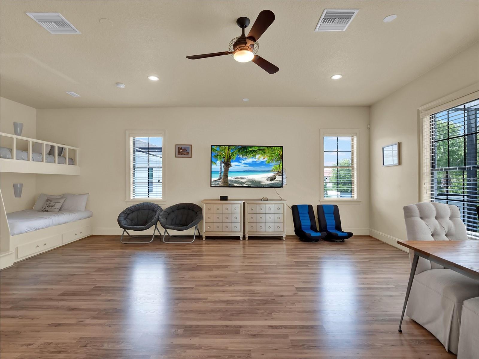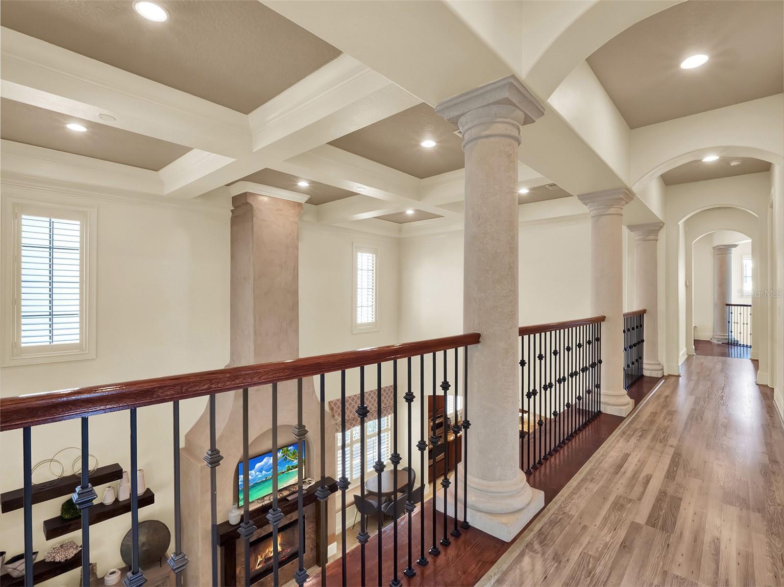 - Ceiling Fans(s), Coffered Ceiling(s), Crown Molding, Eat-in Kitchen, High Ceilings, Open Floorplan, Primary Bedroom Main Floor, Solid Wood Cabinets, Stone Counters, Thermostat, Walk-In Closet(s), Window Treatments