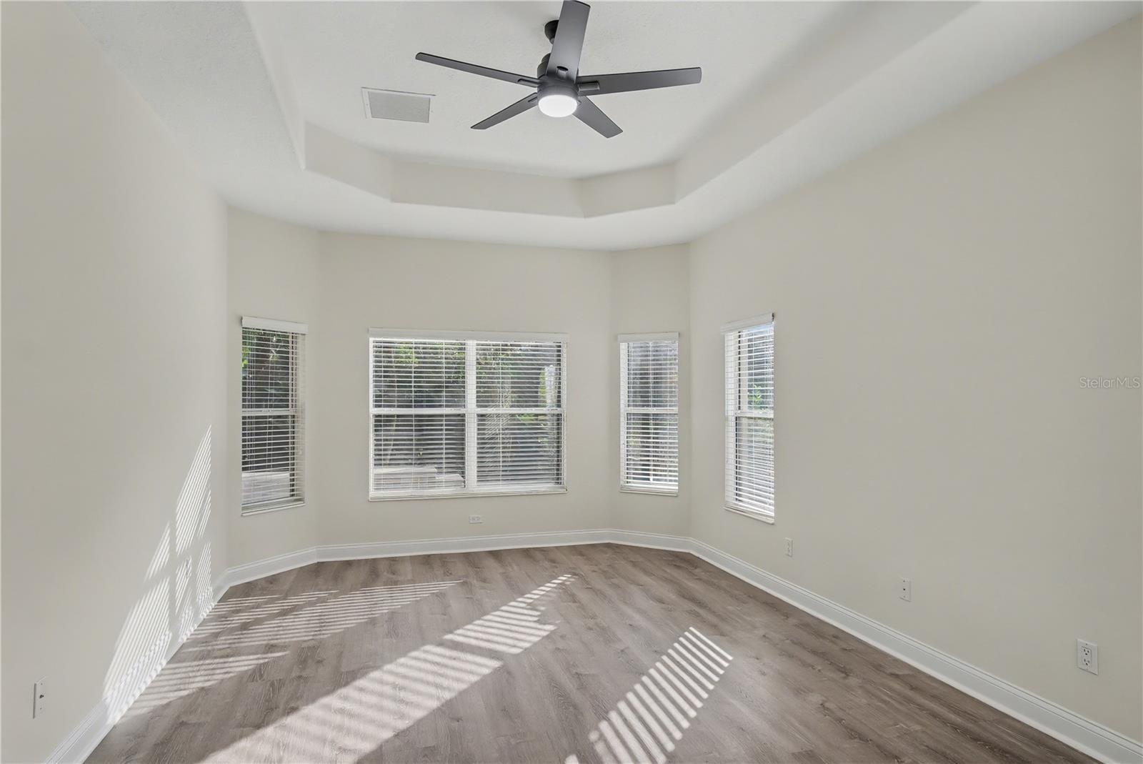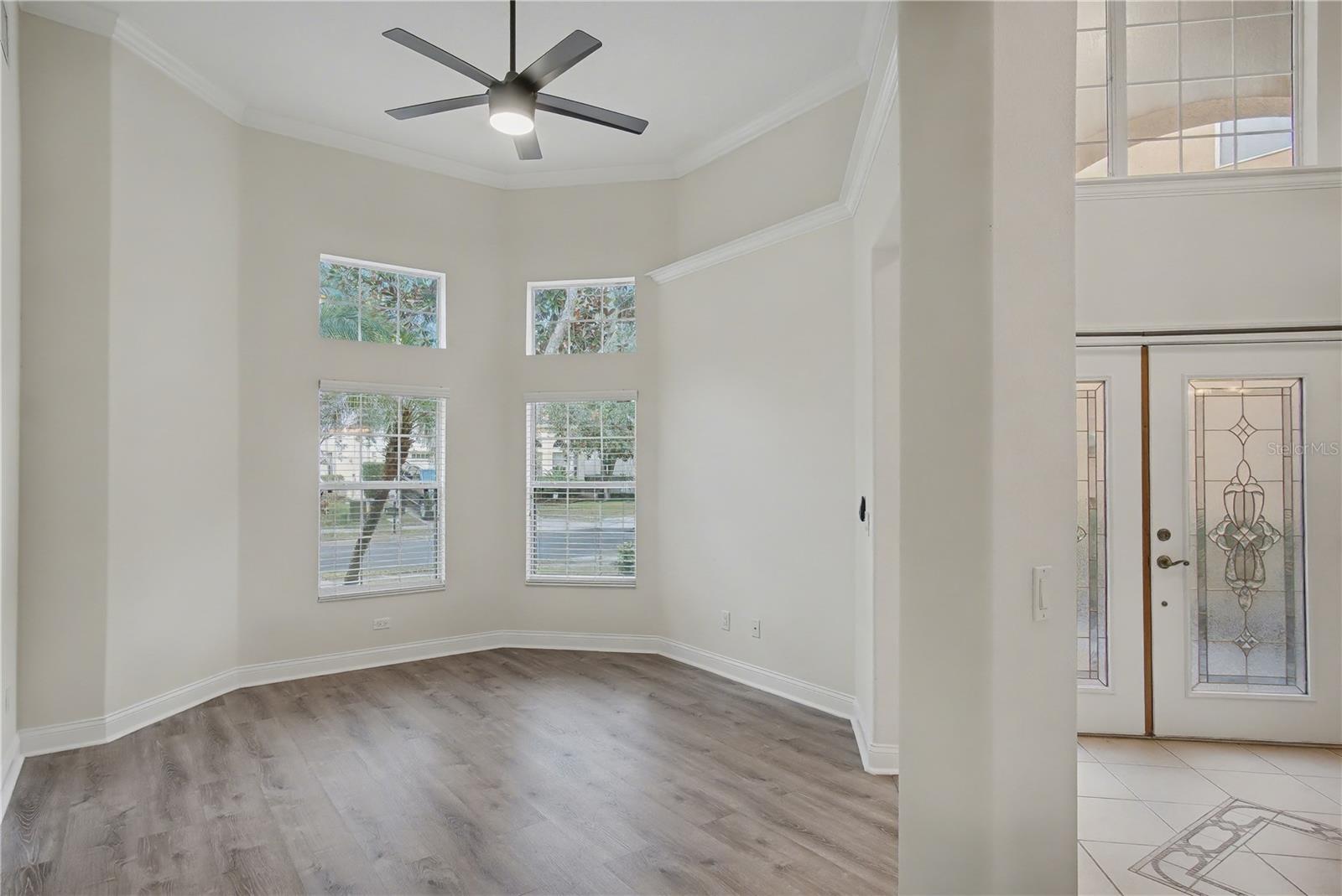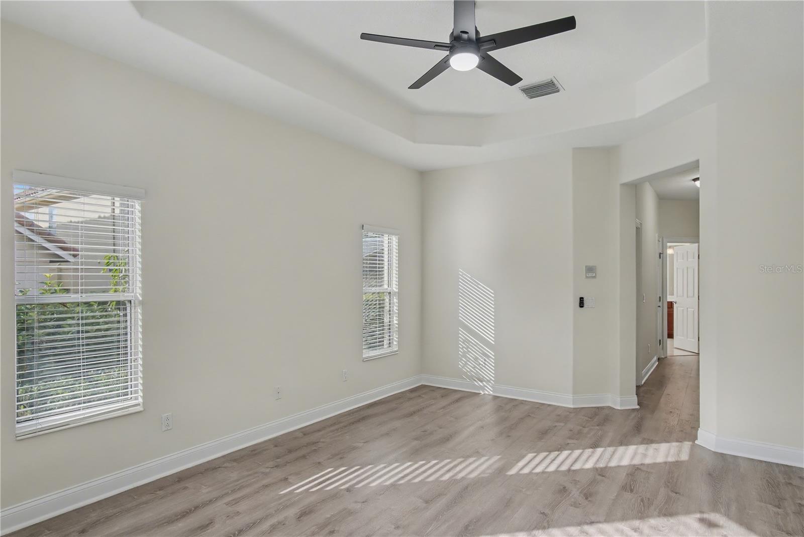- Ceiling Fans(s), Chair Rail, Crown Molding, Eat-in Kitchen, High Ceilings, Kitchen/Family Room Combo, Living Room/Dining Room Combo, Open Floorplan, Primary Bedroom Main Floor, Solid Surface Counters, Split Bedroom, Thermostat, Tray Ceiling(s), Vaulted Ceiling(s), Walk-In Closet(s), Window Treatments