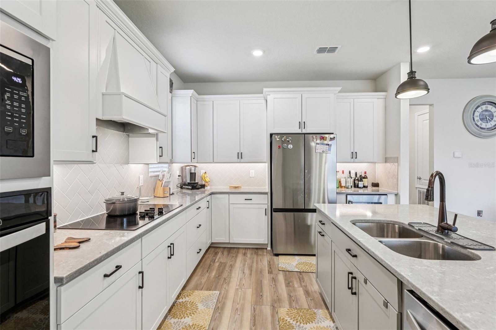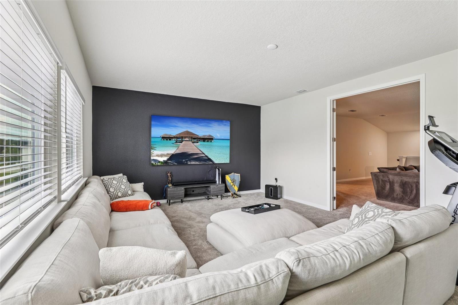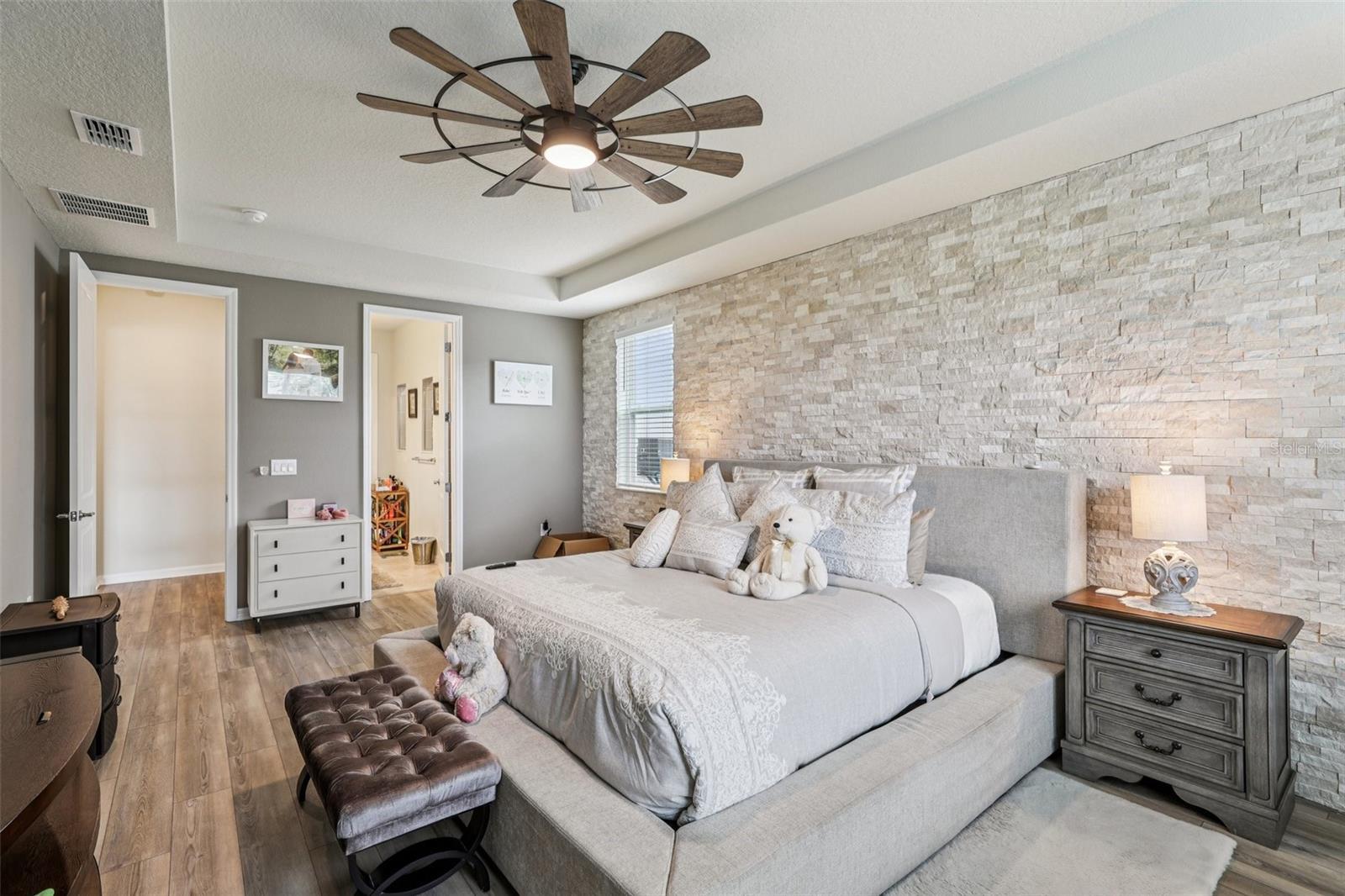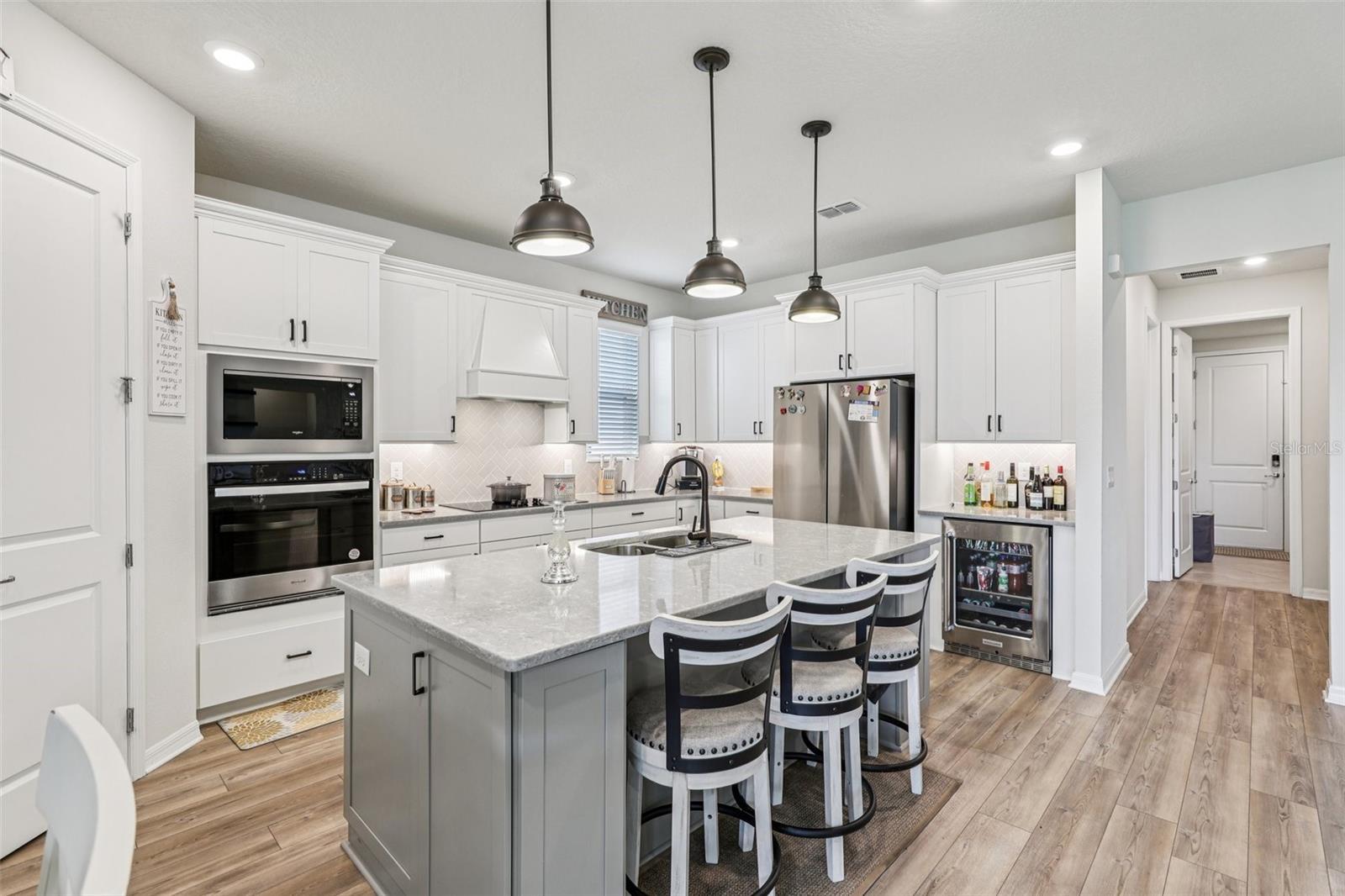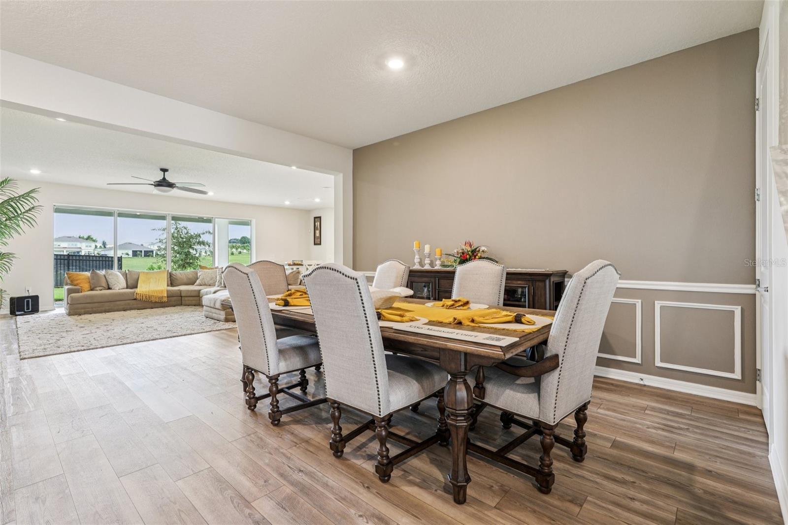 Welcome to this beautiful, like-new 2023 Pulte home, filled with custom upgrades and designed for modern living. With five bedrooms and four bathrooms, there's plenty of room to spread out in this spacious, open-concept floor plan. The main living areas and primary suite feature warm oak laminate flooring for a seamless, elegant flow. A spacious foyer leads you to a semi-private dining room with charming wainscoting. The great room is a true centerpiece, boasting a floor-to-ceiling stone fireplace with built-in shelving and opening to a stunning eat-in kitchen. The kitchen is a chef's dream, complete with upgraded cabinets, a large island with seating, stone countertops, stainless steel appliances, a tile backsplash, and an oversized walk-in pantry. A sunny breakfast nook offers the perfect spot for casual meals. The primary suite is a private retreat with a trey ceiling and a floor-to-ceiling stone wall. It features a massive walk-in closet and a luxurious en-suite with a tile shower. The main level also includes a dedicated office with glass doors, two additional bedrooms each with private en-suites, and a laundry room with a utility sink and built-in cabinetry. Upstairs, you'll find an oversized bonus/gathering room, a media room (which could serve as a sixth bedroom), two more spacious bedrooms with walk-in closets, and a full bathroom with a dual vanity and a tub-shower combo. Outdoor living is just as impressive with a paver driveway leading to a three-car garage. The covered paver patio and a nice-sized yard offer the perfect space for relaxation or entertaining. Located within the exceptional gated community of Lakeview Preserve, you'll have access to resort-style amenities, including a pool, playground, clubhouse, fitness center, and scenic trails. The home's prime location provides easy access to schools, shopping, dining, and all of Orlando's world-class attractions and amenities. Schedule a private tour!
