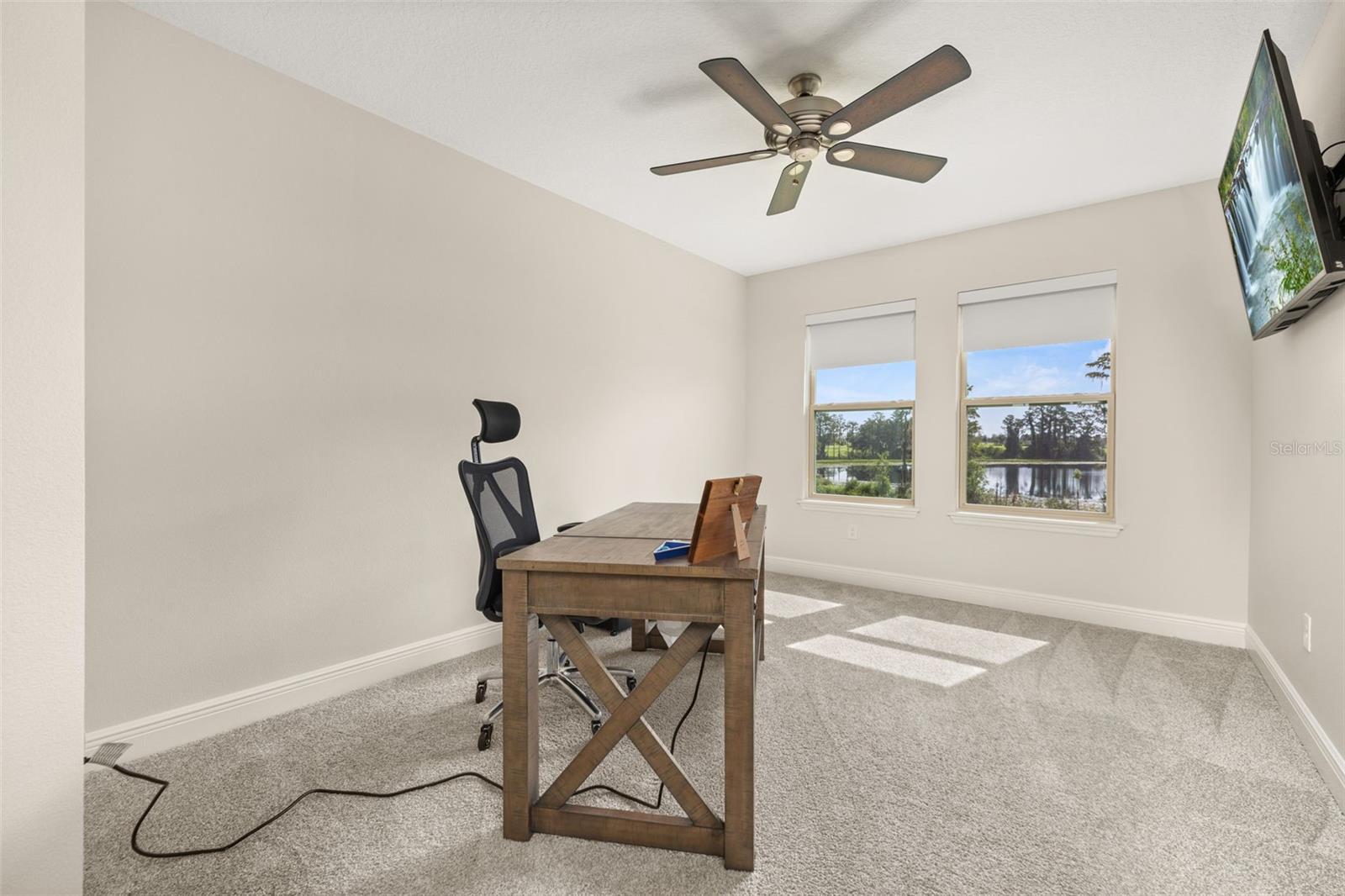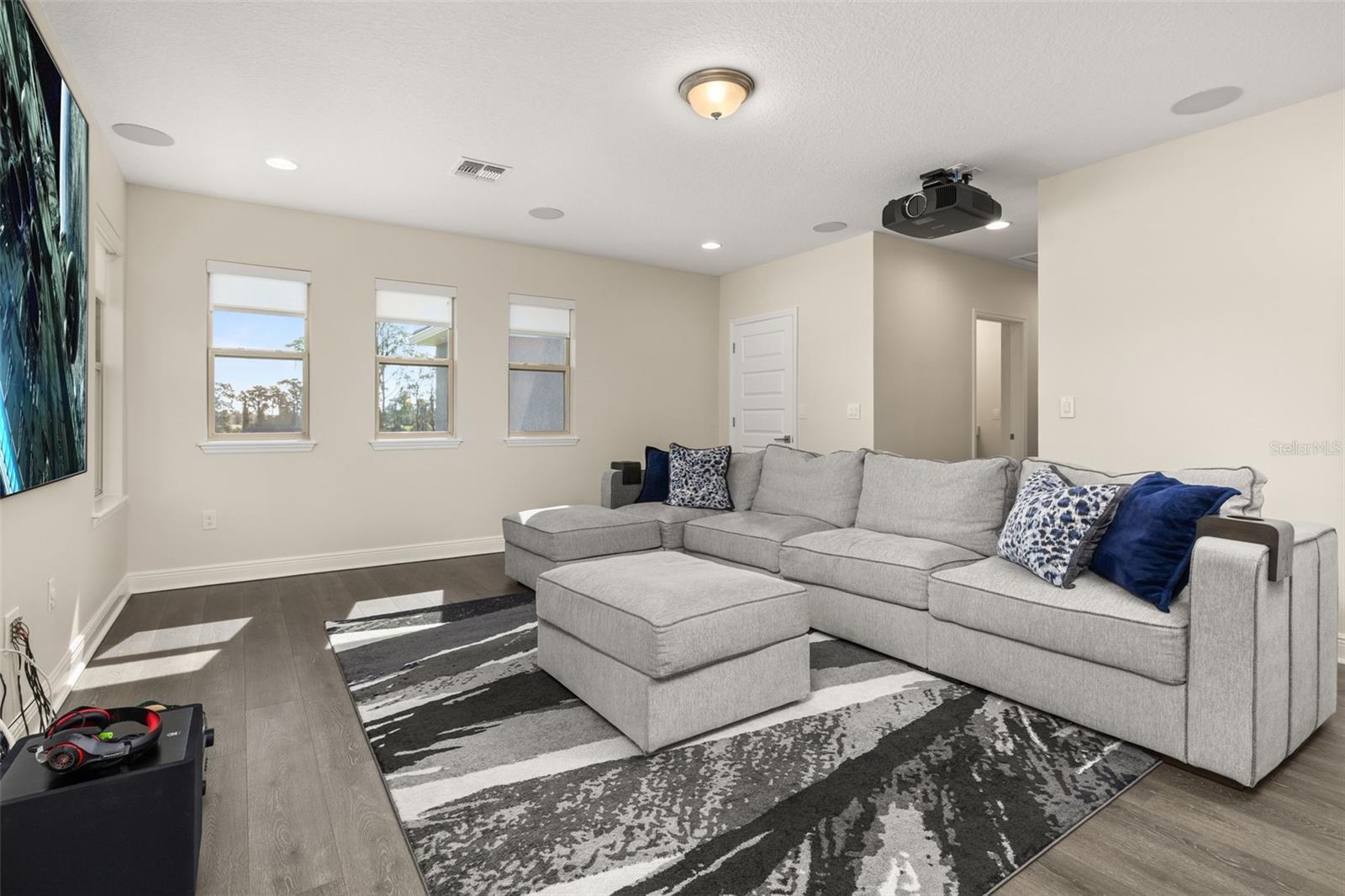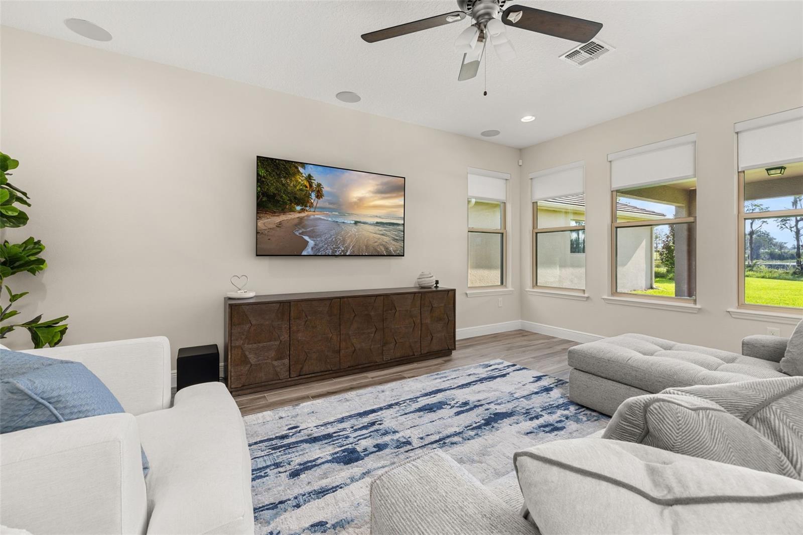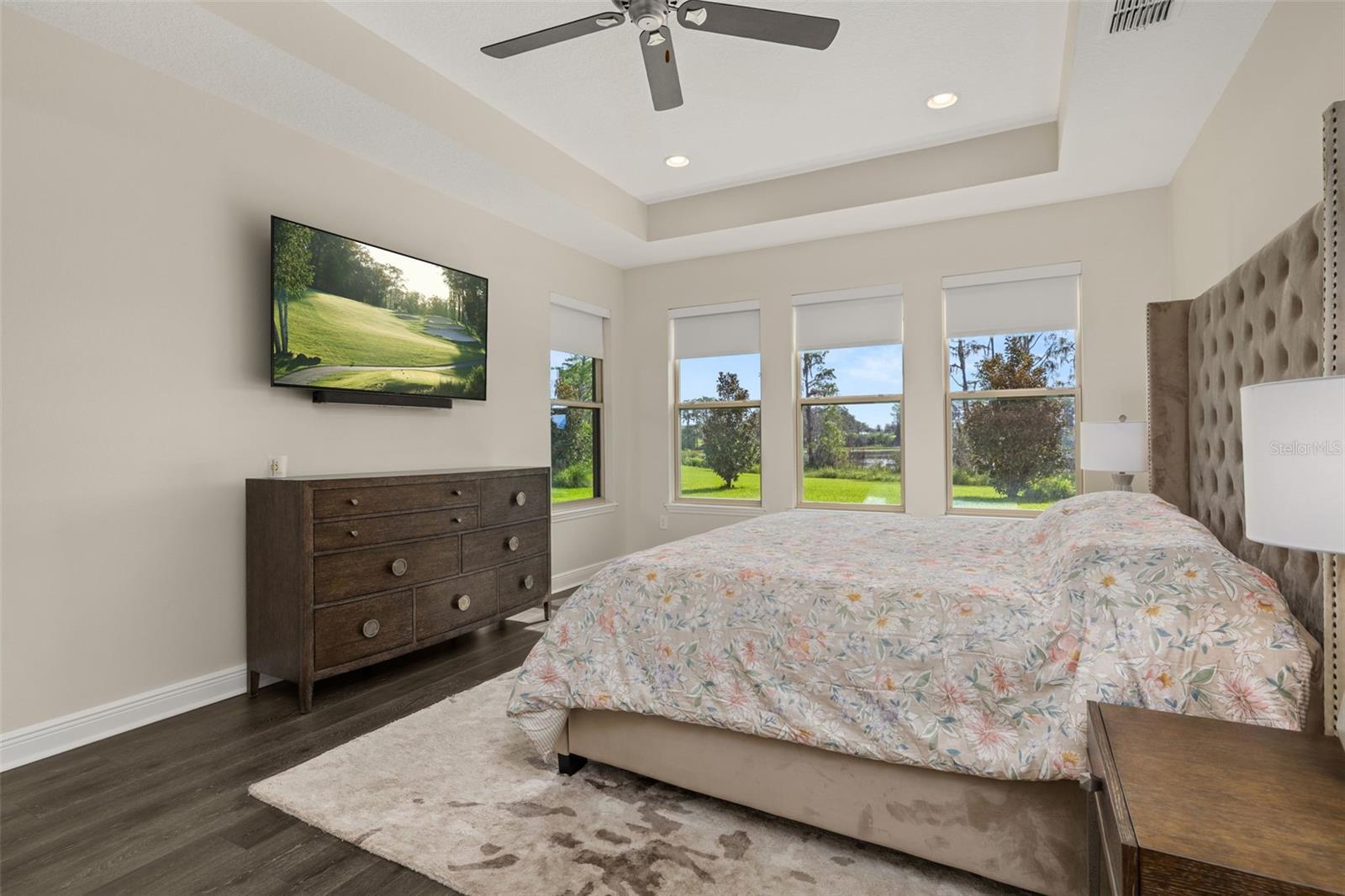 The lakefront life of grandeur awaits you in this stunningly enhanced North Haven model by DR Horton's luxury line, Emerald Homes! Structural enhancements are plentiful and include a Control4 Smart Home Automation System, custom designed closets in nearly every closet throughout the home, security system, technology operated window treatment, entire home water softener, reverse osmosis kitchen faucet, recessed lighting, tile roof for added longevity, and more! Admire the curb appeal as you walk up to your covered front porch by way of the sealed brick paver sidewalk amidst luscious landscaping maintained entirely by the HOA. Relish in the wood plank tile that floor most of the downstairs for a highly desirable look as well as ease of maintenance. To the right of the entrance is a flex space (named the formal dining room by the builder) ready for you to make of it what you want. Continue into the main living space and soak in all of the lake views through the many windows on the back of the home. The gourmet kitchen is also in this open concept space for taking in the lake views, and it is truly a home chef's dream being lined with tons of cabinetry and countertop space. The dining space is right off the kitchen overlooking those beautiful lake views. The primary suite is tucked away privately in the back of the home downstairs and contains even more opportunities for lake viewing. A tray ceiling and custom designed closet make this space even more admirable. The en suite showcases a split dual vanity, massive walk-in shower, and a garden tub that all overlook the lake. Head upstairs via an upgrade staircase lined with wrought iron spindles and luxury vinyl flooring. The loft greets you with endless opportunities of how to customize this space for your enjoyment. A ceiling-mounted projector and theater screen are included with the sale. More windows allow in natural lighting as well as the views of the lake. A Jack-and-Jill bathroom connect bedrooms 2 and 3, and both rooms feature custom designed closets. Bedrooms 4 and 5 are also upstairs and adorned with custom designed closets, and their bathroom is outside of the bedrooms and houses a dual vanity with separate water closet. Head out back where your gargantuan backyard extends from the house to the edge of the waters of Lake Ihrig. Relish in the fact that the HOA maintains this entire extended backyard so you have even more time to enjoy this outdoor space that is extremely rare in Horizon West. The tandem 3-car garage efficiently utilizes every opportunity for space. Situated in the back of the community, you truly get the best of both worlds by enjoying the peace and quiet yet also being a short walk away from the vast amount of amenities, A-rated schools, and the shopping plaza. Waterleigh is building out its final phase, and the Emerald Series is no longer offered making this an even more unique and special opportunity. Inquire today on how to make this gem your own!