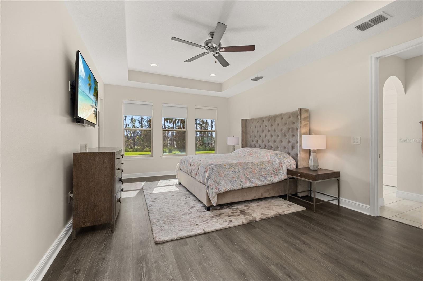 - Ceiling Fans(s), Eat-in Kitchen, High Ceilings, Kitchen/Family Room Combo, Open Floorplan, Primary Bedroom Main Floor, Stone Counters, Thermostat, Tray Ceiling(s), Walk-In Closet(s), Window Treatments