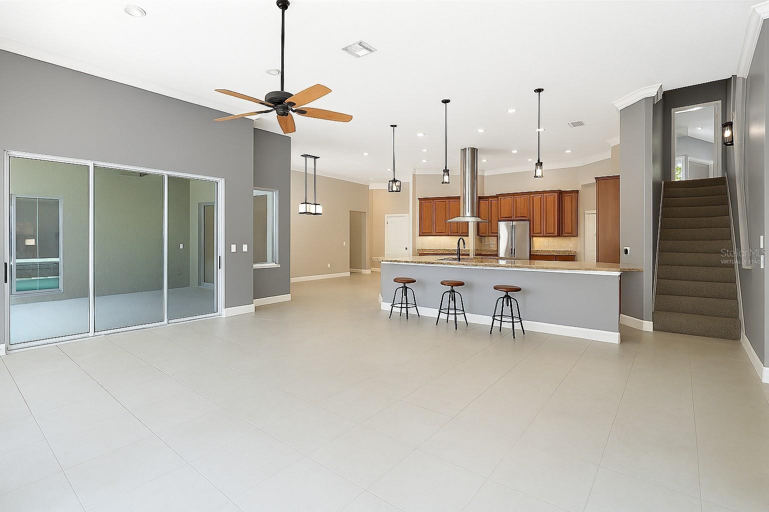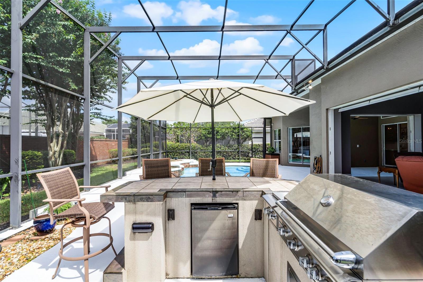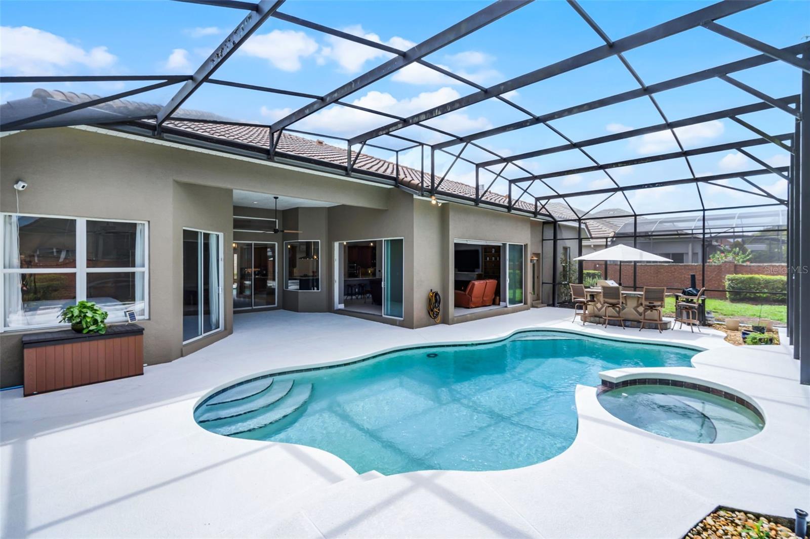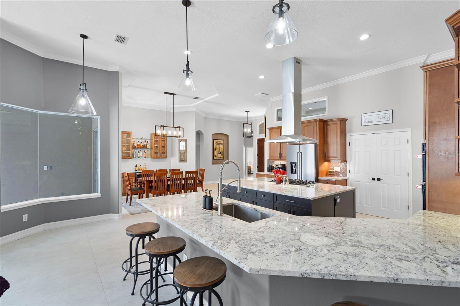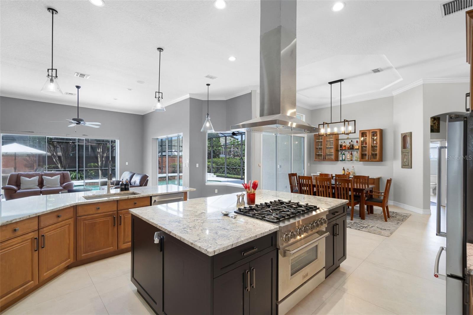 One or more photo(s) has been virtually staged. Step into a world where elegance meets modern style and convenience in this extensively renovated custom Reiche Silliman home. The real plus is that the renovation has already been done so you do not have to do the work or suffer through the inconvenience, mess, and expense of the process of making this home shine! All this and the home is perfectly situated in the ever-popular gated community of Kensington Park in the desirable Dr. Phillips area of Orlando. From the moment you arrive, the classic curb appeal impresses with a tile roof, established landscaping and a side entry 3-car garage with a driveway with room for families with multiple cars. Inside, the open concept design and smart home capability create a modern lifestyle experience. From the welcoming foyer, you get a relaxing view through the main living areas out to the pool and patio area beyond. To either side of the foyer, are the dedicated home office with front facing view which is ideal for working from home and a private guest suite with a full bath offering flexibility for visitors or multigenerational living. The heart of the home is the chef-inspired kitchen, completely reimagined with upscale finishes that also provide maximum functionality. The features include a 6-burner gas range with state-of-the-art quiet range hood, two large pantries and abundant cabinetry, large center work island with heavy duty custom roll out shelving, and a separate breakfast bar with stainless steel farmhouse style sink and pendant lighting. This exceptional culinary space flows seamlessly into the dining and living rooms. The dining room features a built-in bar and beverage center; the living room has built in shelving and cabinets, a cozy modern gas fireplace and stacking glass patio doors blending indoor and outdoor living with the screened lanai, pool and spa, and the sun-filled patio for a resort style entertaining experience. The primary bedroom suite is a serene retreat with pool views, a spa inspired bath with soaking tub, walk in shower, dual sink vanity and two generous walk-in closets. Bedrooms 3 and 4 share a beautifully updated bath which also serves as the pool bath. Upstairs, a versatile bonus room/ fifth bedroom with bath and closet is ideal for teens, or a home theater, game room or work out area. The main floor laundry room has a utility sink and modern ventless washer/dryer. Kensington Park offers community amenities including sport courts and a playground. The neighborhood is convenient to nearby top-rated schools, groceries, upscale dining and shopping, and the ever-popular Restaurant Row. You can also venture a bit farther to head to the attractions that Orlando is known for or hop on the convenient highways to explore all that living in Central Florida offers. Do not miss this rare opportunity—schedule your private tour today!