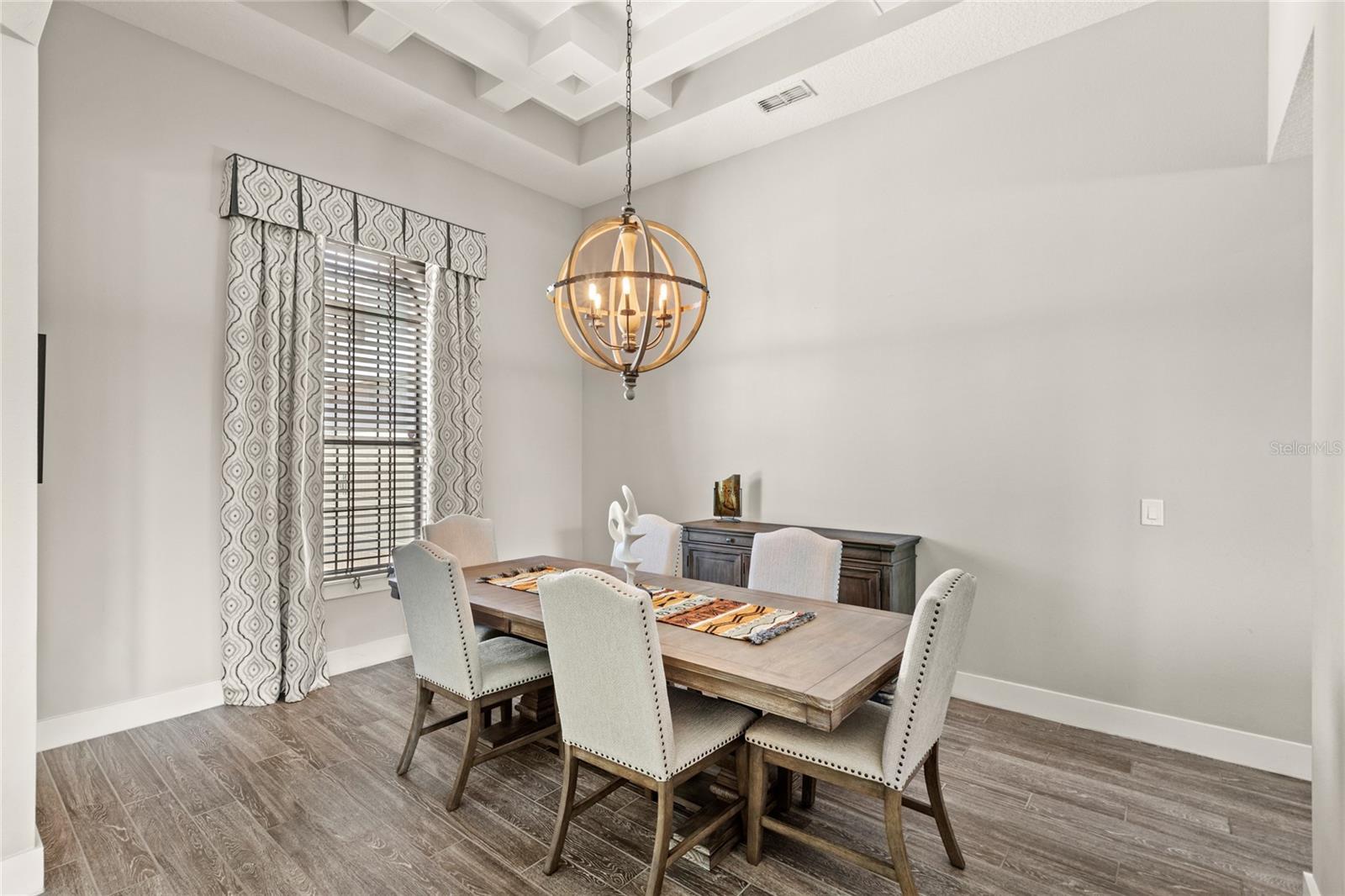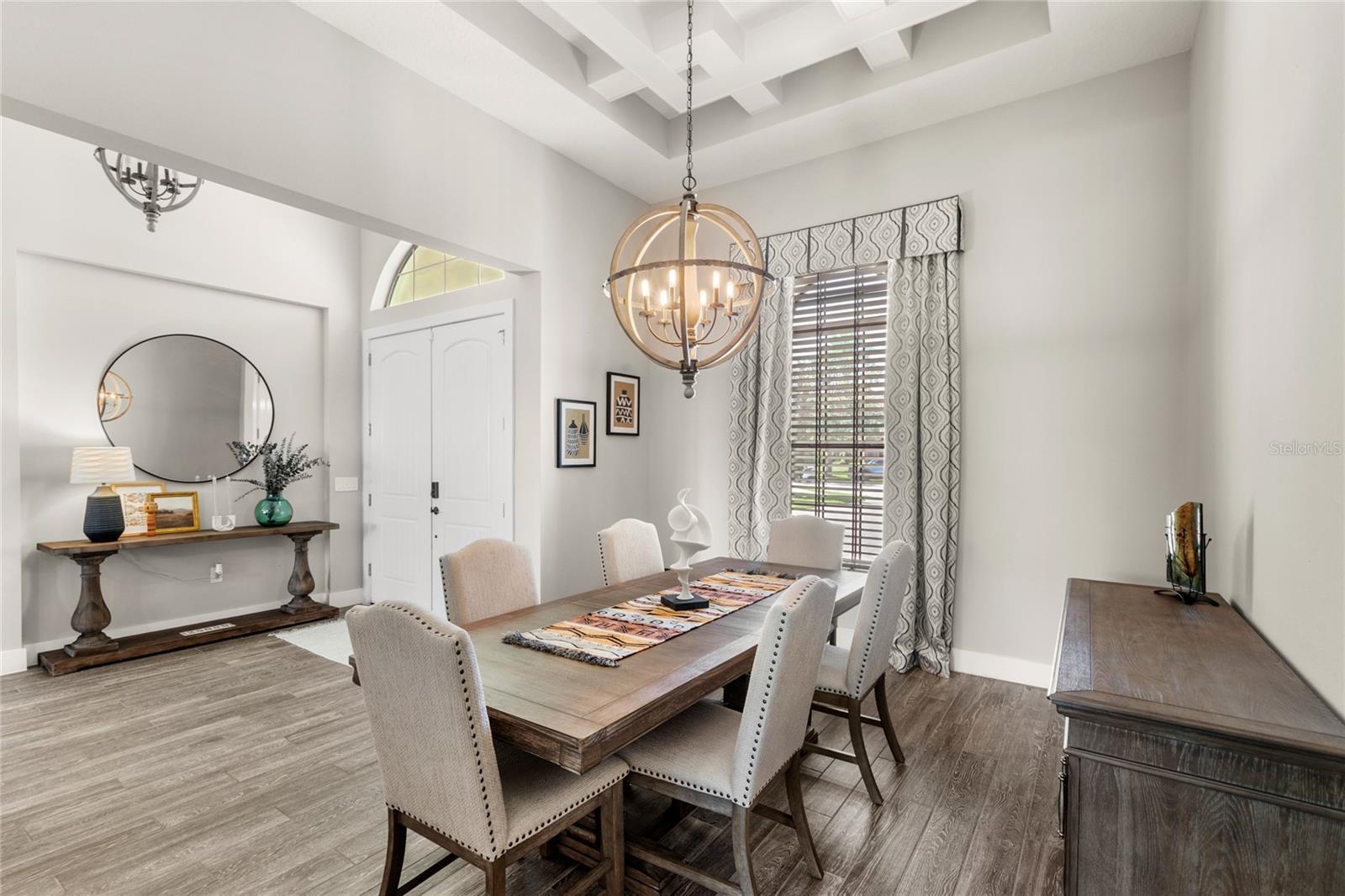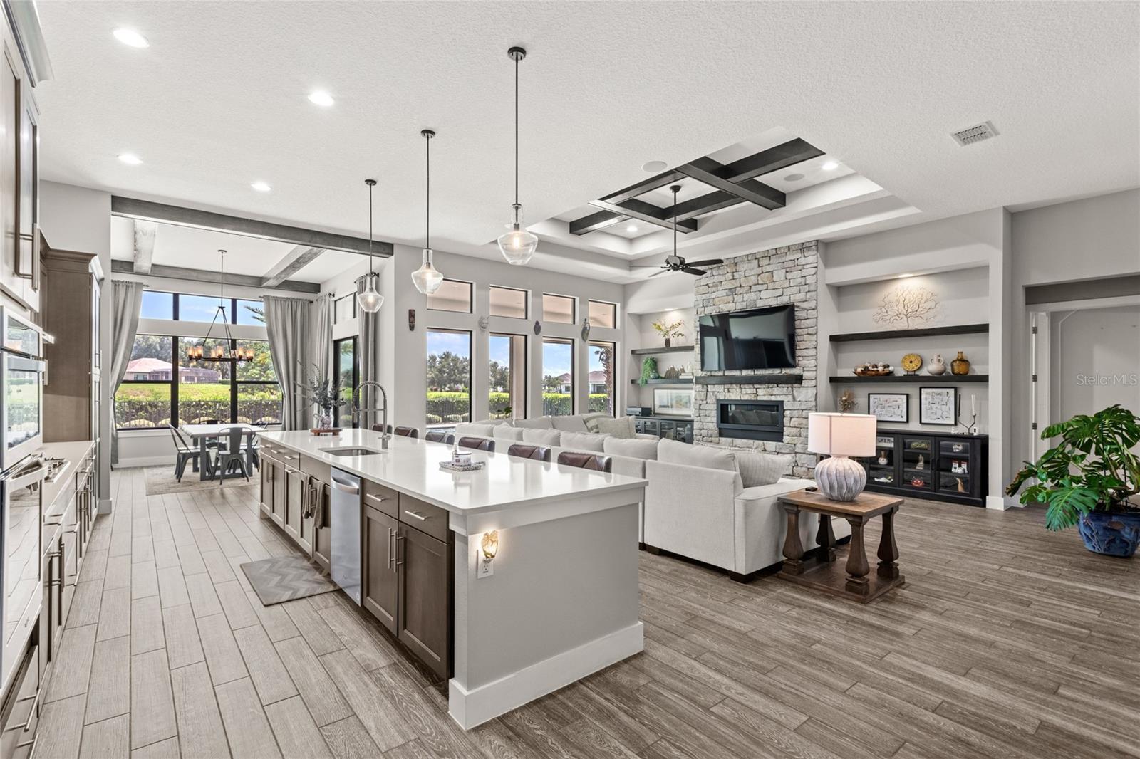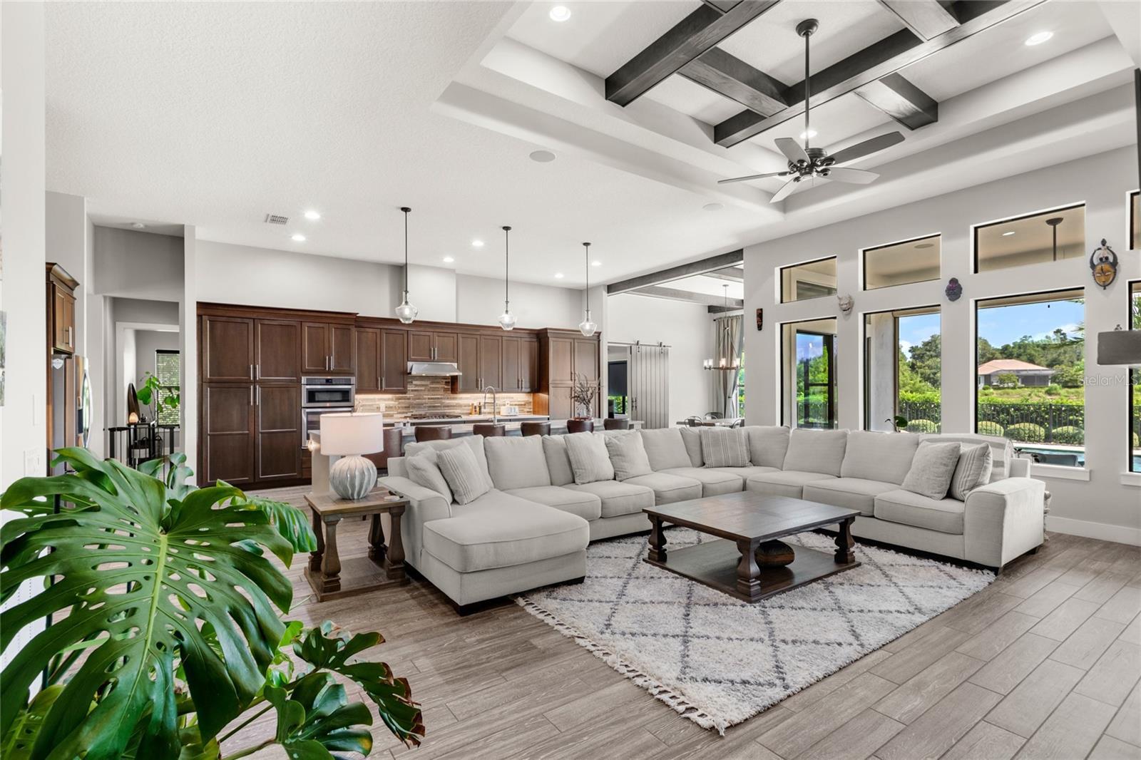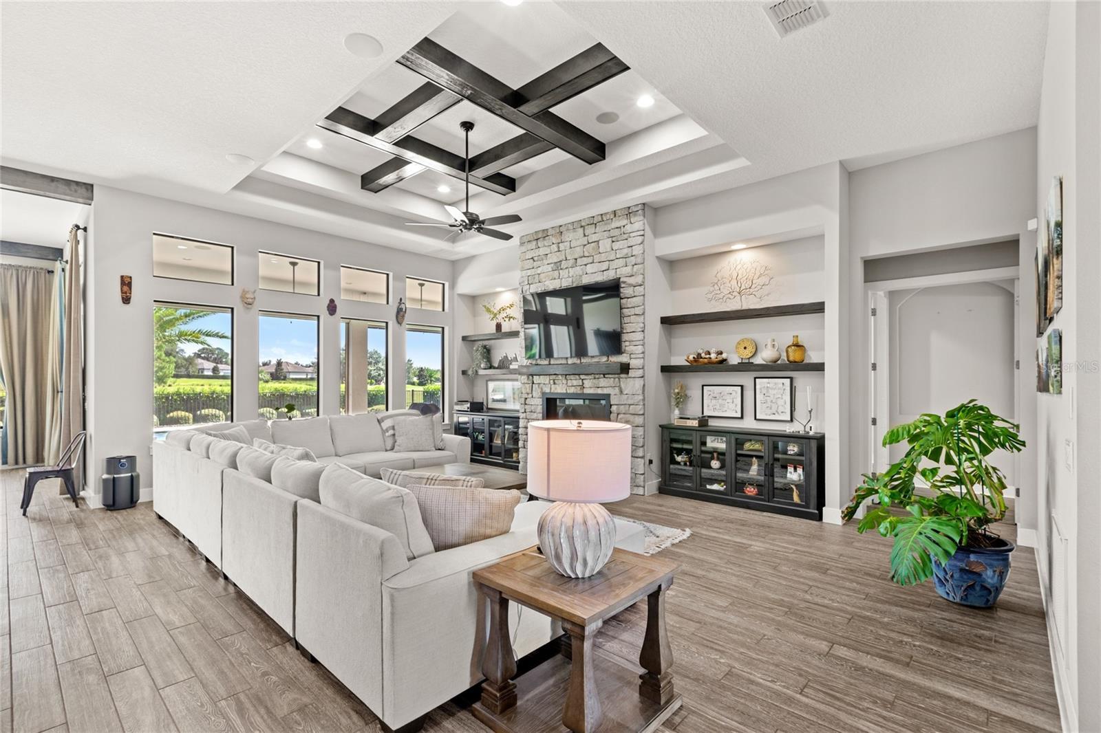- Built-in Features, Ceiling Fans(s), Coffered Ceiling(s), Eat-in Kitchen, High Ceilings, Kitchen/Family Room Combo, Open Floorplan, Primary Bedroom Main Floor, Solid Surface Counters, Split Bedroom, Tray Ceiling(s), Walk-In Closet(s)
