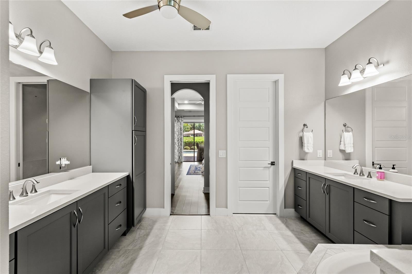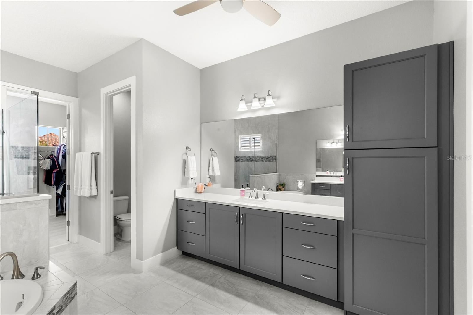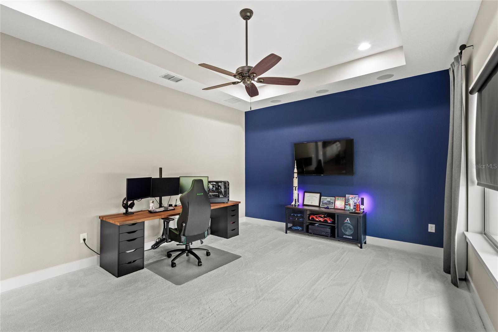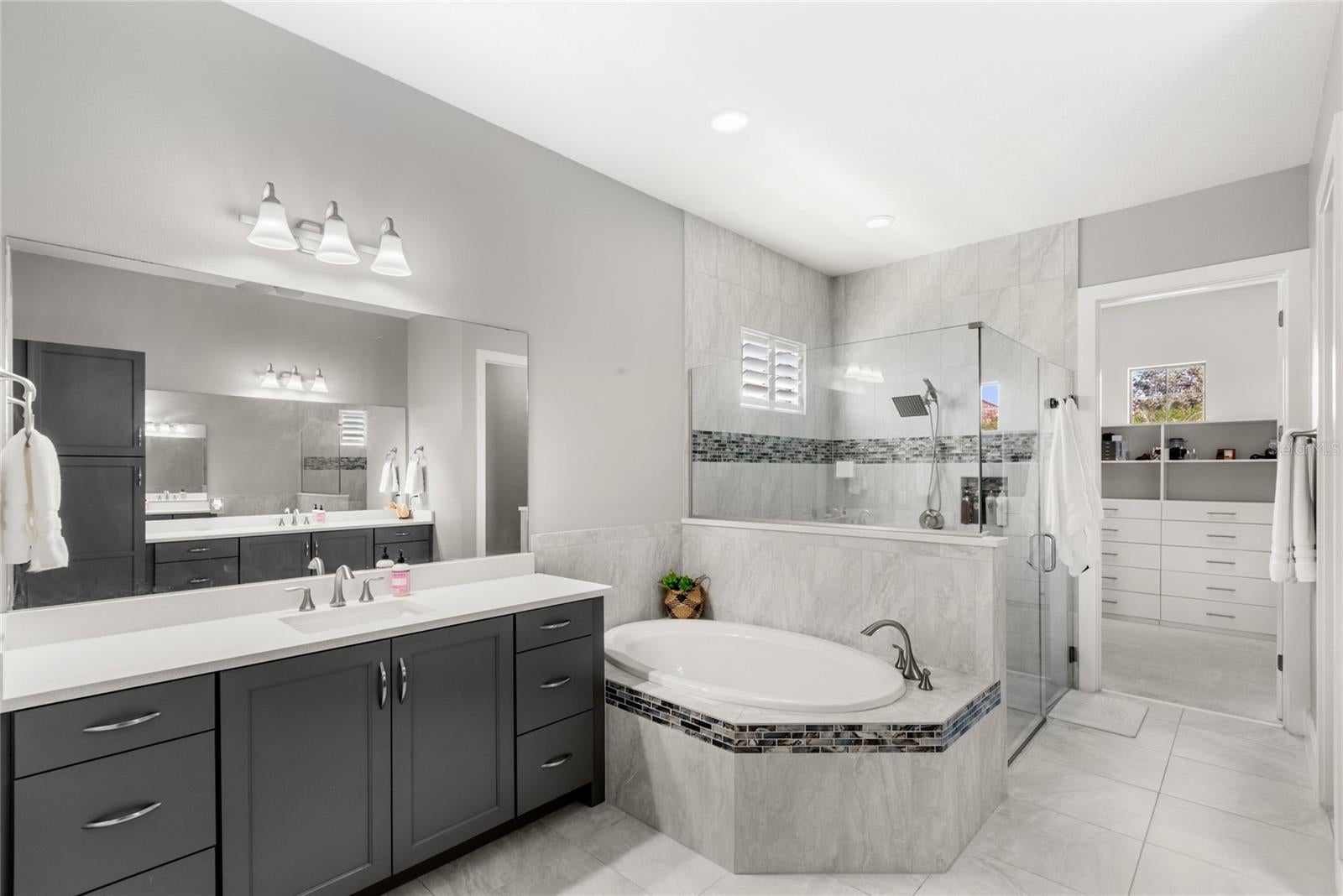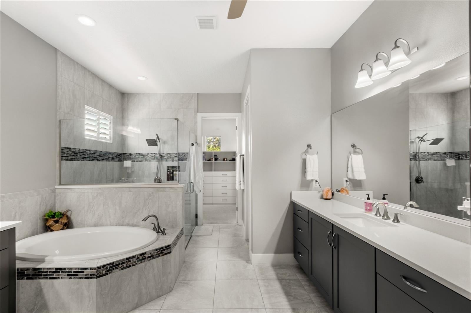 - Built-in Features, Ceiling Fans(s), Coffered Ceiling(s), Eat-in Kitchen, High Ceilings, Kitchen/Family Room Combo, Open Floorplan, Primary Bedroom Main Floor, Solid Surface Counters, Split Bedroom, Tray Ceiling(s), Walk-In Closet(s)