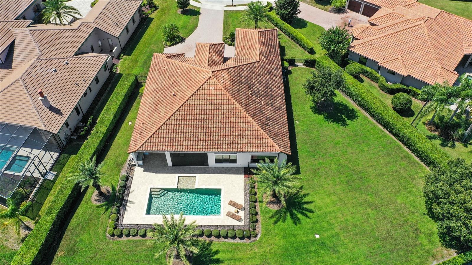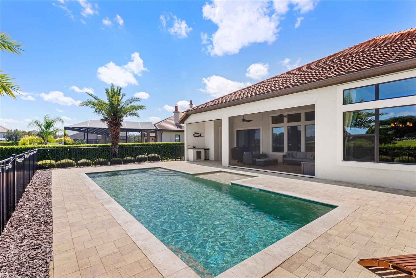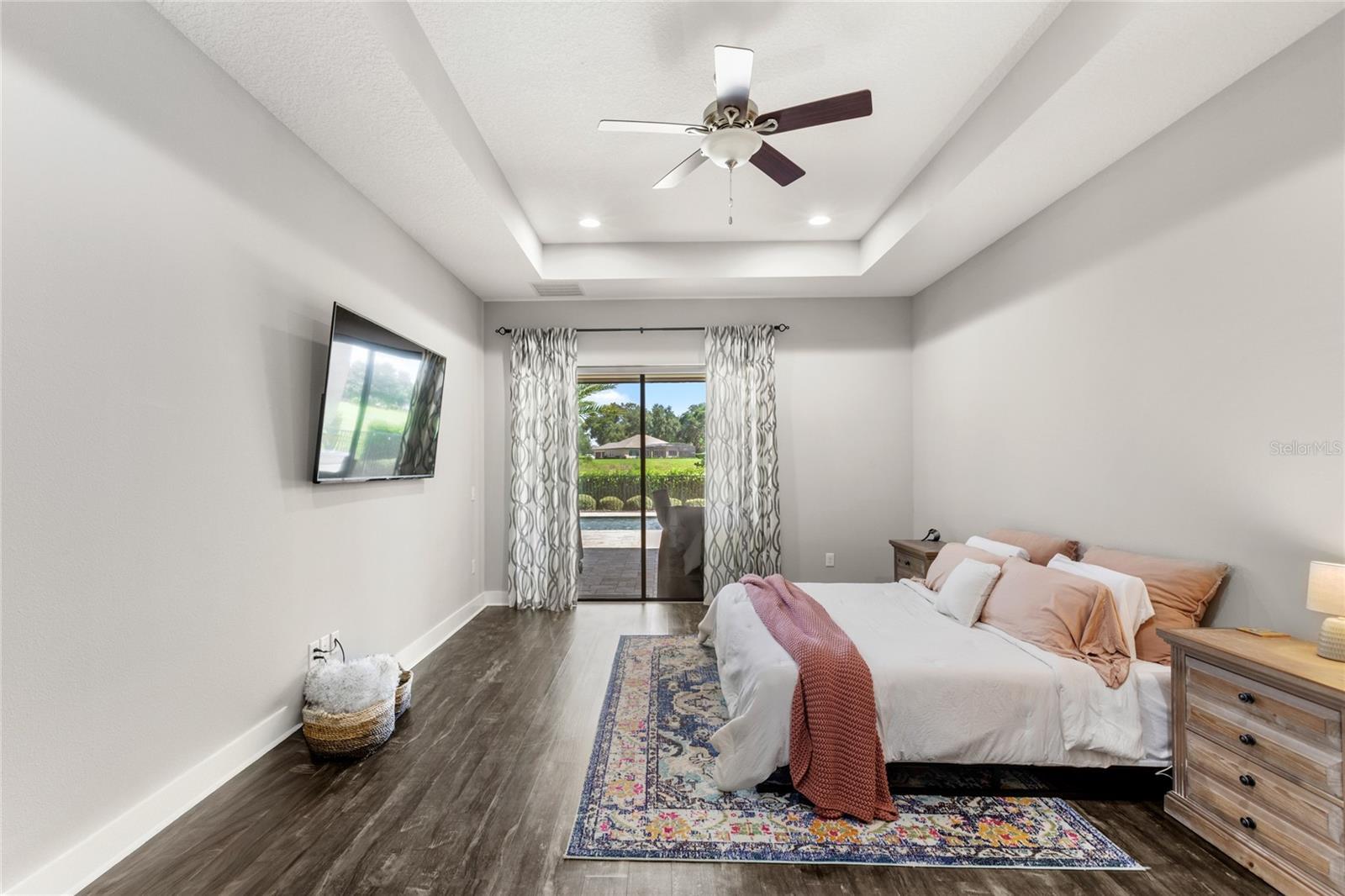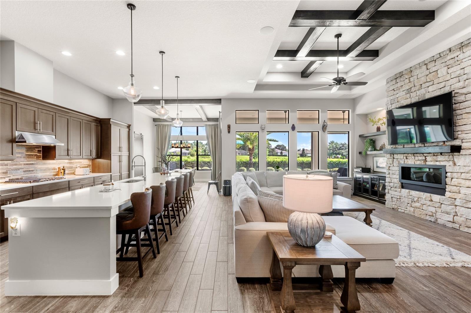 Welcome to 25609 Grandview Pointe! Built in 2017, this stunning single story, 4-bedroom, 4.5-bathroom home spans 3,500 square feet, and is located in the gated community of Red Tail. Situated in a cul-de-sac, on a homesite that is over half an acre, the home overlooks Bear’s Pond and the 11th hole of the golf course. Inside, the grand foyer opens to rich wood-look plank tile flooring, a formal dining room, and soaring 12-foot ceilings with custom wood beams, anchored by a stone fireplace. Expansive walls of windows fill the open-concept living areas with natural light, seamlessly connecting the gourmet kitchen, great room, and breakfast nook to the outdoor living space. The kitchen is the standout feature of the home, featuring quartz countertops, a 15 foot long island, upgraded stainless steel appliances, and extended solid wood cabinetry. The kitchen layout flows to the covered lanai, which features retractable screens, and overlooks the pool, pond and golf course views. The primary suite is complete with a breathtaking en-suite, which includes a soaking tub, walk-in shower, and dual vanities. The space is also complete with an oversized walk-in closet that has brand new carpet, and custom closet built-ins. The secondary bedrooms are situated on the opposite side of the home, offering a functional split floor plan. A flexible bonus room, which was freshly re-painted, sits between guest bedrooms two and three. This space would serve well as a playroom, hobby space, or home office. At the entrance to guest bedrooms two and three is a full bathroom with a shower. The third bedroom has its own en-suite. Guest bedroom four is across from the formal dining room, and has access to its own full bathroom, with a shower. Each of the bathrooms features upgraded tile that extends to the ceiling, and each guest bedroom (plus the media room and primary closet) features brand-new and upgraded carpet. The media room is complete with blackout shades and a barn doors, and could even serve as a 5th bedroom, if needed. Outdoors, the pool and paver patio offer the ideal space for outdoor entertaining. The pool is complete with water features and a sun shelf. There is a half bathroom outside for easy access from the pool. The yard is surrounded by mature and well manicured landscaping. Additional features of the home include: a 3-car garage with custom motors and taller garage doors, a yard surrounded by hedges, a dedicated laundry room with cabinetry and a drop zone, sealed pavers and a water filtration system. All of these features with a hard-to-beat location! Convenience is a huge part of living in Red Tail. Located only minutes to the 429 Expressway and 15 mins from Downtown Mount Dora, access in and out is easy. PLUS the Wekiva parkway extension is fully open, allowing you to drive from Red Tail all the way to I4 in Lake Mary in only 15 minutes. This is your chance to take advantage of the world-class lifestyle that the Red Tail has to offer, while also enjoying all of the nearby amenities that living in Sorrento brings to you. Call today to schedule your private tour.