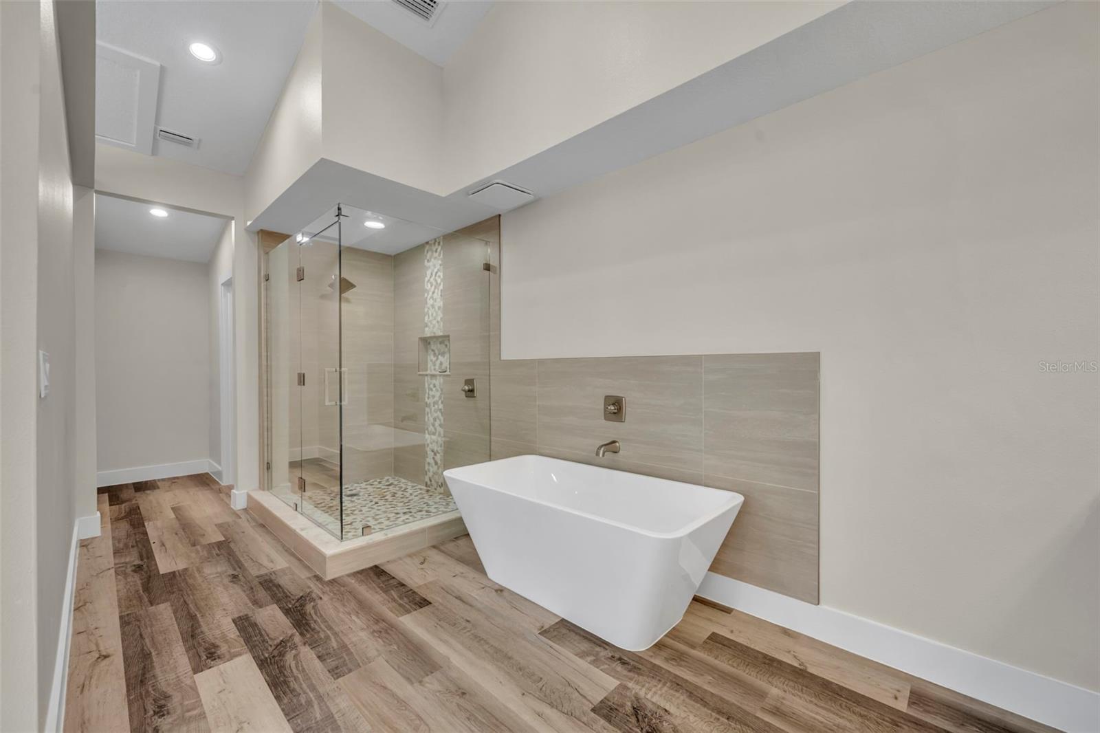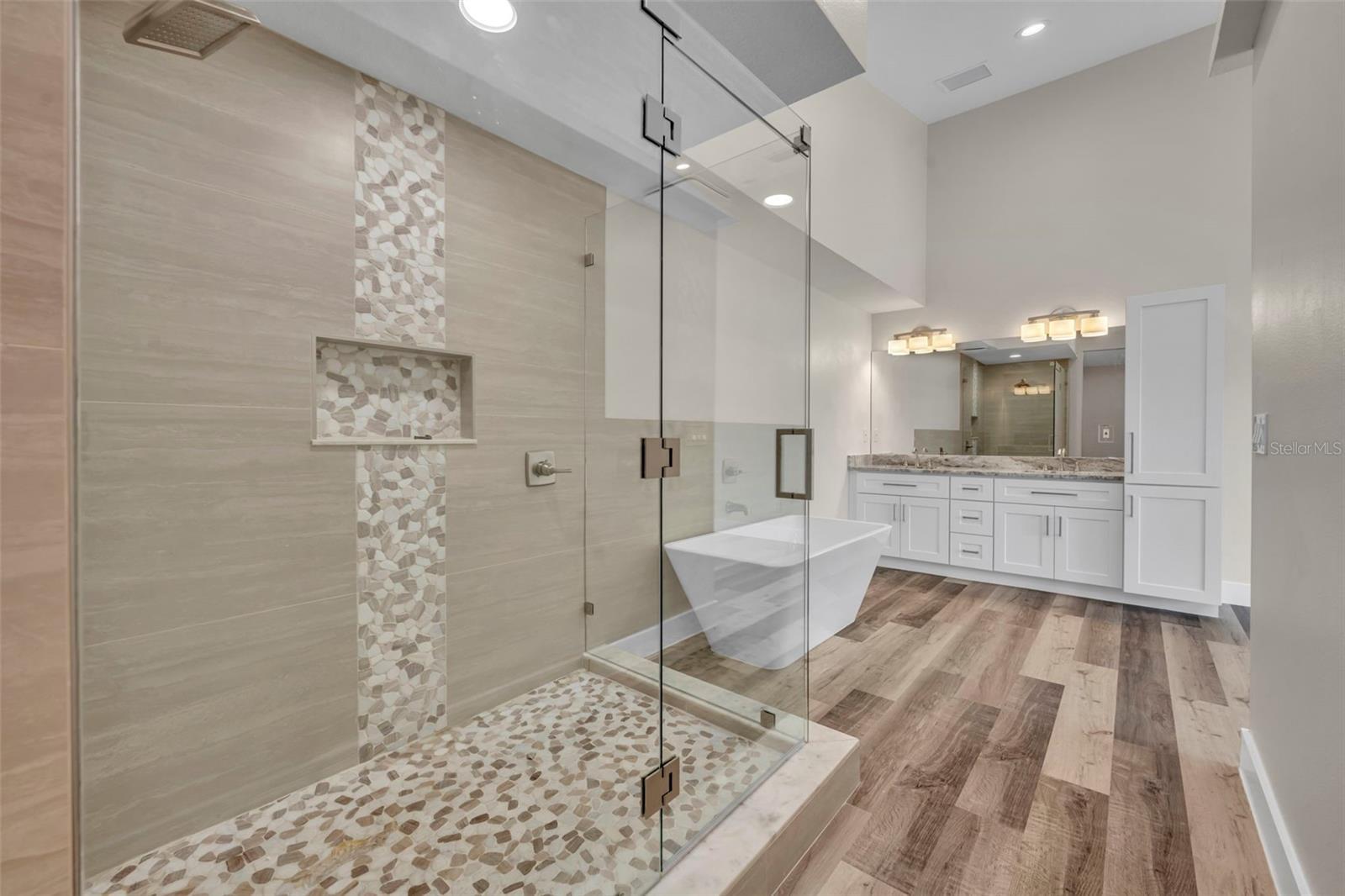 - Ceiling Fans(s), Dry Bar, Eat-in Kitchen, High Ceilings, Kitchen/Family Room Combo, Open Floorplan, Primary Bedroom Main Floor, Solid Wood Cabinets, Split Bedroom, Stone Counters, Thermostat, Vaulted Ceiling(s), Walk-In Closet(s)