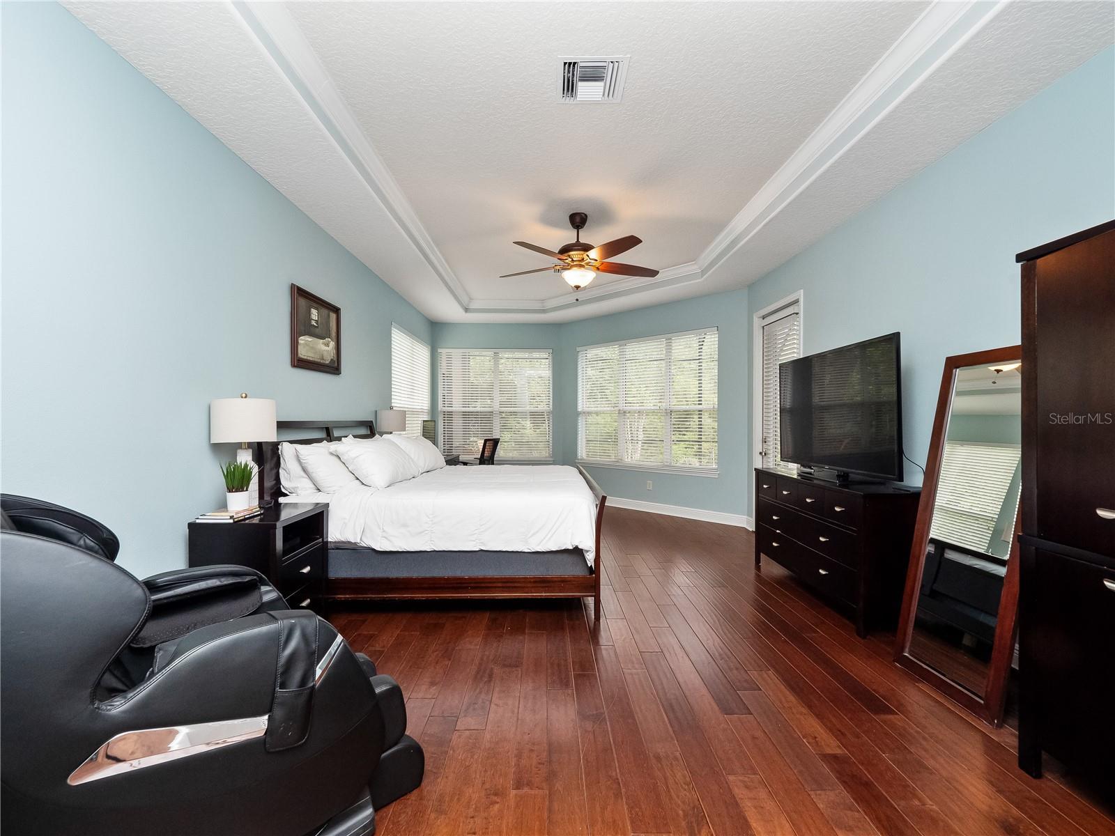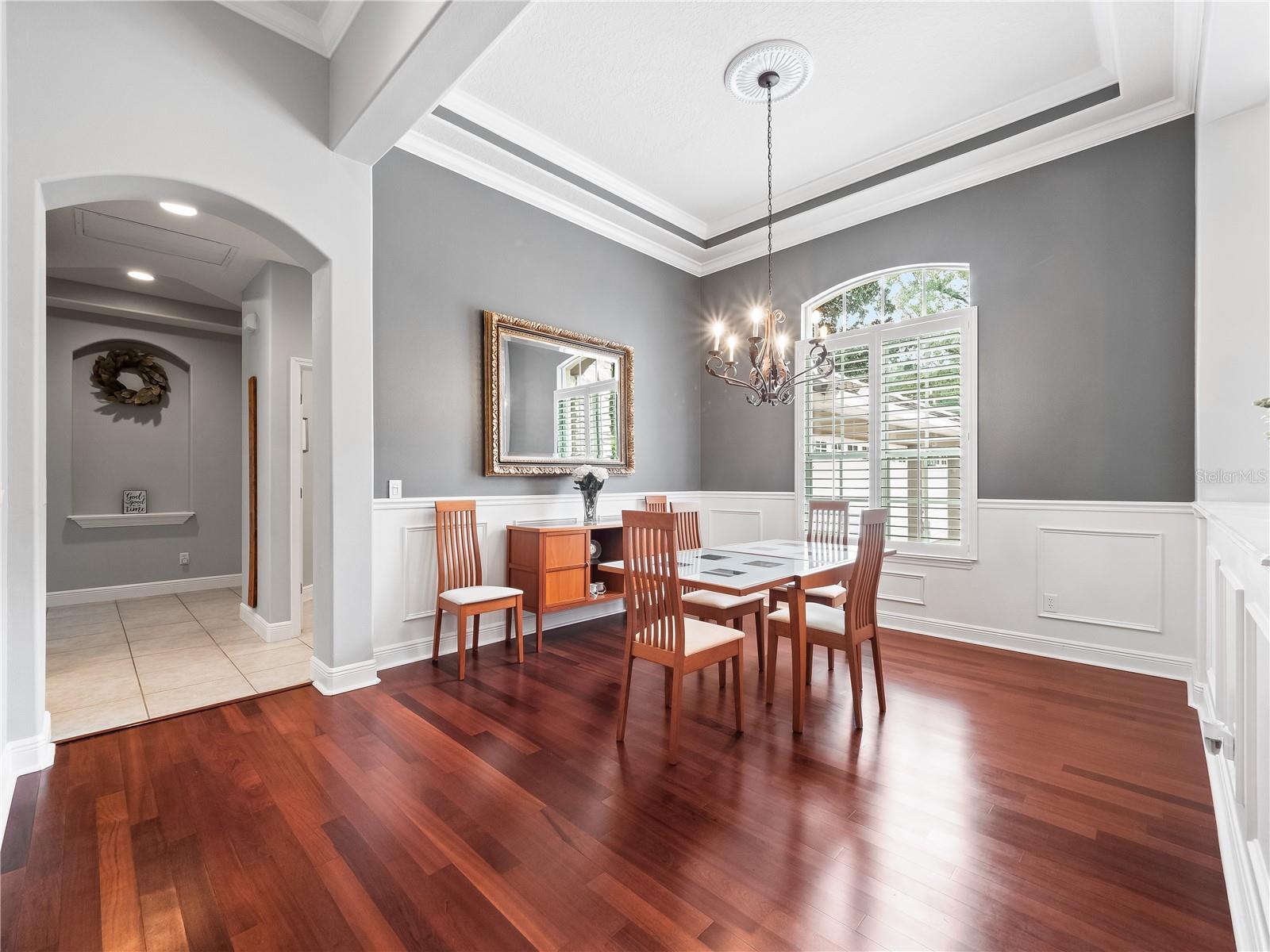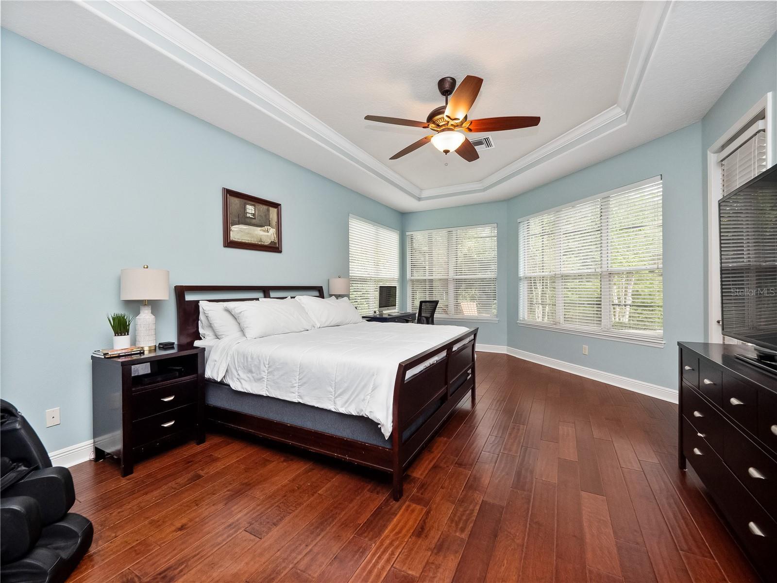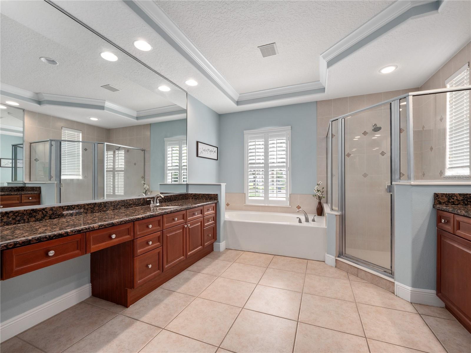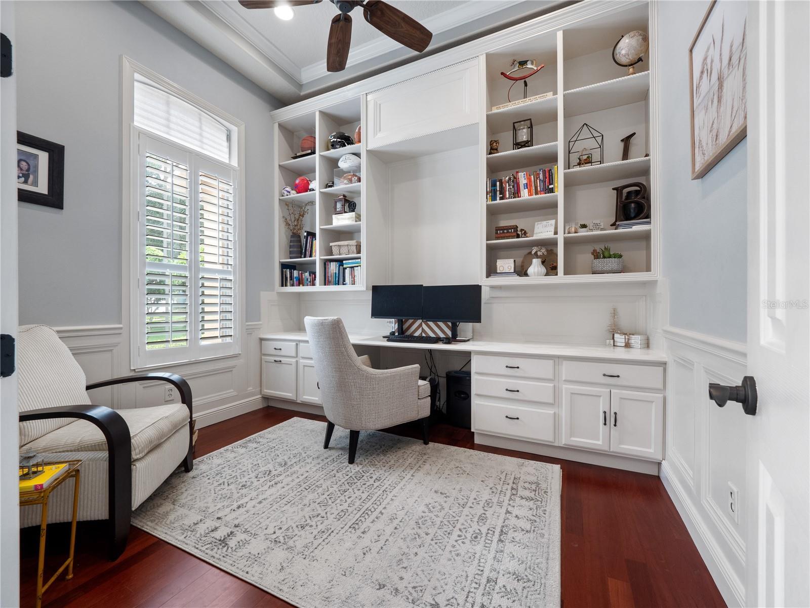 - Built-in Features, Ceiling Fans(s), Crown Molding, Eat-in Kitchen, High Ceilings, Kitchen/Family Room Combo, Living Room/Dining Room Combo, Open Floorplan, Primary Bedroom Main Floor, Solid Wood Cabinets, Split Bedroom, Stone Counters, Tray Ceiling(s), Walk-In Closet(s), Window Treatments