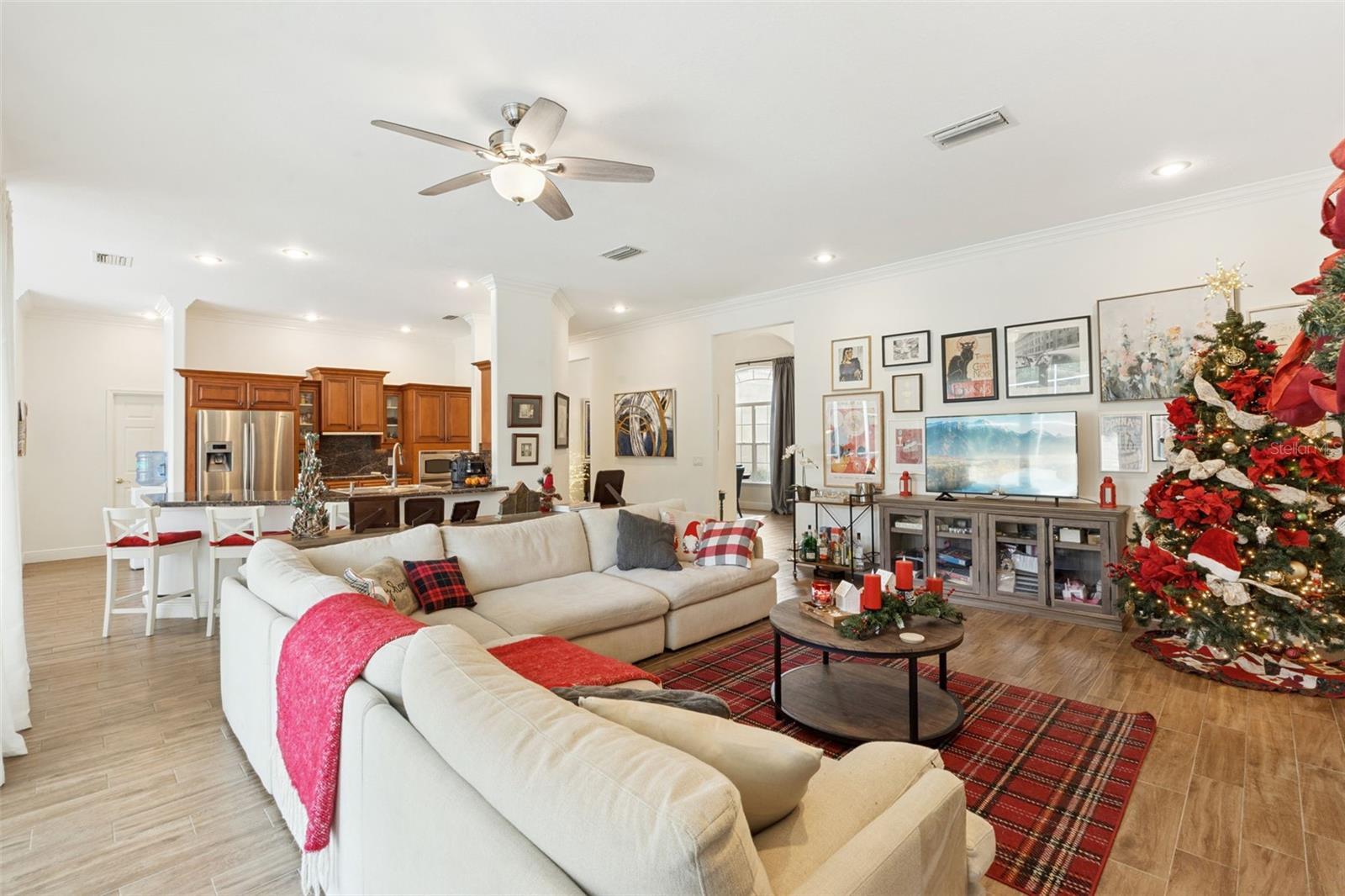 - Ceiling Fans(s), Crown Molding, High Ceilings, Kitchen/Family Room Combo, Open Floorplan, Primary Bedroom Main Floor, Solid Surface Counters, Solid Wood Cabinets, Split Bedroom, Walk-In Closet(s)