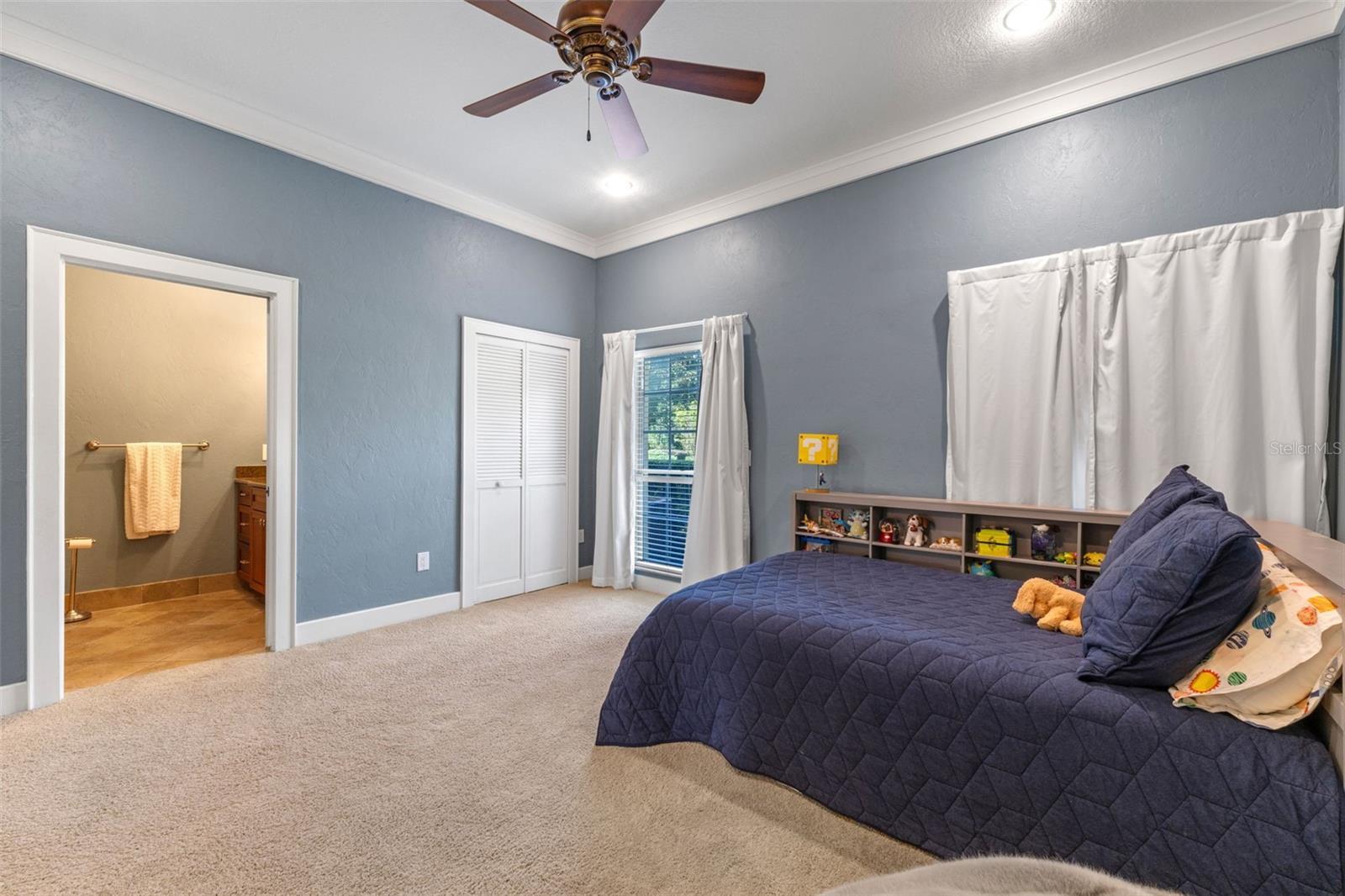 - Built-in Features, Ceiling Fans(s), Crown Molding, Eat-in Kitchen, High Ceilings, Primary Bedroom Main Floor, Solid Wood Cabinets, Split Bedroom, Stone Counters, Thermostat, Walk-In Closet(s), Window Treatments