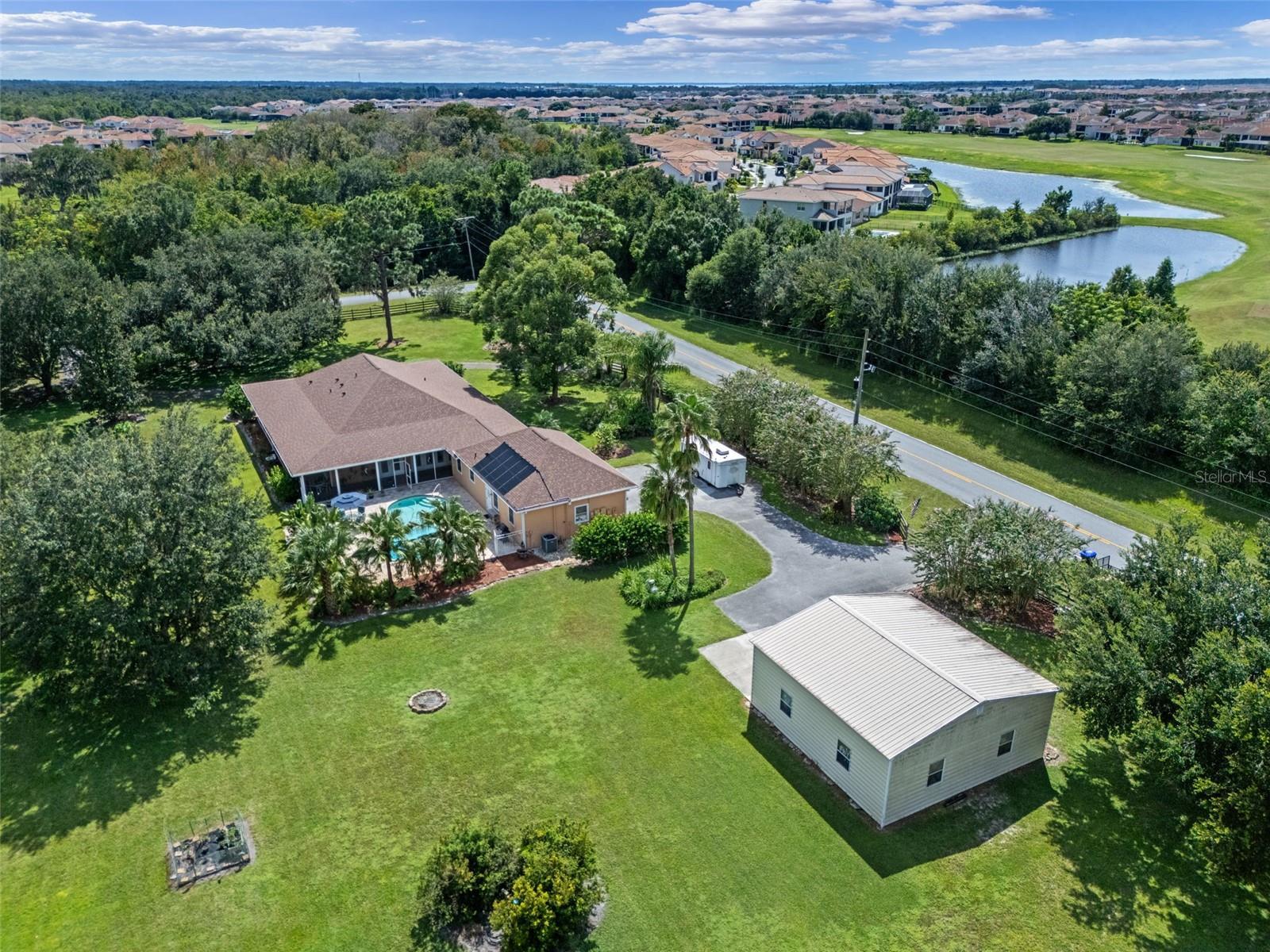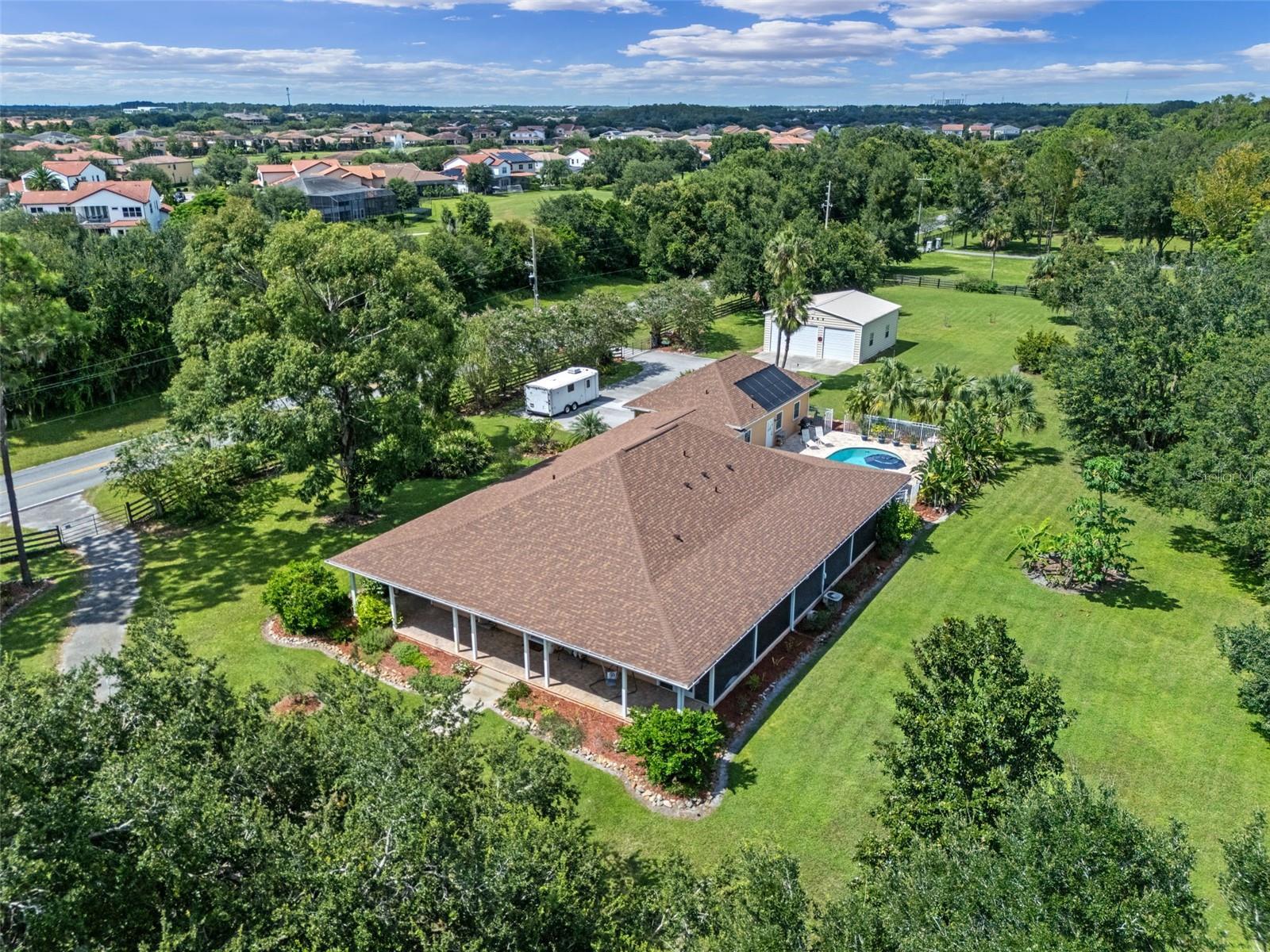 One or more photo(s) has been virtually staged. BRING OFFERS! You’re PRIVATE estate awaits! Welcome to 11101 Tindall Road, a private Lake Nona retreat on 2.5 acres of fully fenced land, offering the perfect blend of peaceful country-style living and city convenience just minutes from Lake Nona Medical City, shopping, dining, and top-rated schools. This 3,128-square-foot home offers four bedrooms and three-and-a-half baths, including a private IN-LAW SUITE ideal for guests, extended family, or work-from-home flexibility. The open floor plan creates a bright, inviting flow through spacious living areas with elegant architectural details, a cozy fireplace, and an updated chef’s kitchen with new cabinets, granite countertops, and a large breakfast bar overlooking the family room. This home features a beautiful, warm sunset palette inside and out. No cookie-cutter white/gray! Every room opens with double French doors to the wraparound screened porch, creating a true indoor–outdoor connection. As cooler weather arrives, open the doors throughout the home and enjoy the gentle cross-breezes, a feature rarely found in newer construction. Step outside to your private backyard oasis with a sparkling solar-heated pool, expansive patio, and lush tropical landscaping. The screened porches on all four sides capture soft east–west breezes and provide relaxing spots to enjoy quiet mornings, sunsets, and starlit evenings. Additional highlights include a brand-new roof, solar panels, a 2017 well, and 2022 septic service for peace of mind. A two-car attached garage pairs with a 1,024-square-foot detached four-car garage/workshop plus a 240-square-foot shed, perfect for storage, projects, or all your recreational toys. With no HOA, no water or sewer bills, and a setting that delivers privacy, space, and freedom, this property captures the best of both worlds: tranquil, private living with every modern convenience close by. Enjoy dark-sky stargazing, abundant birdlife, and front-row seats to rocket launches, all from your own backyard. Bring All Offers, your Lake Nona retreat awaits!