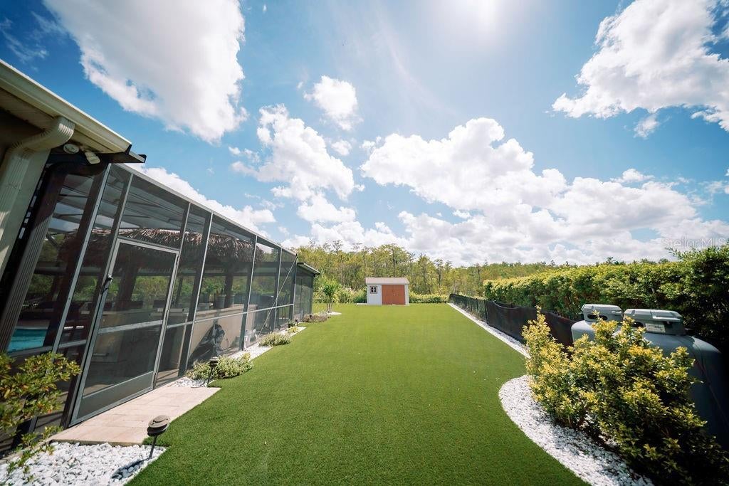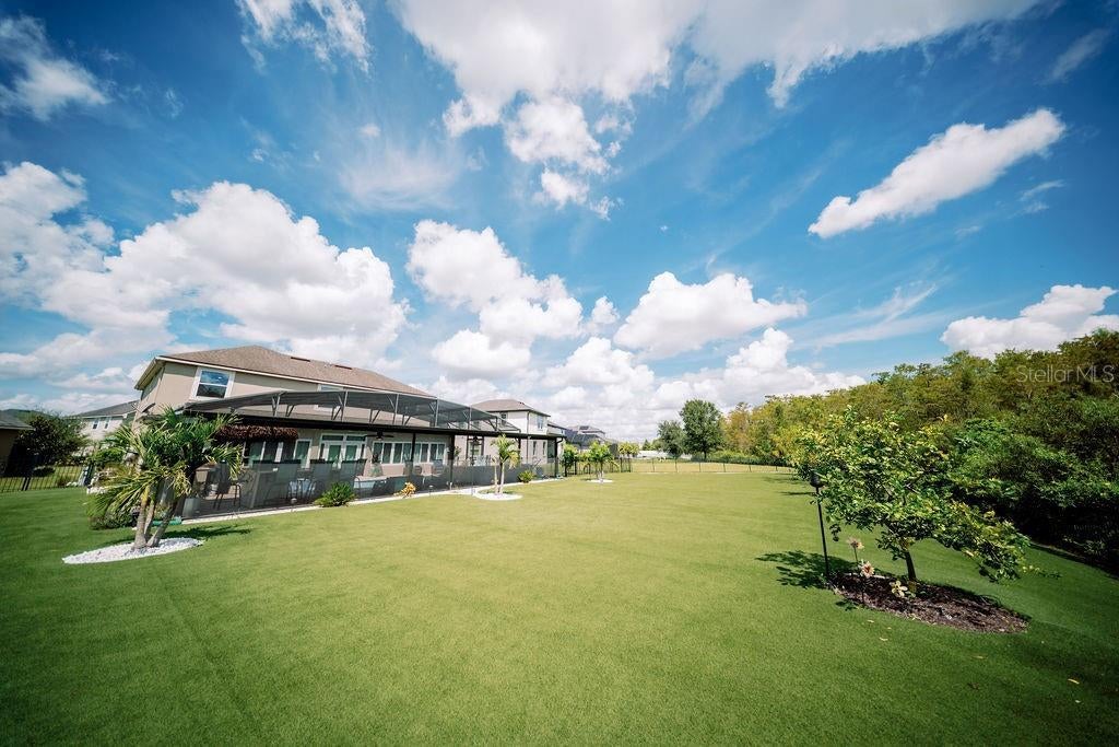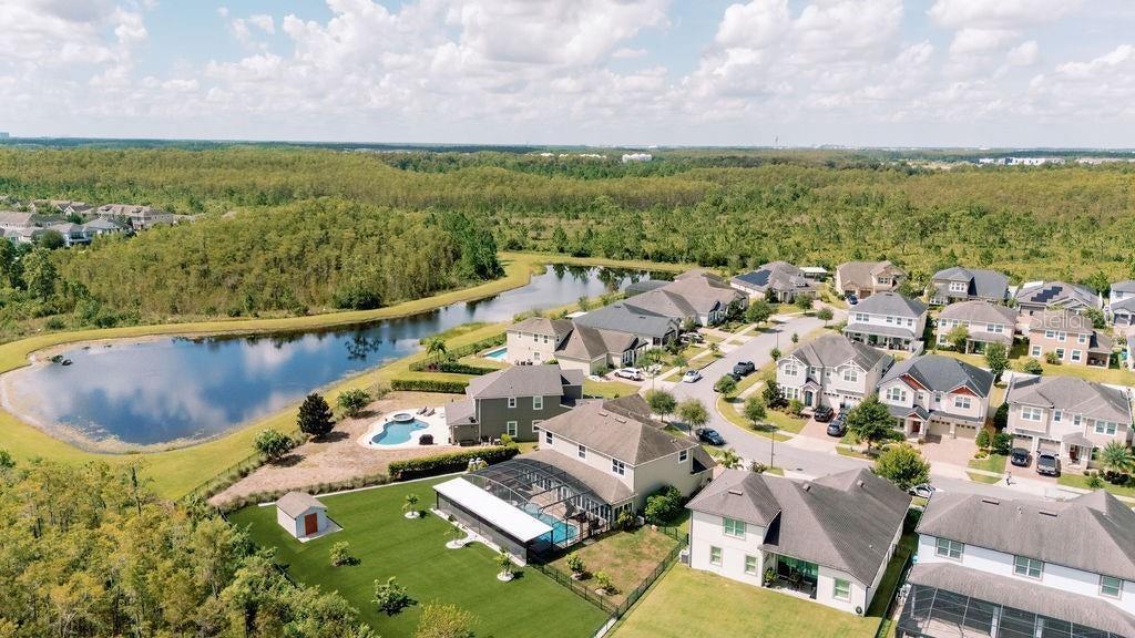 **PRICE IMPROVEMENT** Set on a rare 0.41-acre conservation lot with tranquil pond views, this beautifully designed home offers a refined balance of luxury, privacy, and low-maintenance living in sought-after Randal Park. With five bedrooms and three-and-a-half baths, the open, light-filled layout is ideal for both entertaining and everyday living. At the heart of the home, the chef’s kitchen features 42” cabinetry, granite countertops, stainless steel appliances, a center island with built-in microwave, and a custom hooded range, flowing seamlessly into the expansive great room and dining areas. Quad-pane sliding doors open to an extended, screen-enclosed Florida room and a stunning paver patio with saltwater, gas-heated pool and spa, complete with cascading fountains and a tiki bar that conveys with the home. The backyard is thoughtfully designed with artificial turf for easy maintenance, along with a dedicated natural-grass area ideal for pets. Upstairs, the primary suite offers a tray ceiling, dual custom walk-in closets, and a spa-inspired bath with garden tub, walk-in shower, and dual vanities. Four additional bedrooms include a private en suite, providing flexible space for guests, home office, or multigenerational living. Notable upgrades include a whole-house Generac generator with dual 250-gallon propane tanks, full security system with cameras, Tesla charger, surround sound system, water softener, and all four refrigerators conveying with the property. Additional highlights include hardwood stairs, a ceramic-tiled three-car garage, fully fenced yard, outdoor storage, and integrated LED lighting along the front of the home and pool enclosure, perfect for holiday displays. Residents enjoy access to Randal Park’s resort-style amenities, including a community pool, fitness center, playgrounds, and scenic walking trails. Ideally located just 15 minutes from Orlando International Airport, near the Brightline station, and approximately 30 minutes from Disney, this home delivers space, upgrades, and convenience in one exceptional offering.