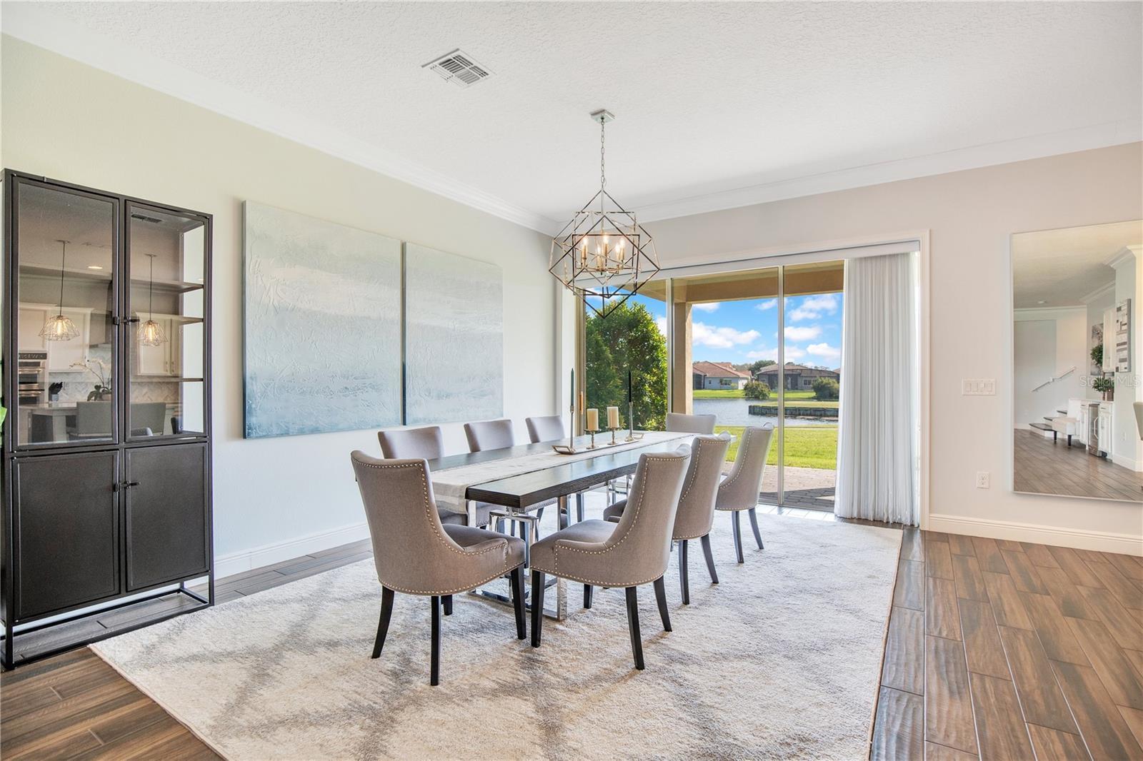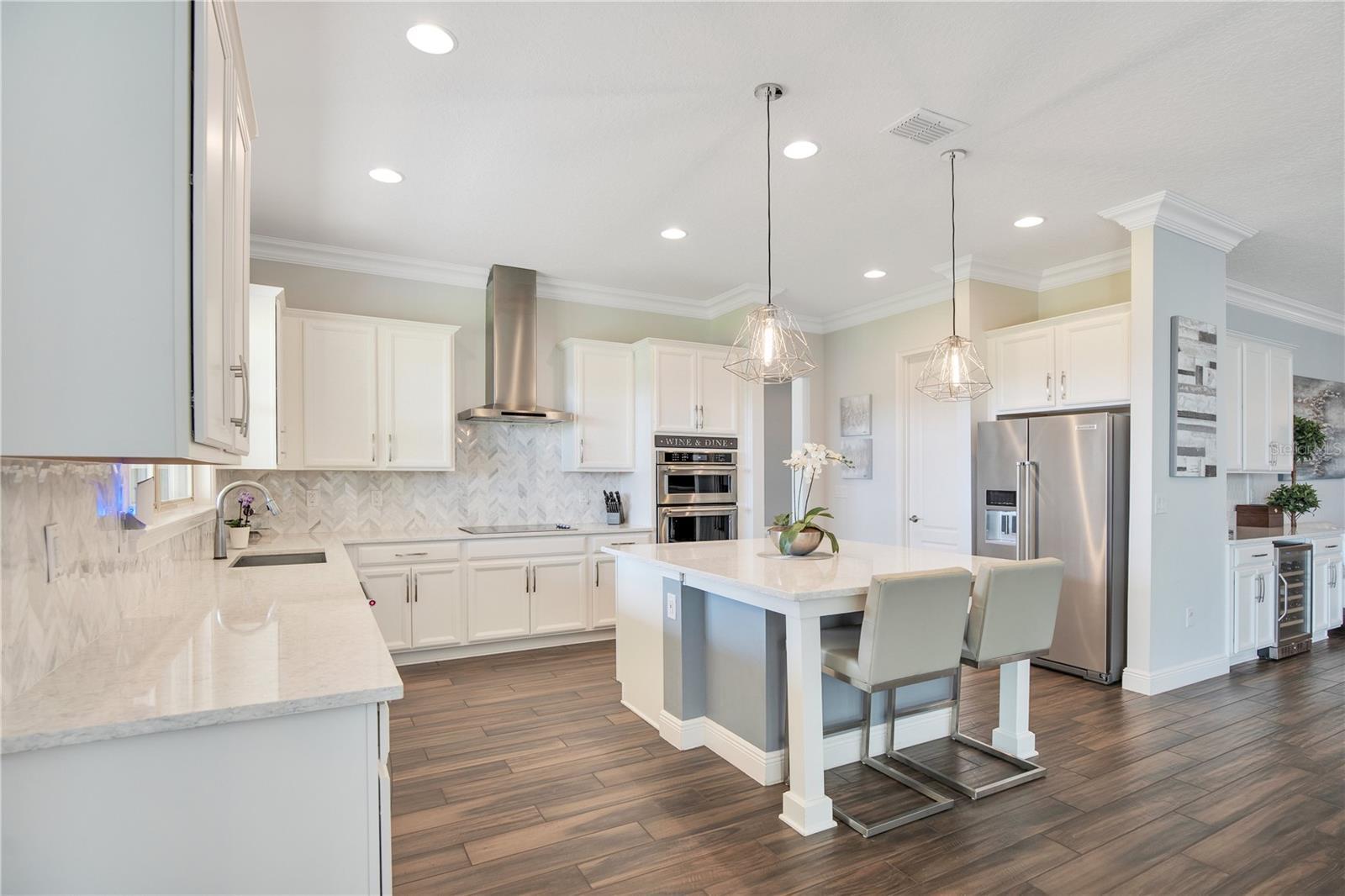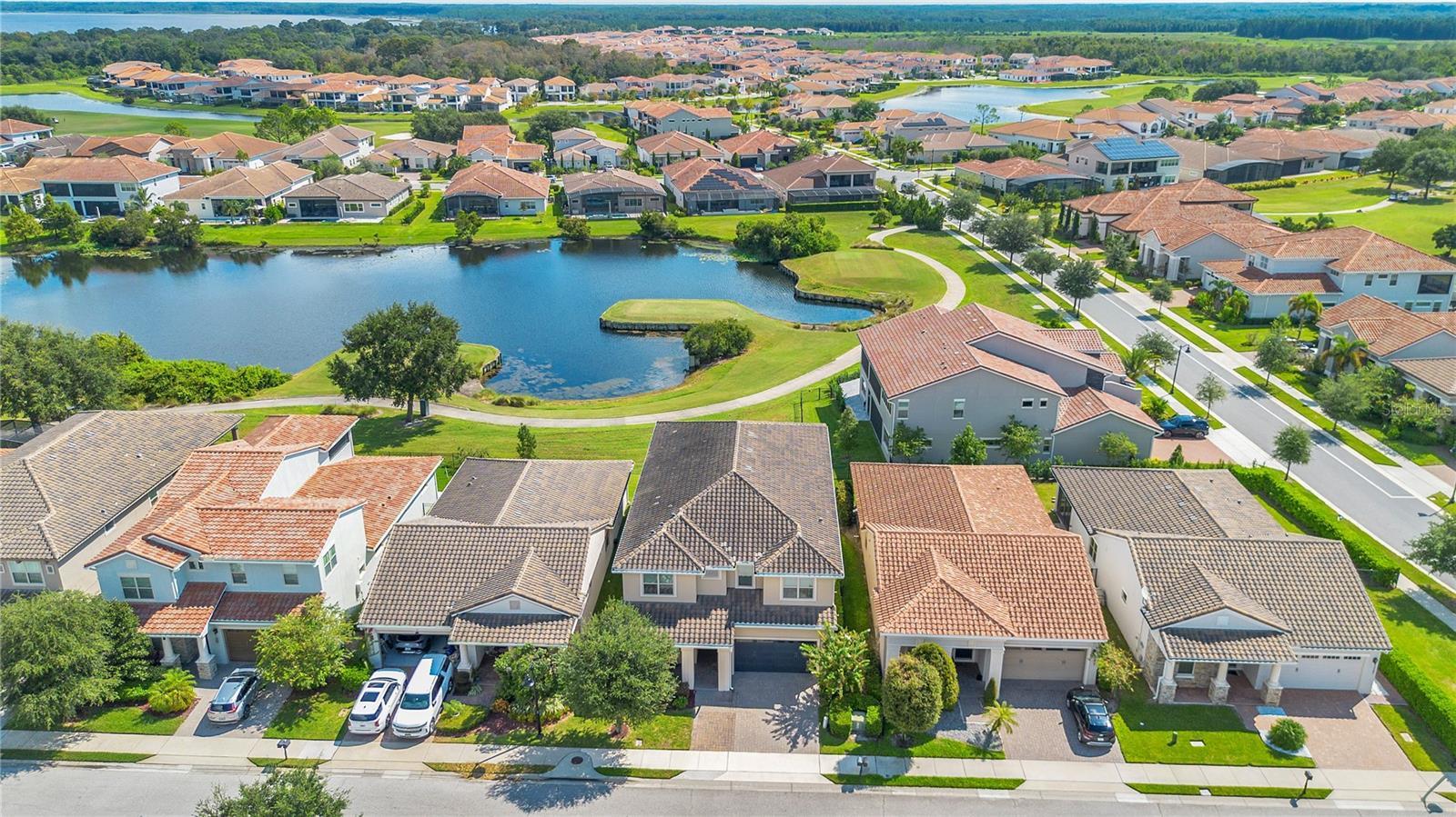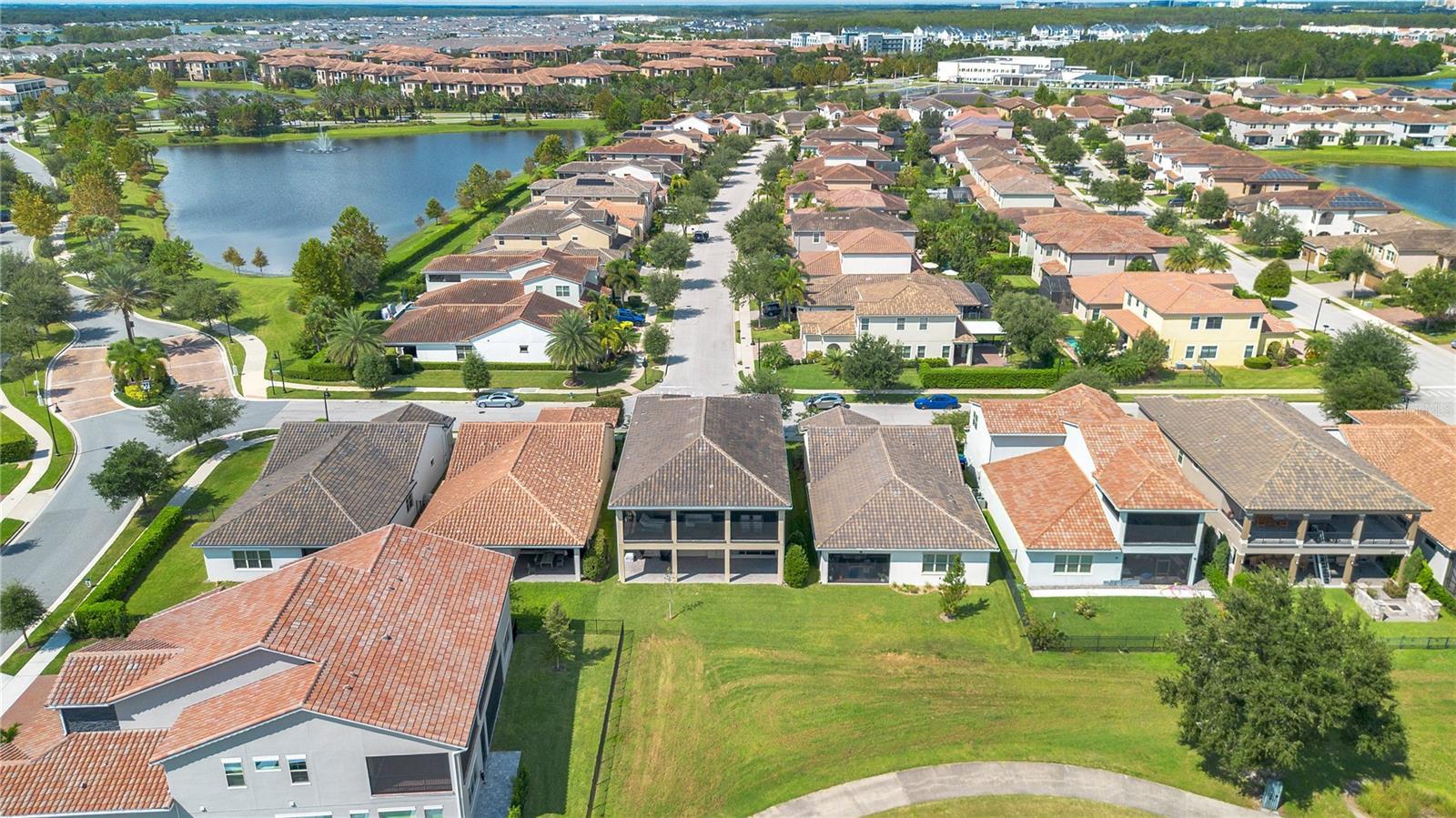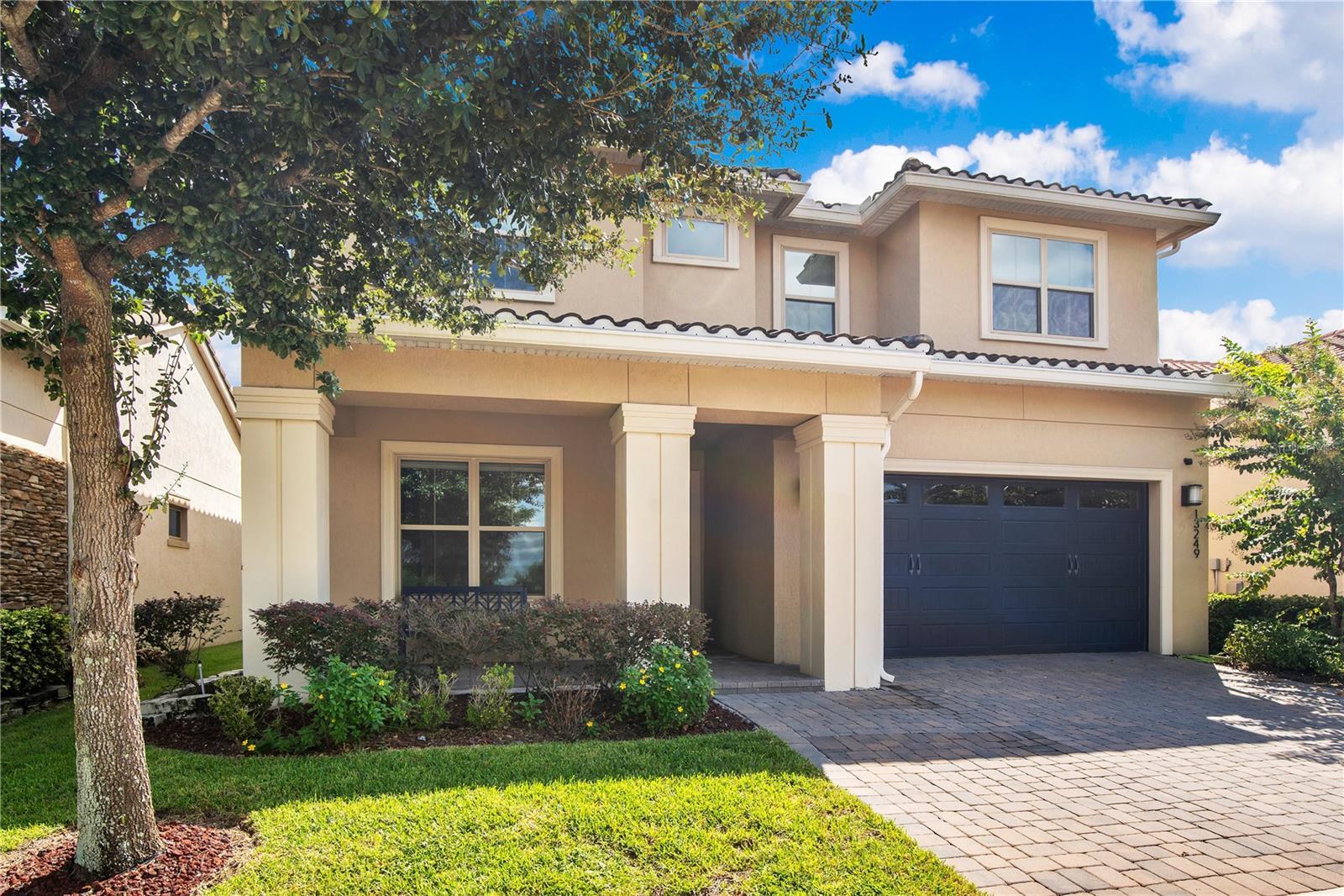 Welcome to 13249 Woodford Street, where luxury living meets thoughtful design. This stunning 4-bedroom, 4-bathroom residence offers elegant finishes, expansive living spaces, and serene pond views in one of Orlando’s most sought-after communities. From the moment you step into the foyer, this home makes an impression. The wood-look tile flooring is both beautiful and practical—durable, water-resistant, and virtually maintenance-free. At the heart of the home, an open family room, kitchen, and dining area set the stage for effortless living and entertaining. The chef’s dream kitchen is as functional as it is stylish, featuring top-of-the-line KitchenAid appliances, quartz countertops, an oversized island with seating, 48-inch cabinetry, tile backsplash, and abundant storage with a large walk-in pantry! The island provides space for baking or entertaining, while still offering casual seating for quick meals. Just off the kitchen, a full bath has been thoughtfully designed with future pool living in mind. The separate dining area, flowing between the kitchen and family room, accommodates a large table with ease, making holidays and dinner parties a joy. From here, sliding glass doors lead to a covered lanai that spans the entire width of the home. Facing east, this incredible outdoor living space captures peaceful sunrises and stays shaded through the afternoon and evening, allowing you to relax or entertain comfortably year-round. The family room shines with a custom tiled entertainment wall, complete with an electric fireplace and a designated space for your wall-mounted TV. A separate dry bar area adds both storage and function with counter space, cabinetry, and a beverage refrigerator—perfect for gatherings. A downstairs bedroom with ensuite full bath is ideal for guests or a private home office. Head upstairs to a spacious loft with two sets of sliding glass doors for exceptional views. These doors open up onto the full-length screened balcony with Polywood flooring. Overlooking the tranquil pond, this space provides an incredible extension of your living area—perfect for morning coffee at sunrise or shaded afternoons and evenings spent outdoors, maybe even catching a rocket launch from Cape Canaveral. The primary suite is an oversized retreat with slider doors opening to the balcony water view. Its spa-inspired bath offers dual sinks, a custom walk-in shower with rain head, and a separate water closet. An bonus feature in the bathroom is a vanity island, blending luxury and practicality, with added storage and counter space! Dual walk-in closets between the bedroom and bathroom are convenient and provide more privacy and ease of dressing. Two additional upstairs bedrooms and a full bath complete the perfect family layout. The secondary bathroom upstairs has dual sinks and a shower/tub combination. All showers in the home feature tiled walls all the way from the floor to the ceiling. The laundry room is upstairs with a sink and cabinet/countertop space making folding clothing easy. Additional highlights include high ceilings with 8-foot doors throughout, a 3-car garage (one tandem, ideal for storage, golf cart storage, or a home gym), and a convenient drop zone at the garage entry with low cabinets and regular height cabinets, and a water filtration system serving the entire home! Check out the Matterport 3-D link to see this home NOW! It offers it all—style, function, and a setting you’ll fall in love with.
