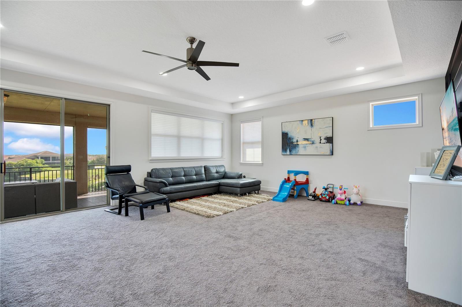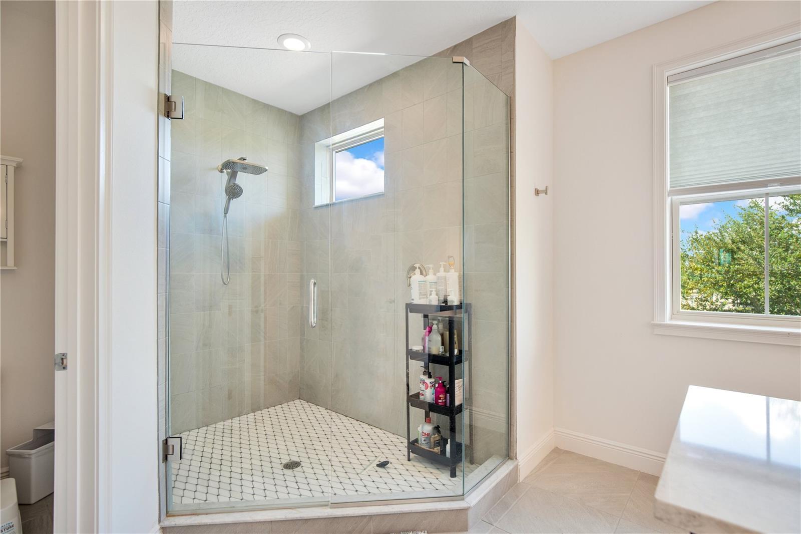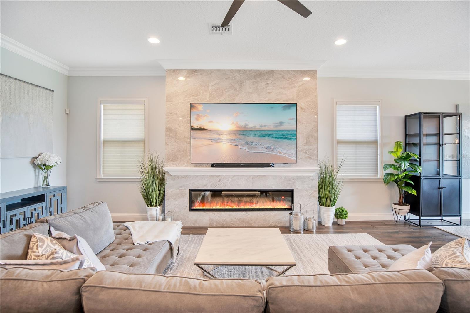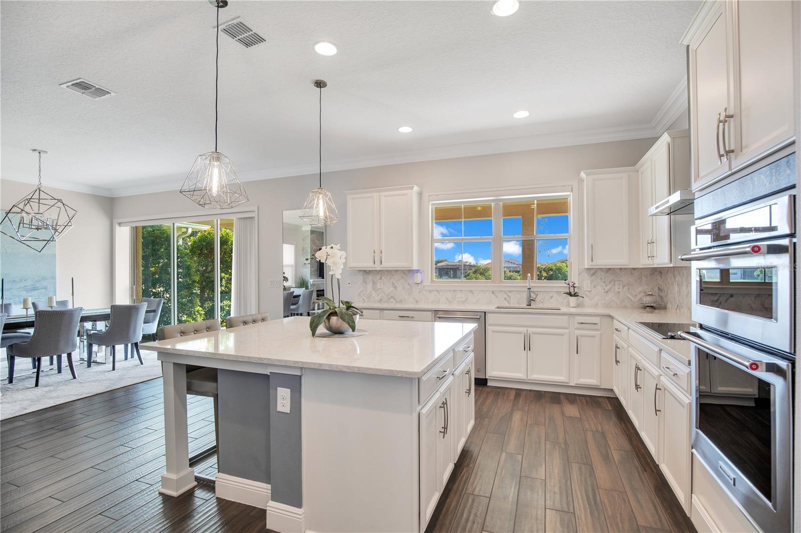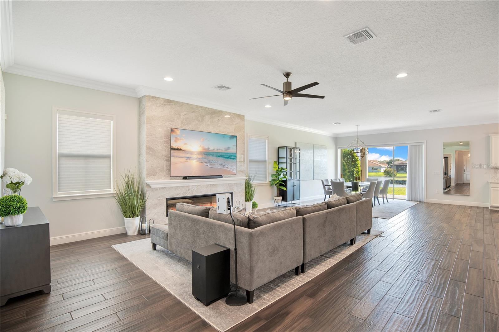 Welcome to 13249 Woodford Street, where luxury living meets thoughtful design. This stunning 4-bedroom, 4-bathroom residence offers elegant finishes, expansive living spaces, and serene pond views in one of Orlando’s most sought-after communities. From the moment you step into the foyer, this home makes an impression. The wood-look tile flooring is both beautiful and practical—durable, water-resistant, and virtually maintenance-free. At the heart of the home, an open family room, kitchen, and dining area set the stage for effortless living and entertaining. The chef’s dream kitchen is as functional as it is stylish, featuring top-of-the-line KitchenAid appliances, quartz countertops, an oversized island with seating, 48-inch cabinetry, tile backsplash, and abundant storage with a large walk-in pantry! The island provides space for baking or entertaining, while still offering casual seating for quick meals. Just off the kitchen, a full bath has been thoughtfully designed with future pool living in mind. The separate dining area, flowing between the kitchen and family room, accommodates a large table with ease, making holidays and dinner parties a joy. From here, sliding glass doors lead to a covered lanai that spans the entire width of the home. Facing east, this incredible outdoor living space captures peaceful sunrises and stays shaded through the afternoon and evening, allowing you to relax or entertain comfortably year-round. The family room shines with a custom tiled entertainment wall, complete with an electric fireplace and a designated space for your wall-mounted TV. A separate dry bar area adds both storage and function with counter space, cabinetry, and a beverage refrigerator—perfect for gatherings. A downstairs bedroom with ensuite full bath is ideal for guests or a private home office. Head upstairs to a spacious loft with two sets of sliding glass doors for exceptional views. These doors open up onto the full-length screened balcony with Polywood flooring. Overlooking the tranquil pond, this space provides an incredible extension of your living area—perfect for morning coffee at sunrise or shaded afternoons and evenings spent outdoors, maybe even catching a rocket launch from Cape Canaveral. The primary suite is an oversized retreat with slider doors opening to the balcony water view. Its spa-inspired bath offers dual sinks, a custom walk-in shower with rain head, and a separate water closet. An bonus feature in the bathroom is a vanity island, blending luxury and practicality, with added storage and counter space! Dual walk-in closets between the bedroom and bathroom are convenient and provide more privacy and ease of dressing. Two additional upstairs bedrooms and a full bath complete the perfect family layout. The secondary bathroom upstairs has dual sinks and a shower/tub combination. All showers in the home feature tiled walls all the way from the floor to the ceiling. The laundry room is upstairs with a sink and cabinet/countertop space making folding clothing easy. Additional highlights include high ceilings with 8-foot doors throughout, a 3-car garage (one tandem, ideal for storage, golf cart storage, or a home gym), and a convenient drop zone at the garage entry with low cabinets and regular height cabinets, and a water filtration system serving the entire home! Check out the Matterport 3-D link to see this home NOW! It offers it all—style, function, and a setting you’ll fall in love with.