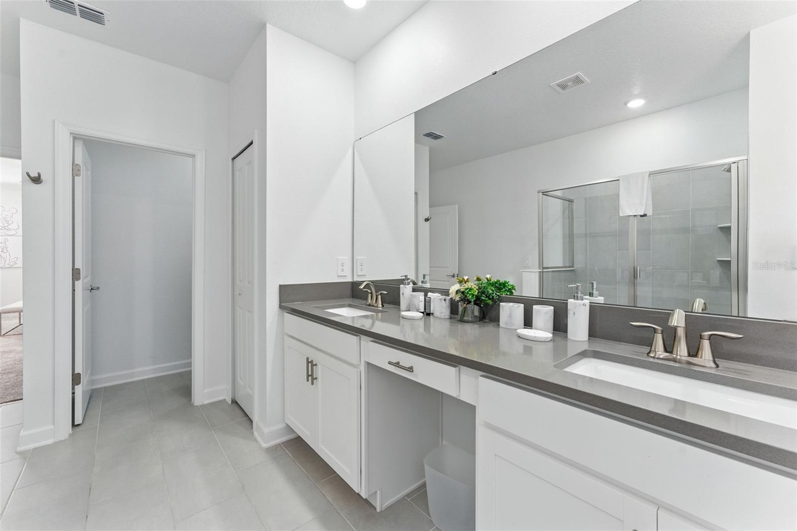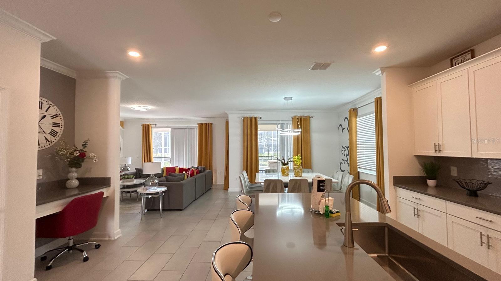 - Eat-in Kitchen, High Ceilings, Kitchen/Family Room Combo, L Dining, Living Room/Dining Room Combo, Open Floorplan, PrimaryBedroom Upstairs, Sauna, Solid Surface Counters, Stone Counters, Thermostat, Walk-In Closet(s)