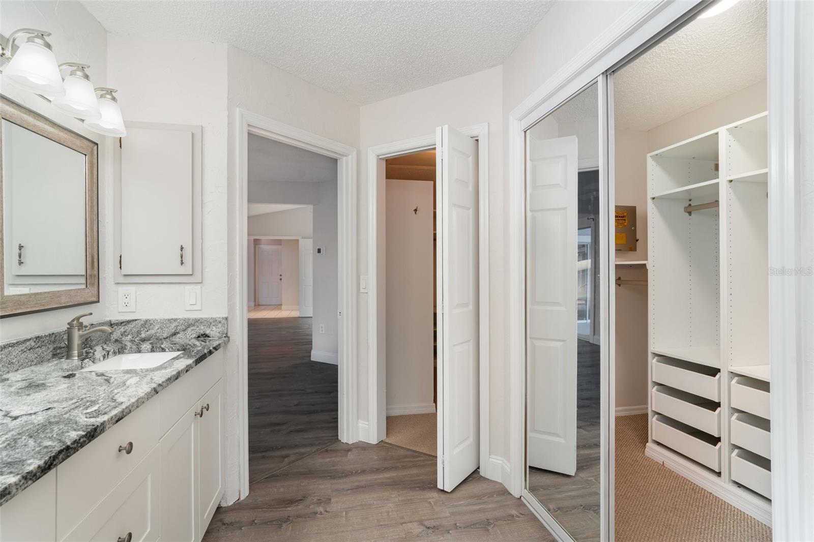 - Ceiling Fans(s), Coffered Ceiling(s), Crown Molding, Eat-in Kitchen, Open Floorplan, Primary Bedroom Main Floor, Solid Surface Counters, Split Bedroom, Stone Counters, Thermostat, Vaulted Ceiling(s), Walk-In Closet(s), Wet Bar