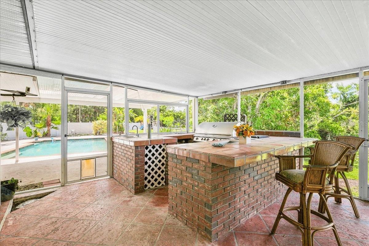 Tucked away on a quiet cul-de-sac in the sought-after Georgetowne neighborhood, this waterfront pool home offers privacy, comfort, and room to unwind on over 1.1 acres. Step inside to an inviting layout with three spacious bedrooms, two updated baths, and multiple living areas including a living room, family room, formal dining area, and flexible bonus space. The classic brick fireplace, large windows, and tranquil water views bring warmth and light throughout. The modern kitchen features sleek quartz countertops and stylish cabinetry. Outside is where Florida living comes alive — a screened lanai, outdoor kitchen, outdoor shower, and expansive pool deck overlook create the perfect setting for entertaining or simply relaxing in your private retreat. Additional highlights include a brand-new roof (May 2025), mature landscaping for shade and privacy, and over an acre of space to enjoy — all just minutes from central Sarasota. Pets are welcome, and all offers will be considered.