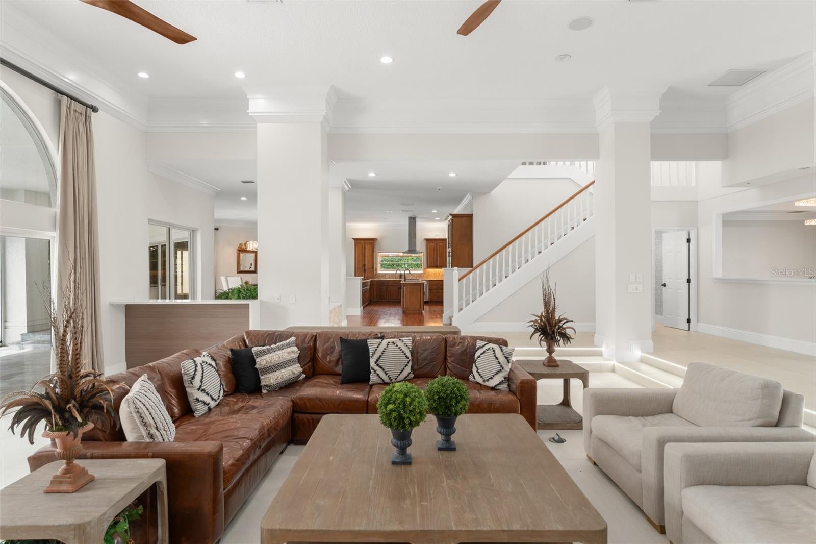 Stunning golf and lake views and beautifully updated grounds are hallmarks of this elegant Isleworth estate. Nestled along the front nine overlooking Isleworth’s 2nd fairway and beautiful Lake Chase, this two-story home spans more than 4,800 square feet and features modern finishes throughout. Beautiful porcelain tile travels throughout the main level from the spacious living room with an oversized modern built-in featuring slate stonework and lit shelves. The spacious master suite features a large sitting area and an en-suite bathroom with dual vanities, a walk-in closet, modern soaking tub and separate walk-in shower. Completing the main level are the home office, formal dining room, elegant powder bath and center-island kitchen with casual dining area. Two additional bedrooms with balcony access are on the upper level. Step outside and discover a newly reimagined outdoor living experience. The expansive pool deck has been fully updated with sleek new pavers, while fresh turf and lush landscaping create a vibrant backdrop for relaxation and entertaining. A striking glass wall encases the pool area, maximizing panoramic views of both the golf course and the lake. The outdoor kitchen has been thoughtfully upgraded with new granite, a built-in grill, pizza oven, sink, and designer lighting—seamlessly blending function with style. Enjoy evenings around the modern fire pit, take a dip in the resurfaced pool with its brand-new heater, or unwind in the extended backyard, which offers an additional 15 feet added to one side of the property. Every detail of this outdoor transformation has been designed to enhance both beauty and livability, making this property the perfect retreat for year-round enjoyment.