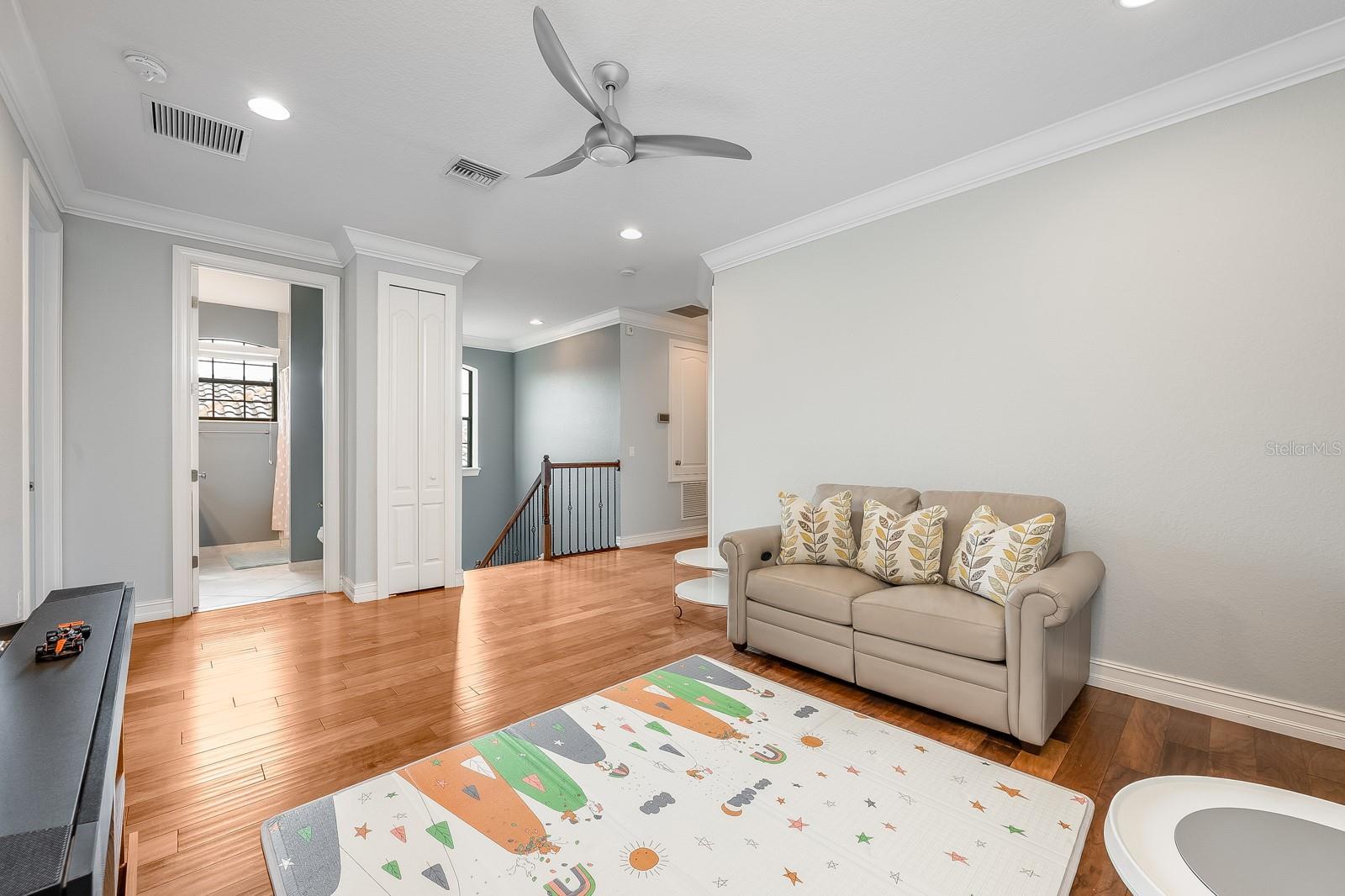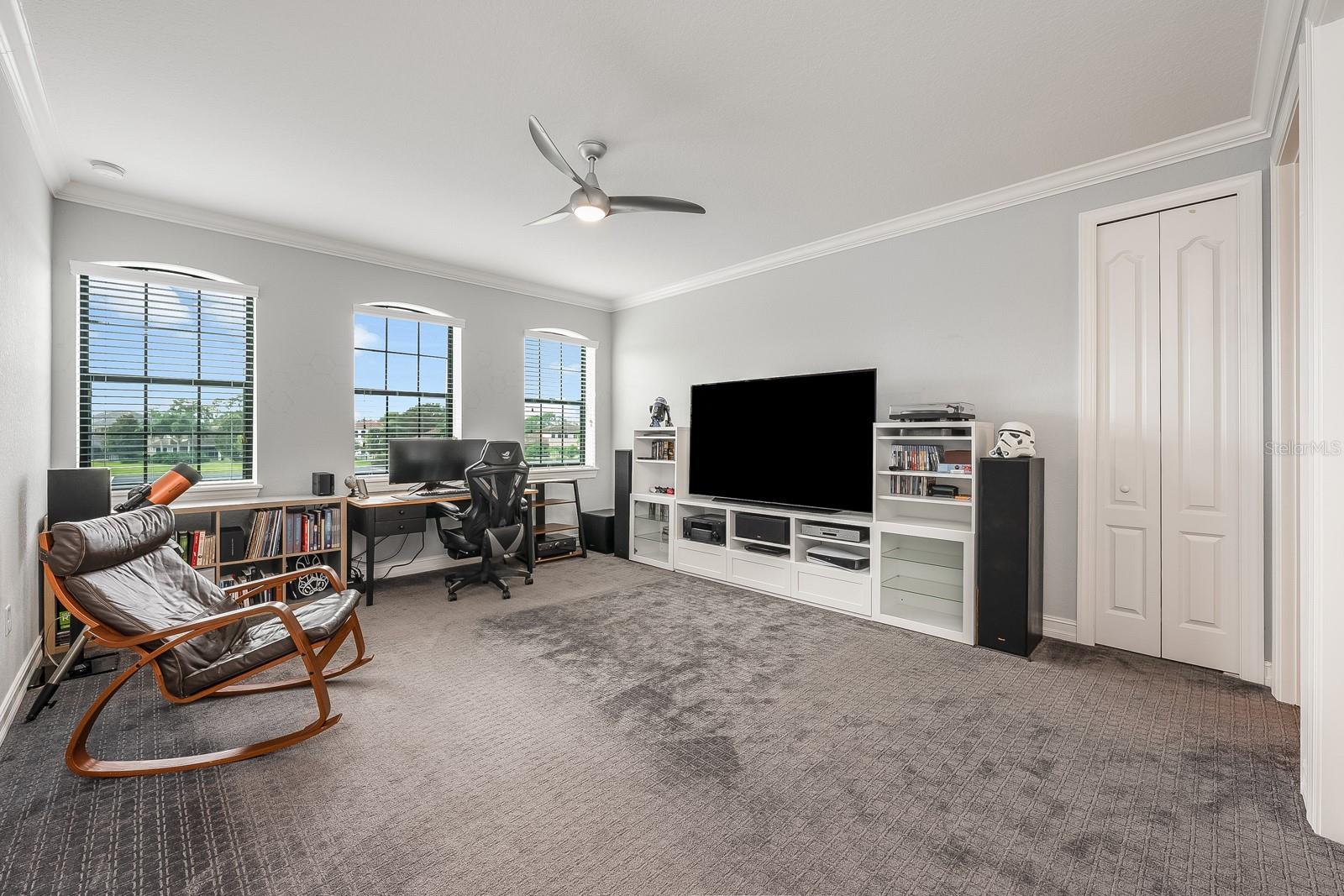 - Ceiling Fans(s), Crown Molding, Eat-in Kitchen, Kitchen/Family Room Combo, Living Room/Dining Room Combo, Open Floorplan, Primary Bedroom Main Floor, Solid Surface Counters, Solid Wood Cabinets, Split Bedroom, Stone Counters, Thermostat, Tray Ceiling(s), Walk-In Closet(s), Window Treatments