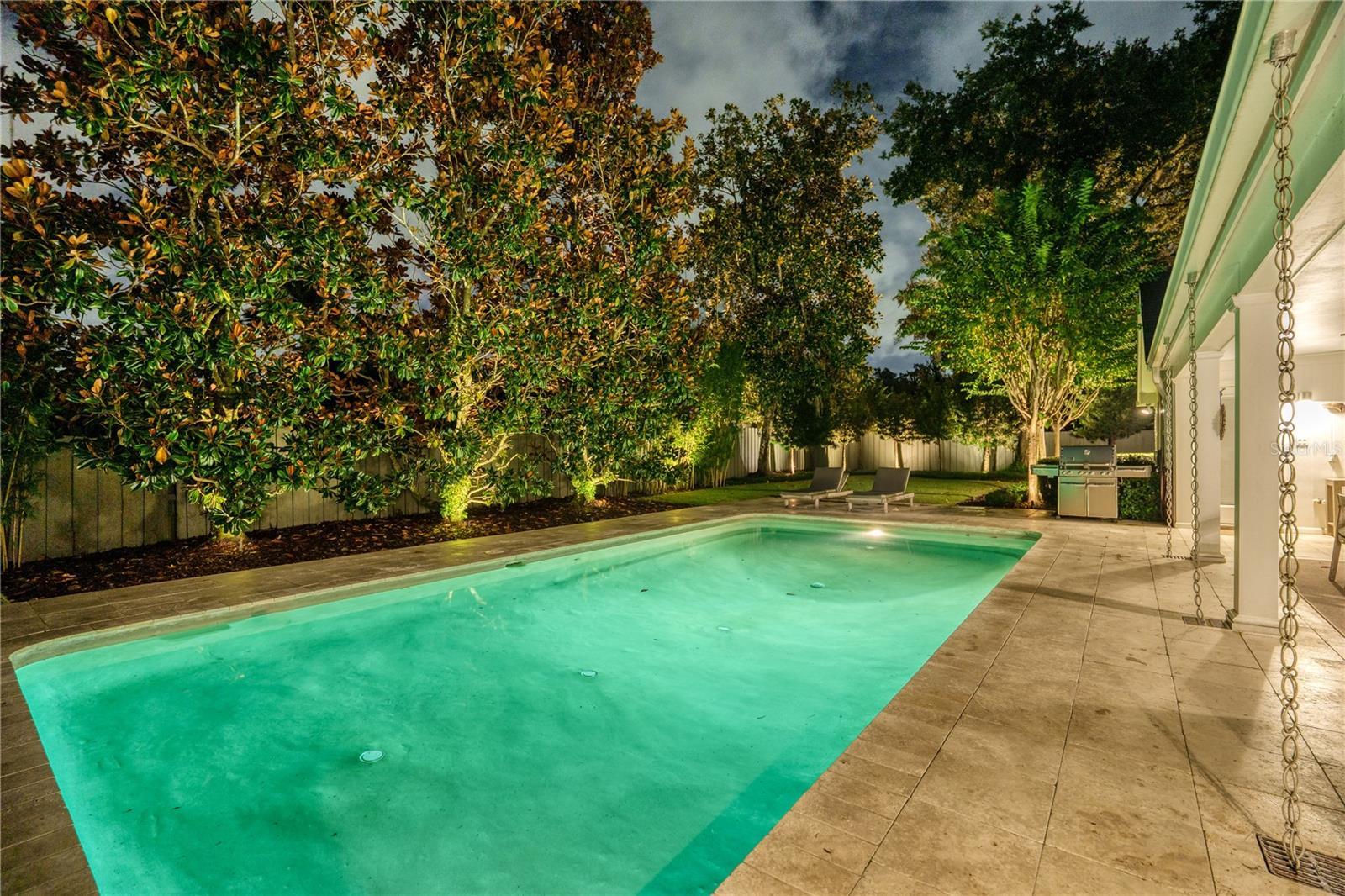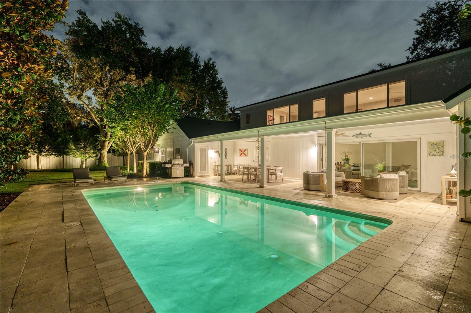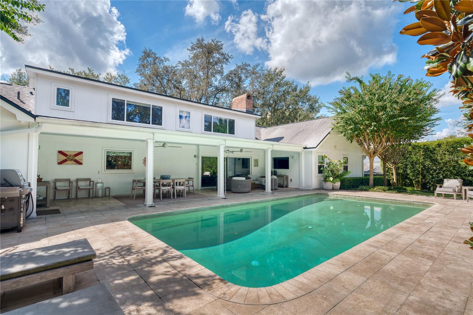Nestled in coveted Winter Park’s Sevilla neighborhood, this 4-bed, 4.5-bath pool home delivers 3,500+ SF of refined living including 500 SF upstairs flex suite with its own full bath. A traditional foyer introduces formal living and dining rooms before the home unfolds into a spectacular 2022-renovated chef’s kitchen—an airy showpiece anchored by a 10-ft quartz island with bar seating, custom cabinetry, designer appliances, including a Thermidor side-by-side paneled refrigerator, Thermidor gas range & hood, and a Scotsman ice maker. The main hallway leads to the re-imagined primary retreat: spa-inspired bath with double vanities, oversized walk-in shower, soaking tub, dressing table, and custom closet. Two additional guest bedrooms share a refreshed full shower bath, while a separate en-suite—ideal for in-laws or overnight guests—enjoys direct access to the pool off the kitchen hall. Upstairs, a large bonus room with full bath adapts effortlessly to a 5th bedroom, media space, or private office. A utility-minded laundry/mud room links the interior to an oversized side-entry garage. Out back, entertain year-round beneath a covered lanai overlooking the expansive pool and sun deck. Mature oak canopy, manicured shrubs, and full privacy fencing create a park-like sanctuary just blocks from Park Avenue dining and the back gate to Mead Botanical Garden. Audubon K-8 and Winter Park High School District.