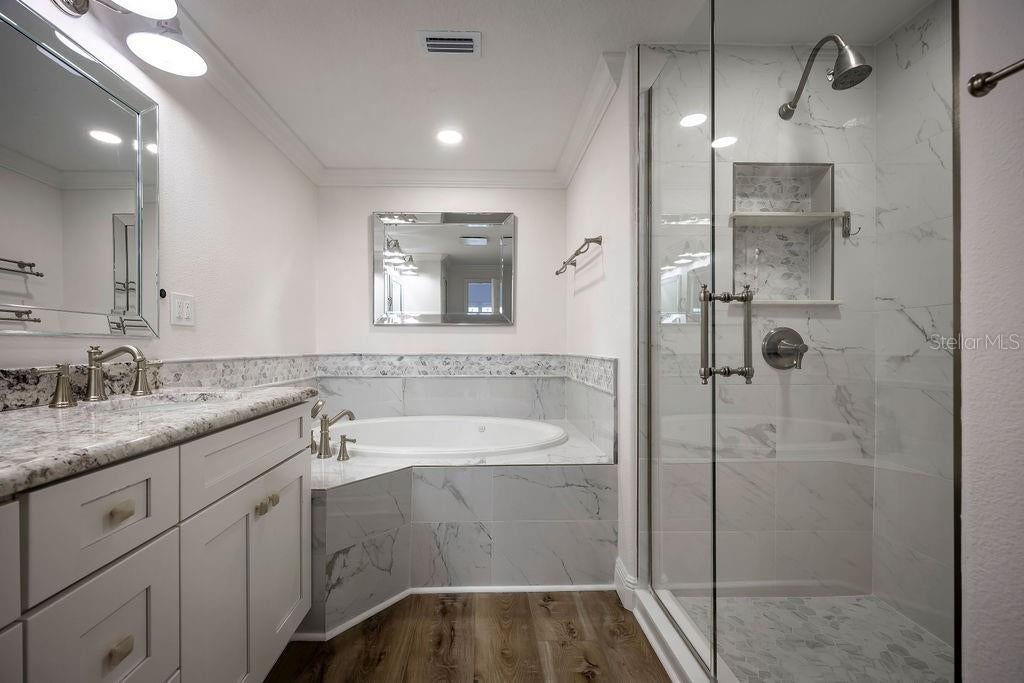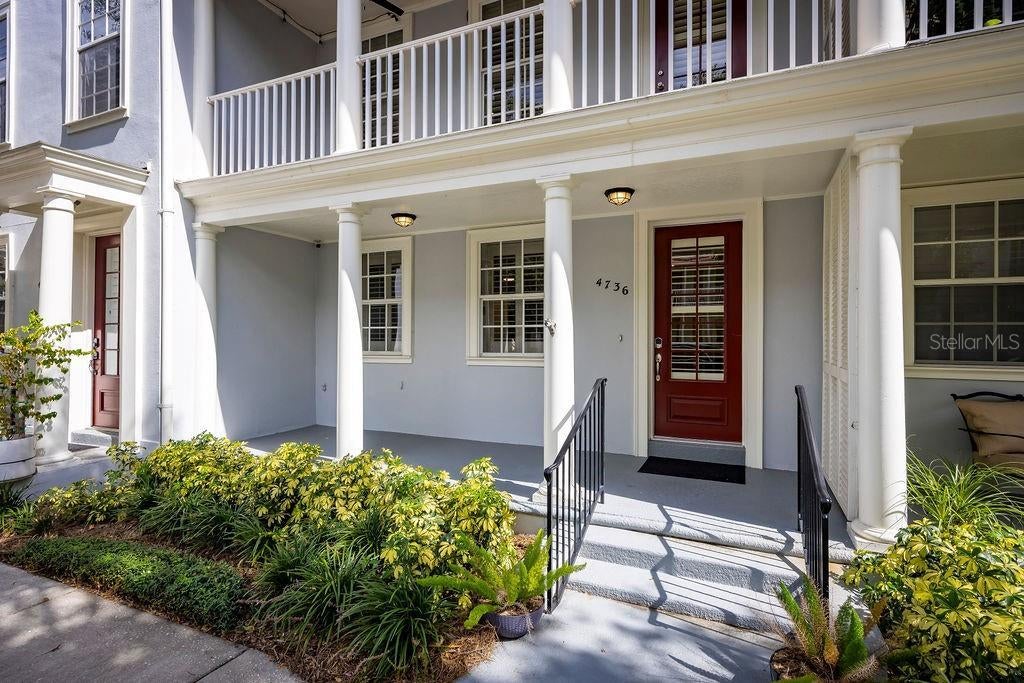 Beautifully renovated, 4-story townhome. 3 bedrooms plus a bonus room, all with full en-suite baths, and 2 half baths. Recently updated with gorgeous, neutral laminate flooring throughout, with plantation shutters on all windows. Stylish kitchen and updated bathrooms, stone countertops, white cabinetry, all new interior and exterior lighting fixtures, additional led recessed can lights with ceiling fans throughout. The 1st floor has a private guest suite with an en-suite bath and walk-in closet- perfect for guests or a dedicated office. The 2nd floor combines the living, dining, and kitchen spaces, with a convenient powder bath and a covered front balcony off the living room, making the 2nd level ideal for entertaining. The open kitchen offers an eat-in bar, prep island, additional cabinetry and countertop space along the rear wall with a built-in wine refrigerator, and 2 pantry closets. On the 3rd floor, 2 bedroom suites with a laundry area in-between, with a newer washer & dryer, built-in cabinets, and a countertop for folding. The front-facing primary suite features a spa-like bathroom with a large soaking tub, dual shower heads, a private water closet, a linen closet, walk-in closet with built-ins. 1 block from downtown Baldwin Park, includes access to 3 community pools, fitness center, parks, playgrounds, and a scenic lakefront trail around Lake Baldwin. Walkable distance to restaurants and boutiques.