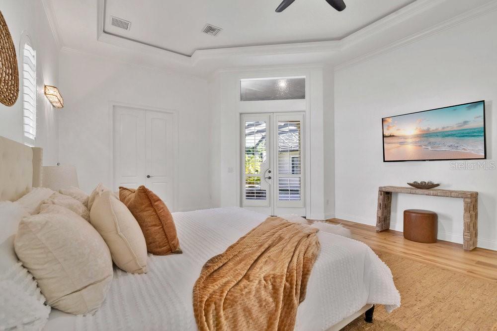 - Ceiling Fans(s), Coffered Ceiling(s), Crown Molding, Dry Bar, Eat-in Kitchen, High Ceilings, Primary Bedroom Main Floor, Solid Surface Counters, Solid Wood Cabinets, Stone Counters, Thermostat, Tray Ceiling(s), Wet Bar, Window Treatments