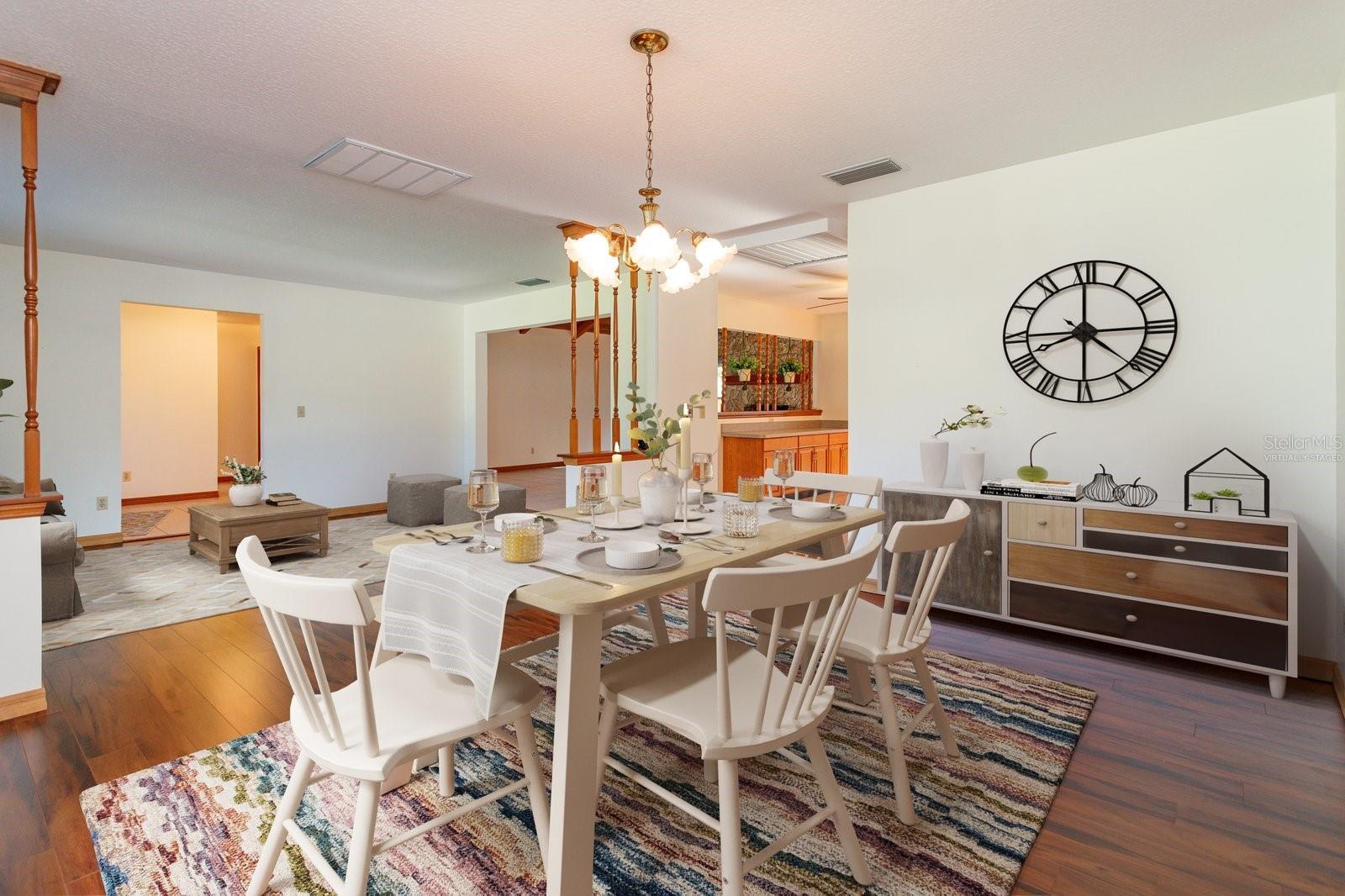 - High Ceilings, Kitchen/Family Room Combo, Living Room/Dining Room Combo, Split Bedroom, Walk-In Closet(s), Window Treatments