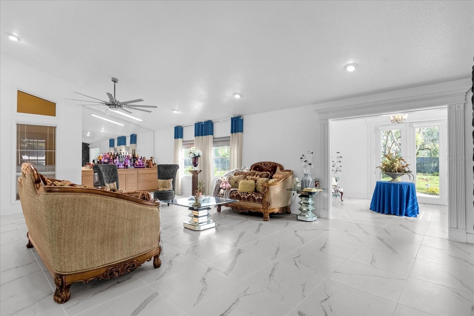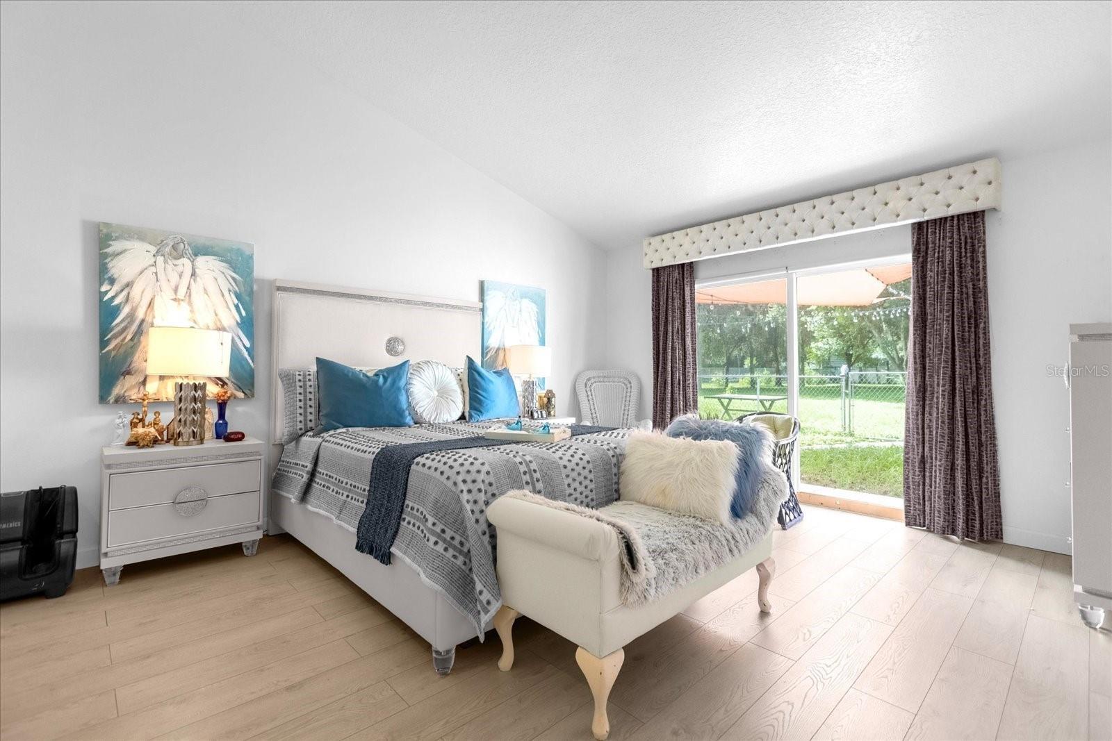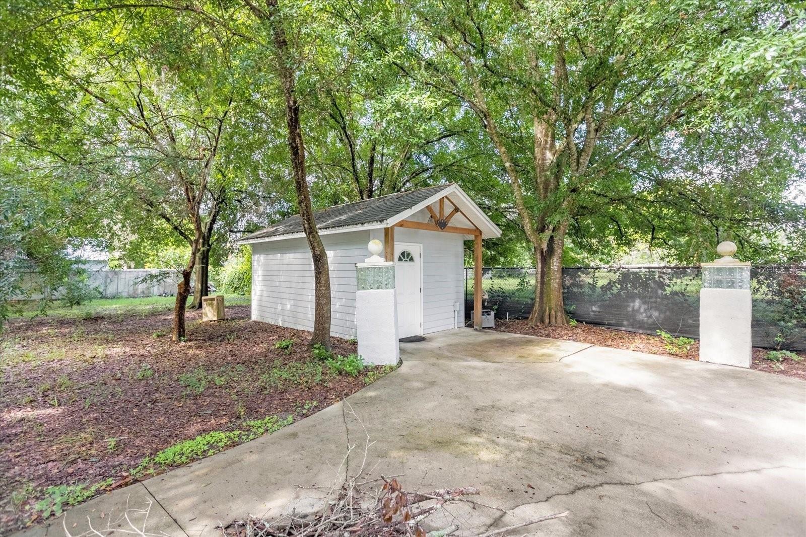 One of a kind fully fenced one-acre estate is just minutes from Lake Nona and all Central Florida has to offer. Ideal for car enthusiasts and hobbyist this home features three garages with six bays, a breezeway workspace for additional vehicles, 50-amp upgraded electric service, compressor lines, and a full bath in one garage that can be utilized as an in-law suite or additional bedroom. Inside, enjoy 3 Bedrooms with family room, dinnin groom and family room, with features such high tin ceilings, crown molding,new tile floors, a built-in wet bar, movie/bonus room pre-wired for surround sound, formal dining, and a spacious kitchen with solid wood cabinets and premium appliances.The private master suite offers sliding doors to a seating area, large walk-in closet, and stylish ensuite bath. The lush grounds include pillar lights, a fire pit, a shed with water system, zoned irrigation on a separate well, and mature fruit trees. 2021 Roof , on septic tank and well.