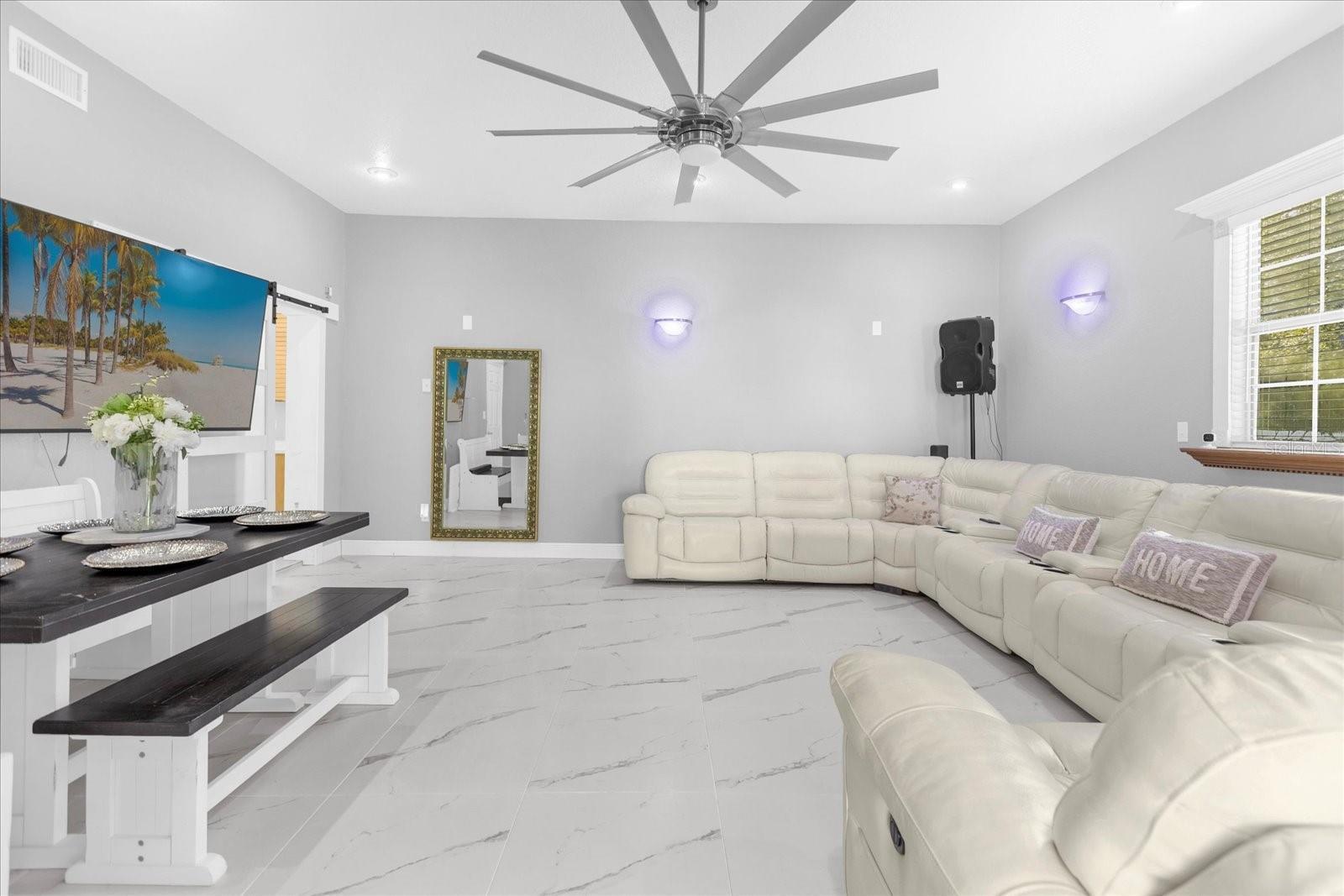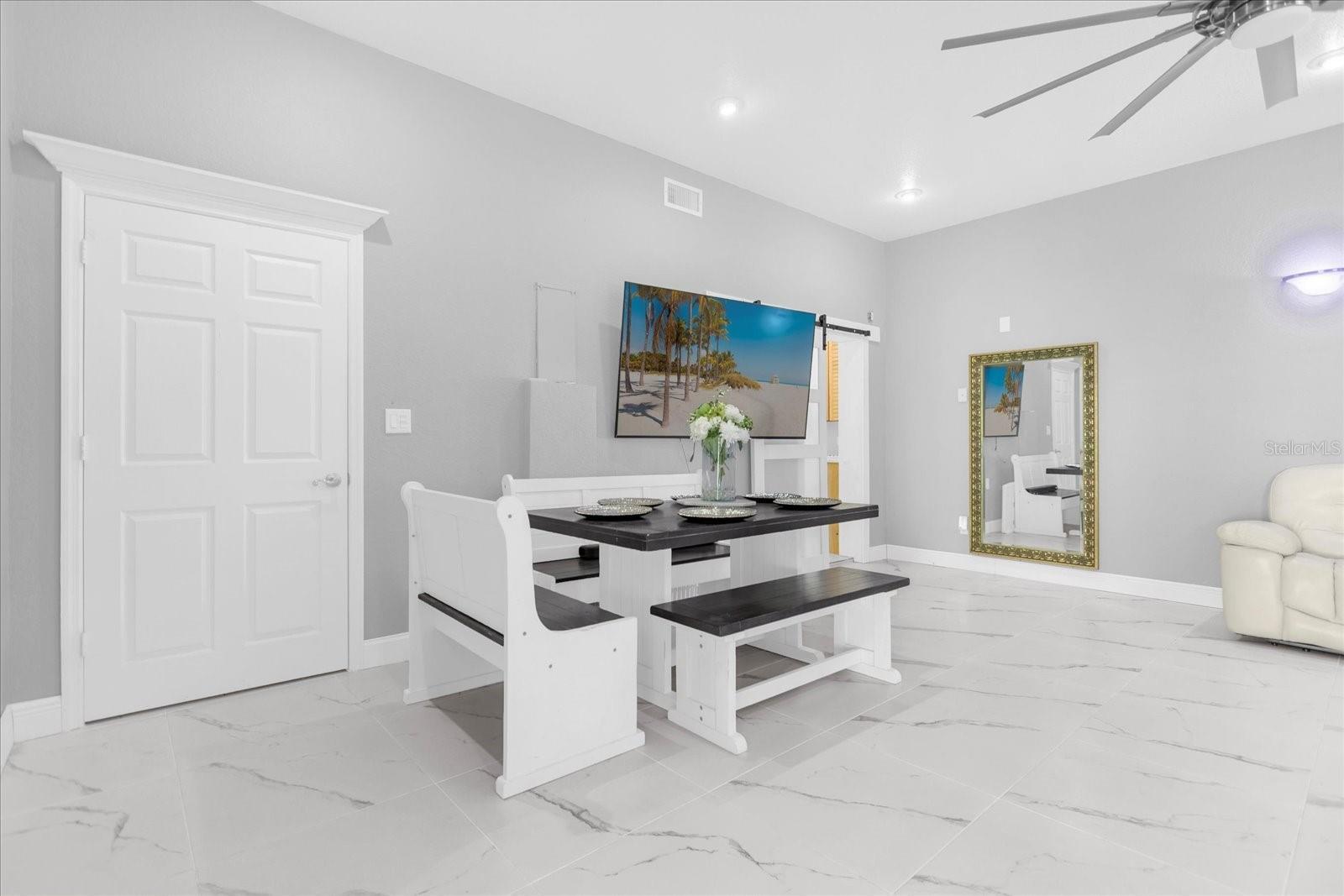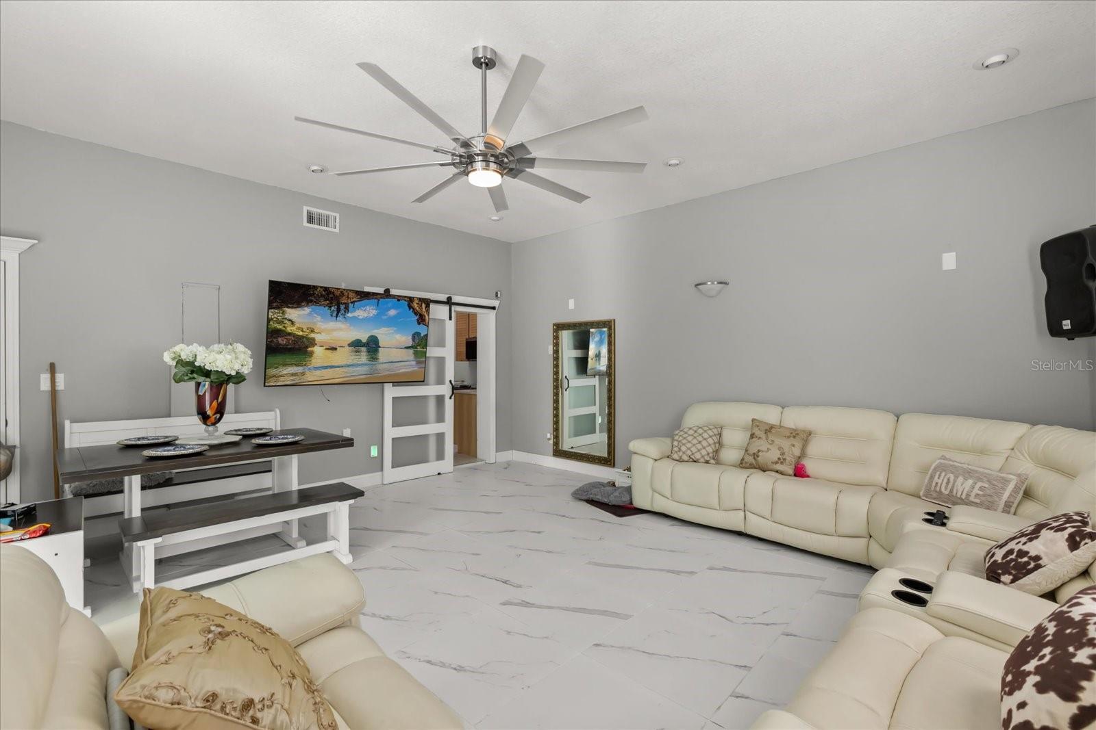 One of a kind fully fenced one-acre estate is just minutes from Lake Nona and all Central Florida has to offer. Ideal for car enthusiasts and hobbyist this home features three garages with six bays, a breezeway workspace for additional vehicles, 50-amp upgraded electric service, compressor lines, and a full bath in one garage that can be utilized as an in-law suite or additional bedroom. Inside, enjoy 3 Bedrooms with family room, dinnin groom and family room, with features such high tin ceilings, crown molding,new tile floors, a built-in wet bar, movie/bonus room pre-wired for surround sound, formal dining, and a spacious kitchen with solid wood cabinets and premium appliances.The private master suite offers sliding doors to a seating area, large walk-in closet, and stylish ensuite bath. The lush grounds include pillar lights, a fire pit, a shed with water system, zoned irrigation on a separate well, and mature fruit trees. 2021 Roof , on septic tank and well.